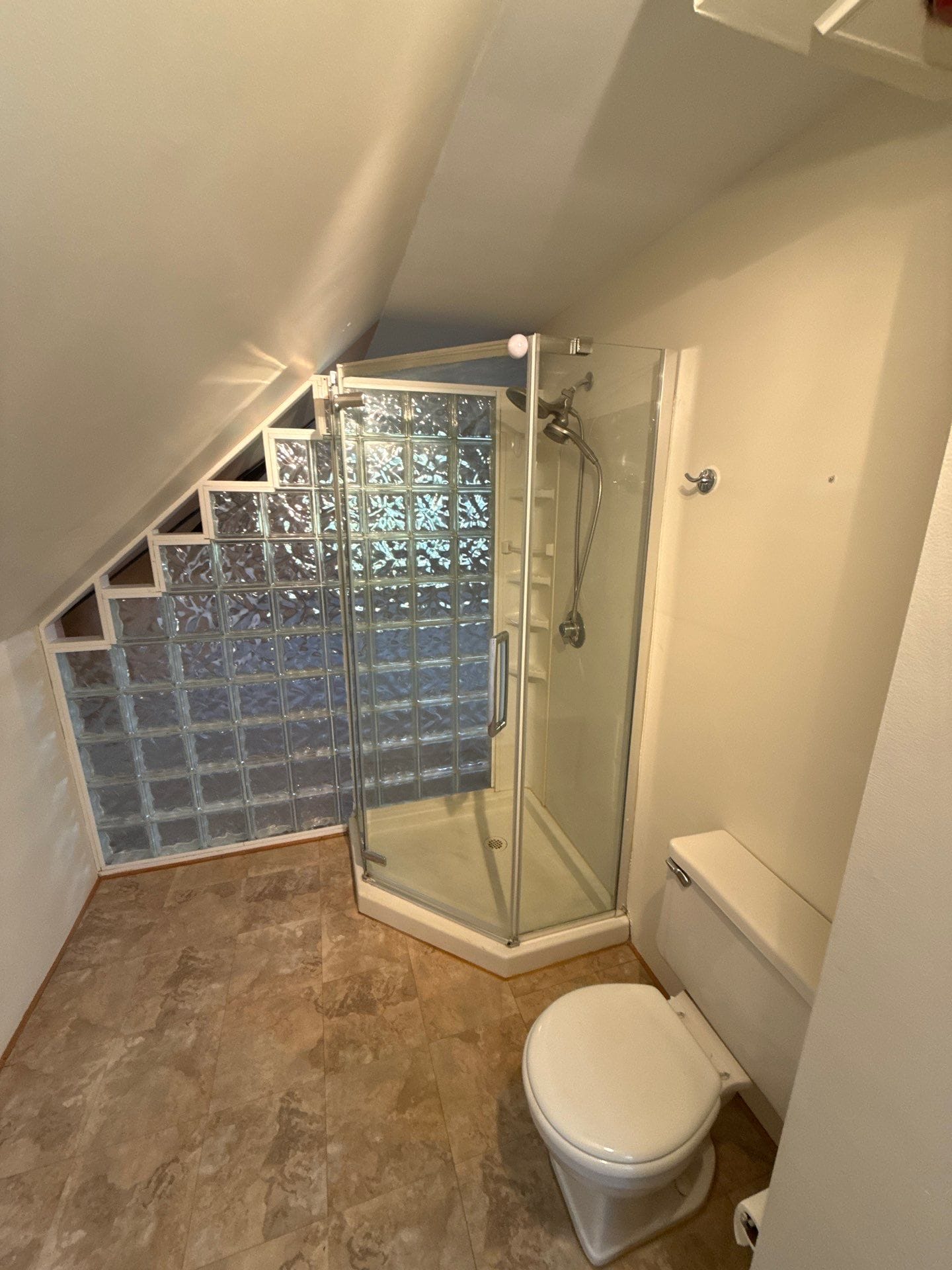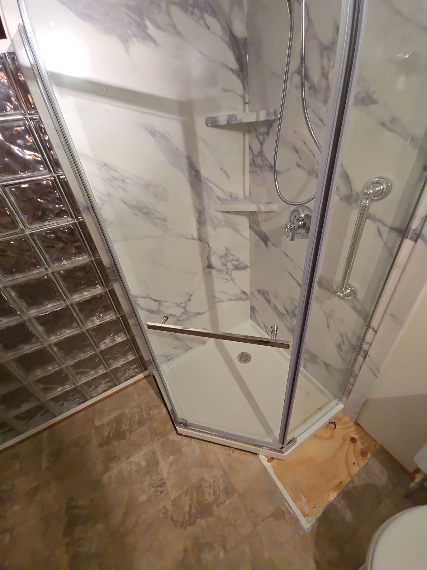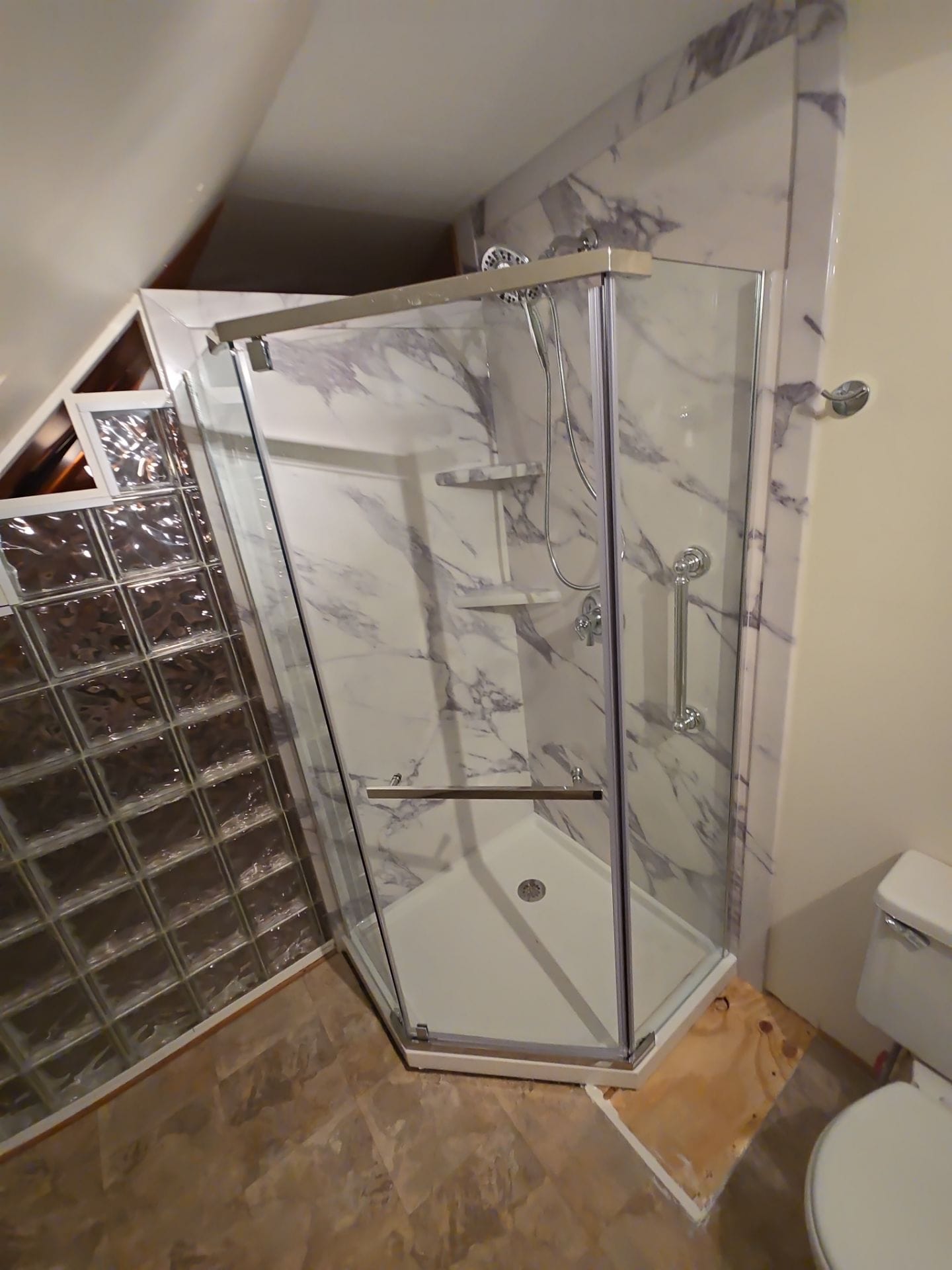 Installation began with a complete demo to the studs and slab base. New waterproof backer boards and PEX-B plumbing were installed behind the scenes. A prefabricated shower pan with a low-profile threshold and centered drain was used to replace the original base. Upgrades included a recessed square niche for product storage and a mounted teakwood fold-down seat. The existing tiled entry surround was removed to allow installation of a frameless, flex-hinge glass door. Chrome grab bars were anchored at two points for safe entry and support while seated. Flooring and toilet areas were protected throughout the multi-day process.