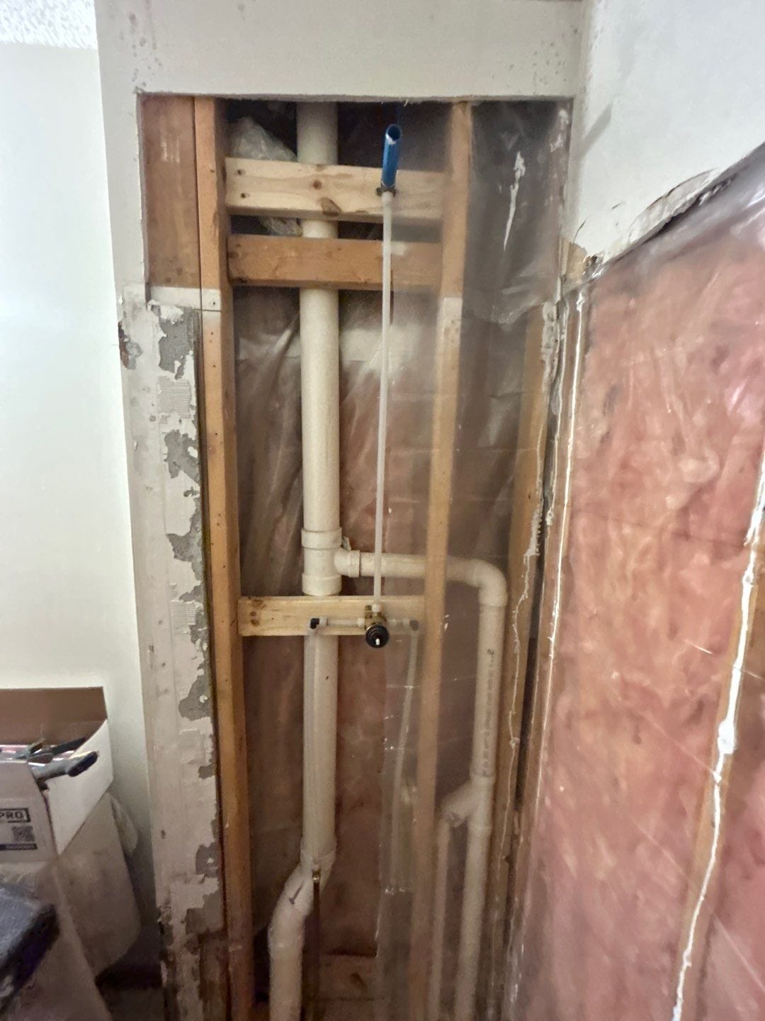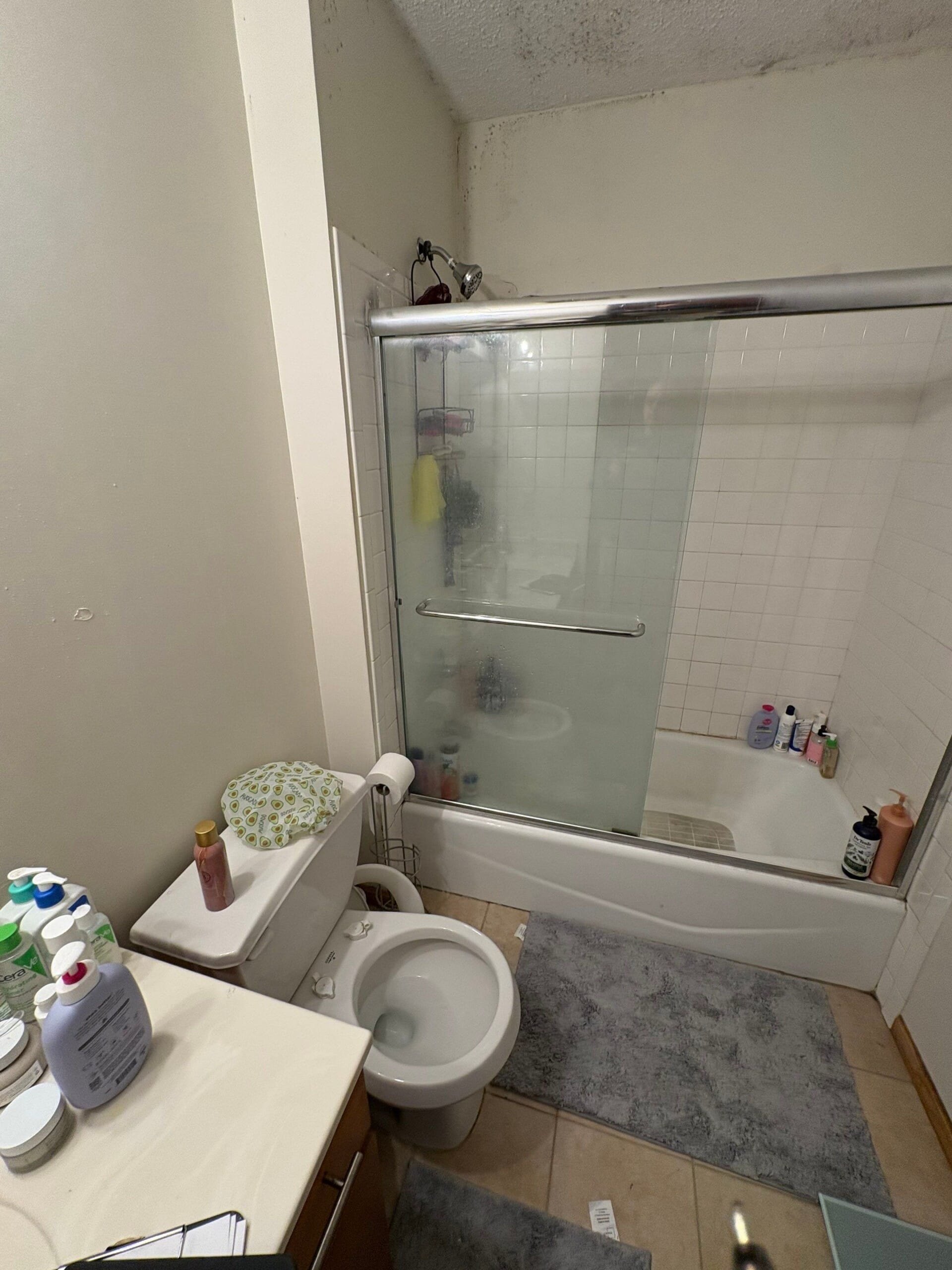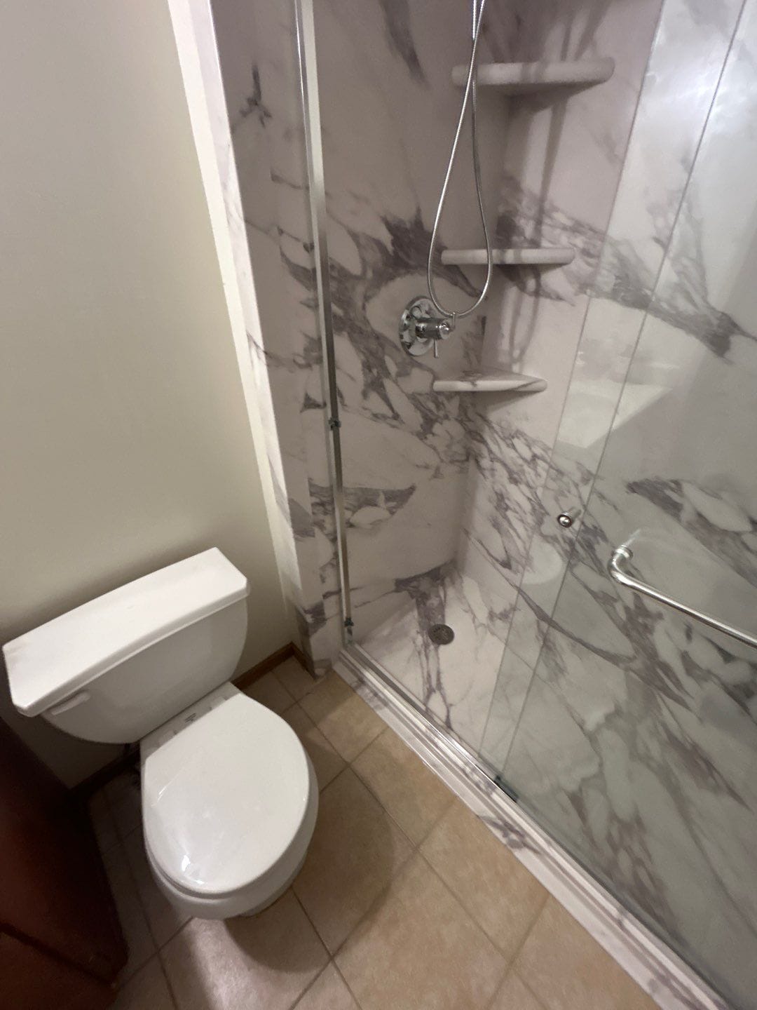 Installation included full demolition of the existing tub, tile, and glass enclosure down to the studs, followed by preparation of a waterproof foundation using a proprietary backer system. Plumbing components were updated, and a low-threshold shower base was installed to improve accessibility. Wall panels were custom-fit and sealed for a watertight finish, and a sliding glass door with an obscure-style finish was installed for privacy. The layout incorporated multiple corner shelves for storage, a vertical grab bar at the entry, and a fold-down wall-mounted seat. The installation was completed within a two to three-day timeframe following final measurement and scheduling.