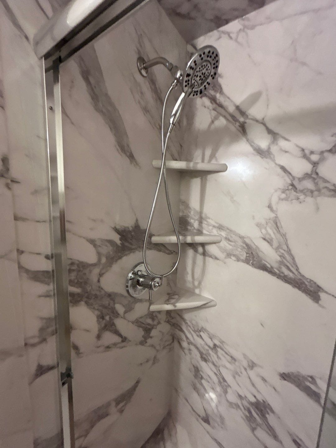 The Representative presented a grout-free composite wall system designed for durability, low maintenance, and long-term performance. A marble-pattern wall finish with bold veining was selected, paired with brushed nickel fixtures to create a cohesive and updated look. The system eliminates grout lines and porous materials, helping reduce upkeep while maintaining a polished appearance. The company’s bathroom-specific focus, use of certified in-house installers, and structured installation approach reinforced reliability and trust in the process.