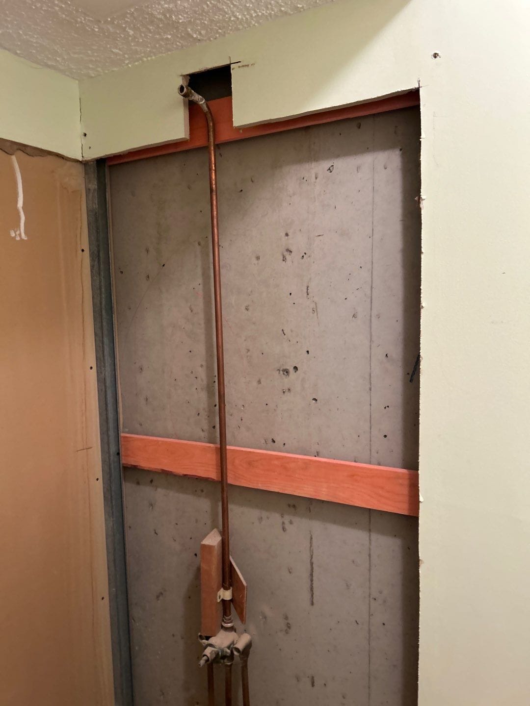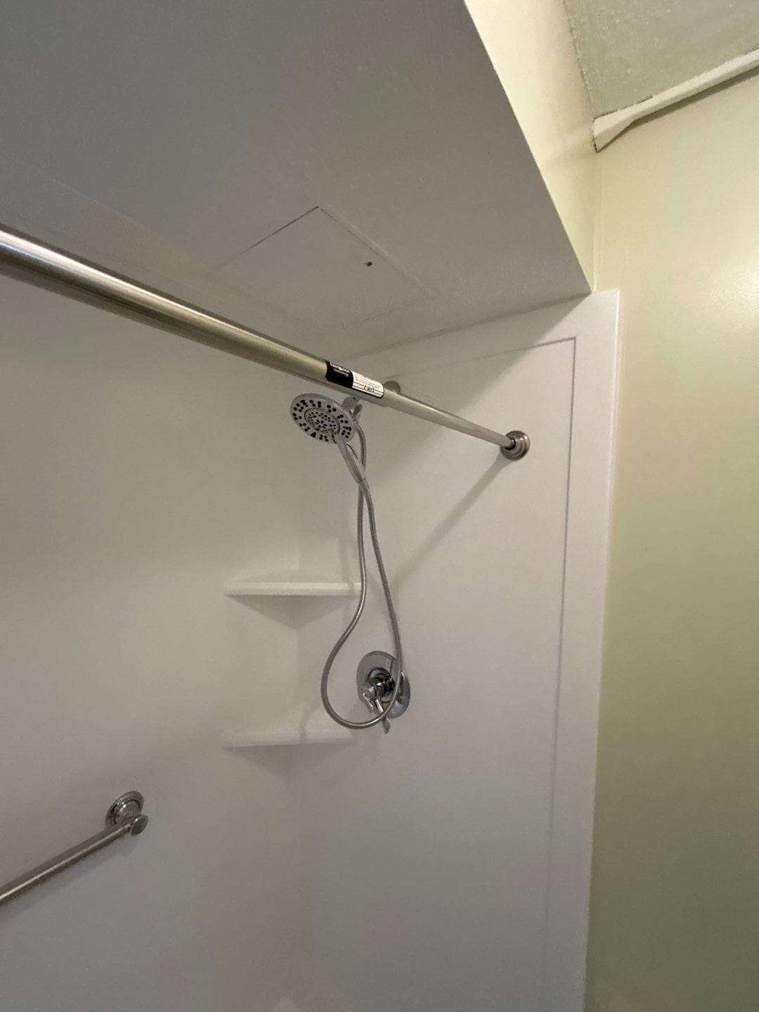 Installation was completed over two days. The original tub and surround were fully removed, and the area was inspected and repaired for moisture-related damage. Technicians installed waterproof wall backing and new smooth composite panels, repositioned shelving to the rear, and mounted a secure grab bar at mid-height. The handheld Delta shower fixture was mounted on a flexible line, offering easy reach and controlled pressure. Crew completed the remodel with full site cleanup and floor protection throughout the process.