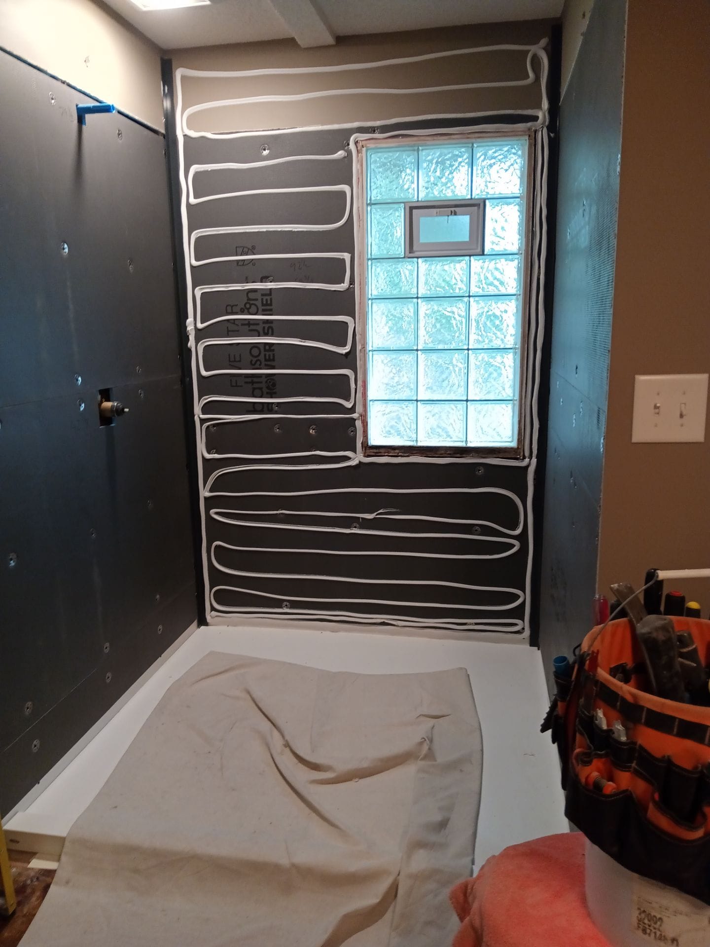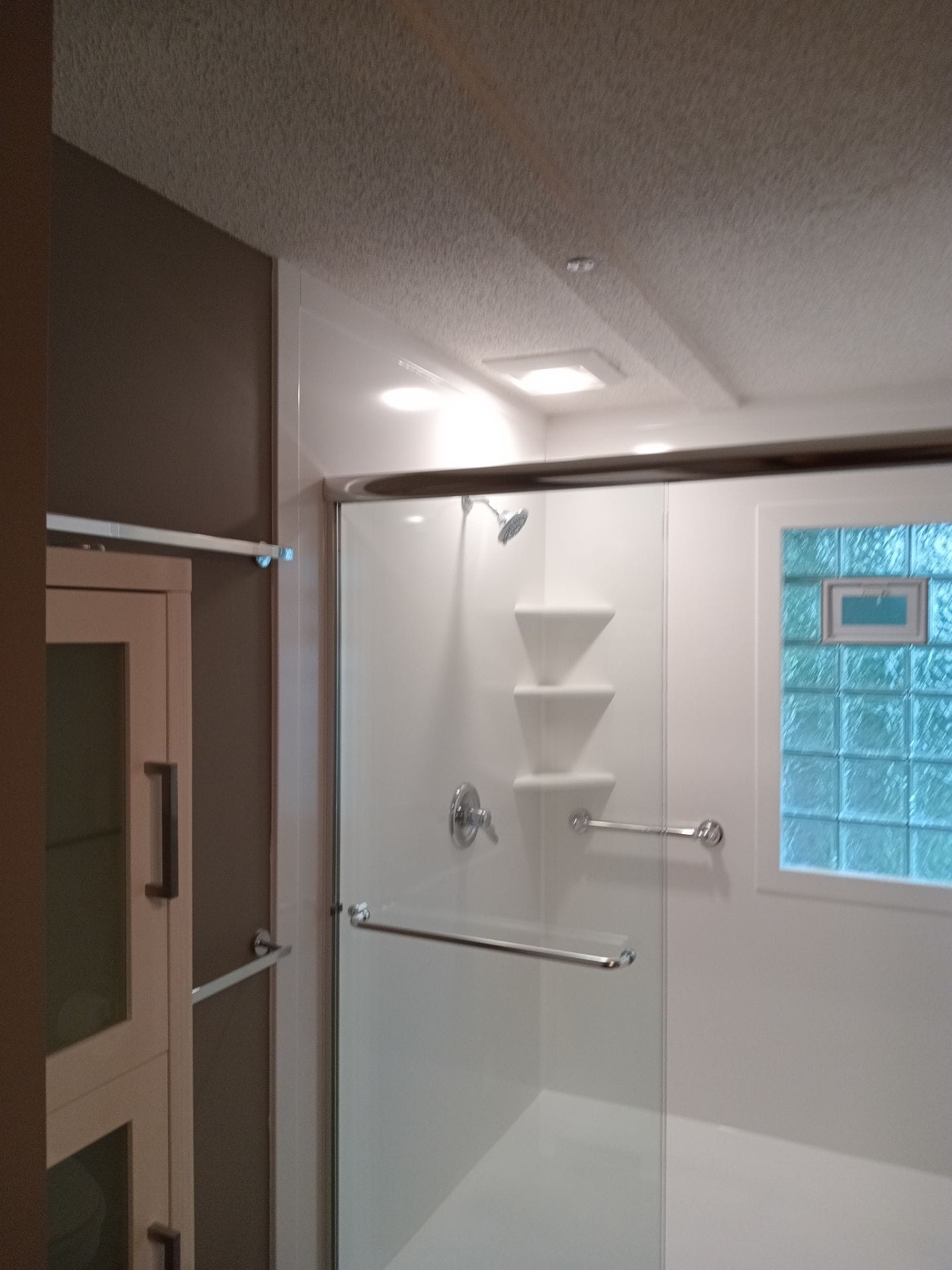 Installation involved full demolition down to the studs, with moisture-resistant dry-lock boards replacing any prior substrate. The new low-entry base was installed to allow safe, step-free entry. Grab bars were placed according to the customer's requests, and a treated glass swing door was installed to provide a balance between access and privacy. Shelving was limited to a trio of built-in corner units for daily items. The original flooring was left intact and fully protected throughout the two-day installation timeline. All measurements and placements were finalized prior to work, ensuring functional use of space without compromising safety.