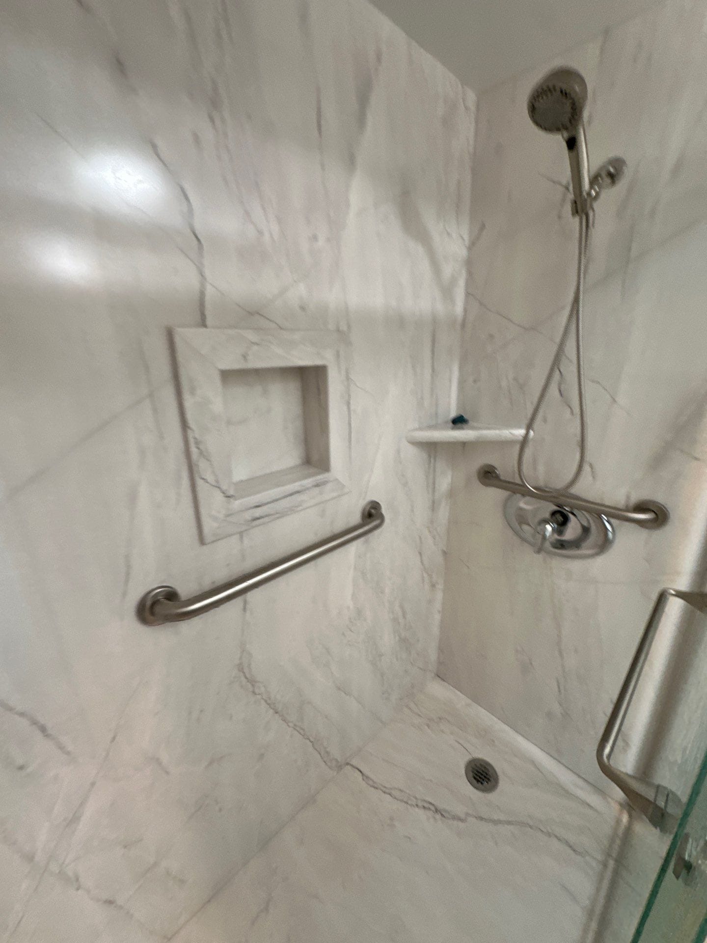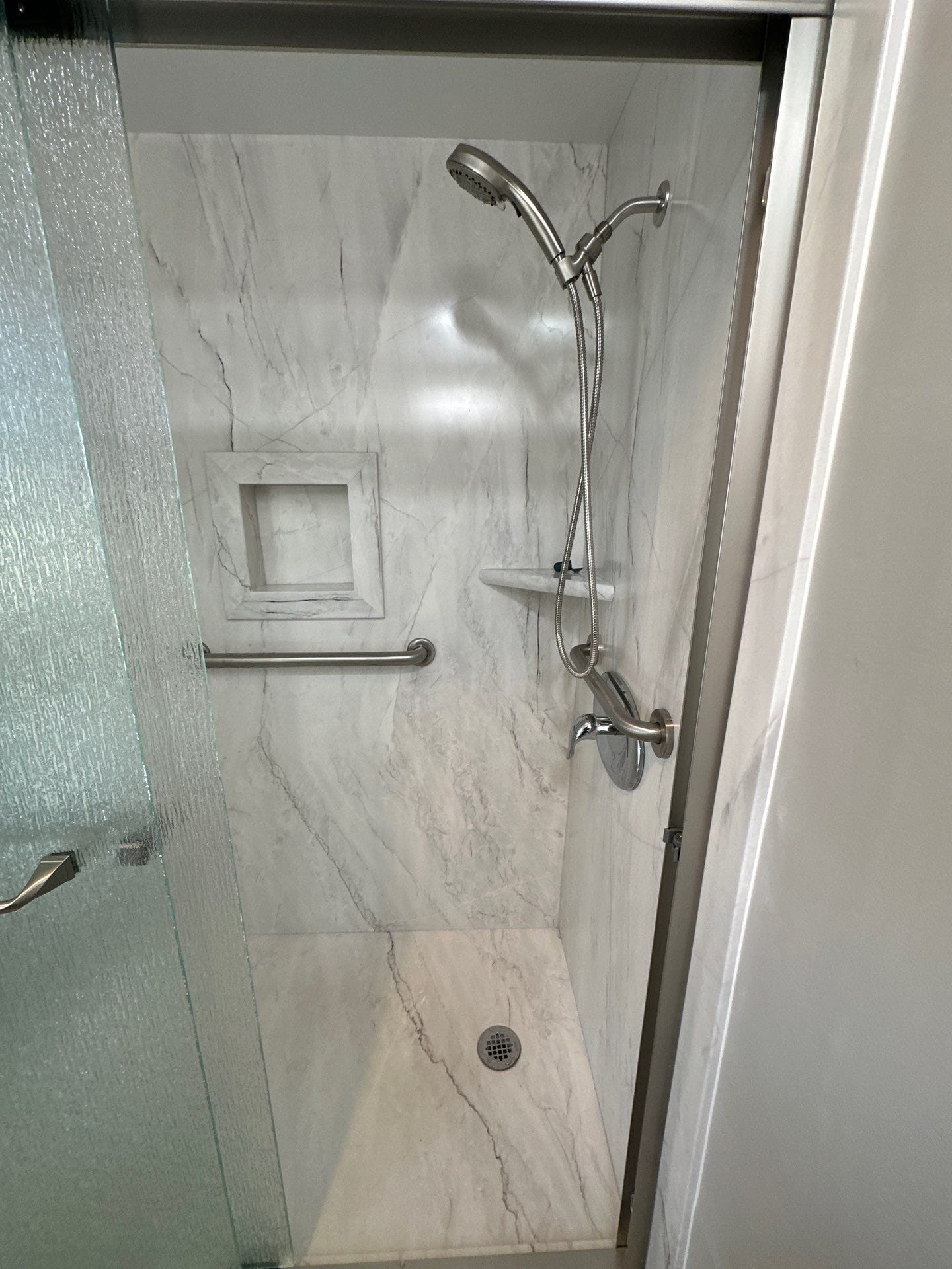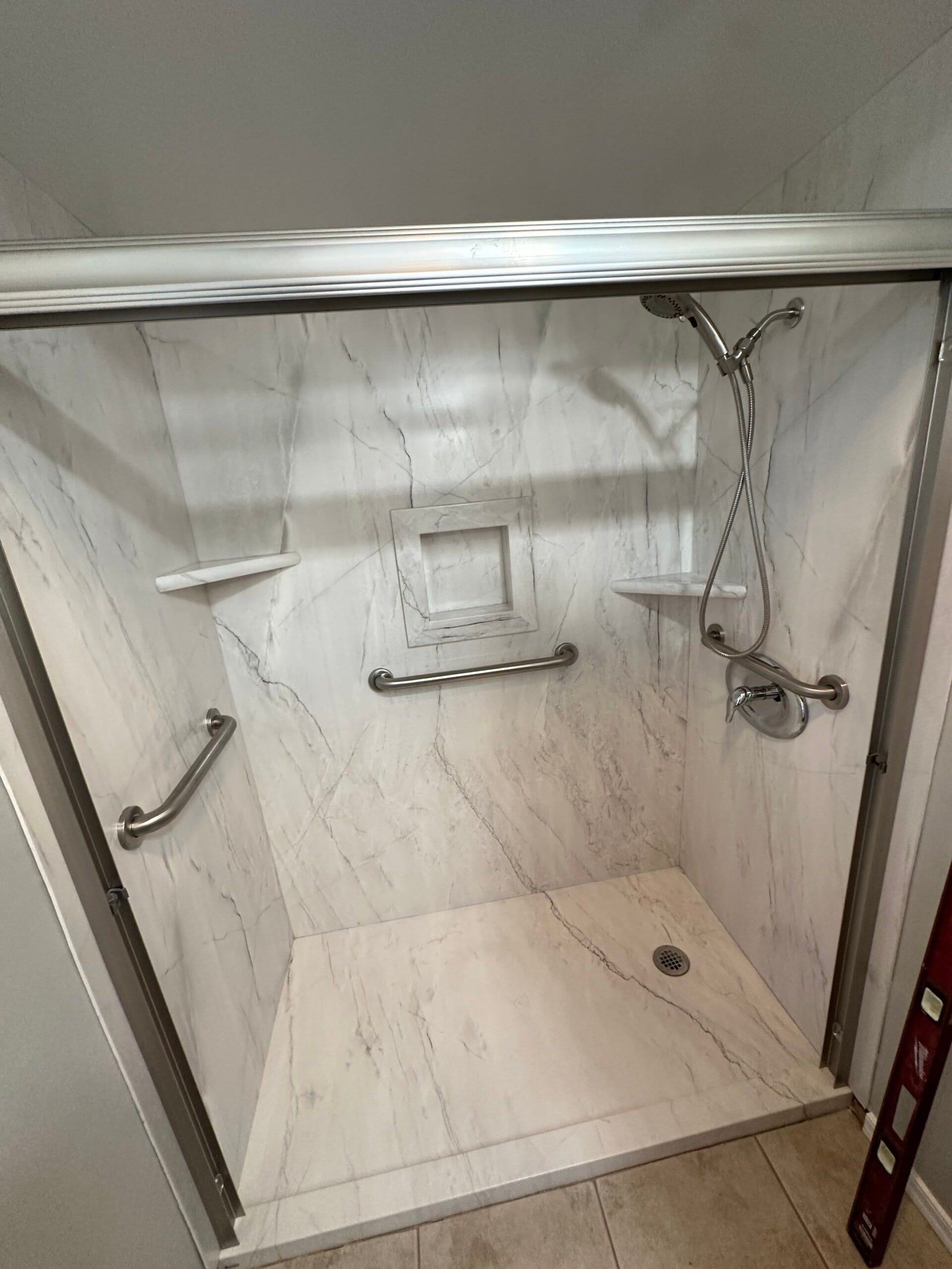 The Five Star Bath Solutions representative introduced the Smart Choice wall system, featuring antimicrobial, non-porous panels backed by waterproof protection and a seamless installation method. Unlike conventional tile, this system eliminates grout lines, reducing mold risk and simplifying upkeep. The wall panels chosen for this project mimicked the look of white-veined stone, creating a bright, spa-like appearance. The customer selected brushed nickel fixtures, including a handheld wand and matching grab bars, while two integrated corner shelves and a recessed shampoo niche provided accessible storage within the waterproof layout.