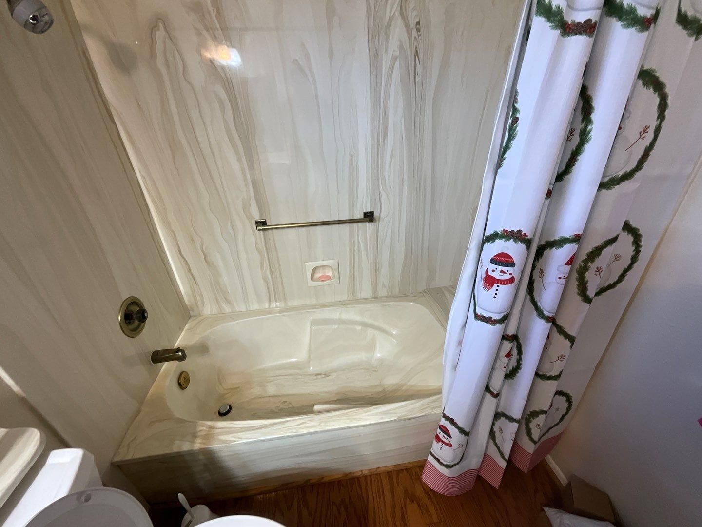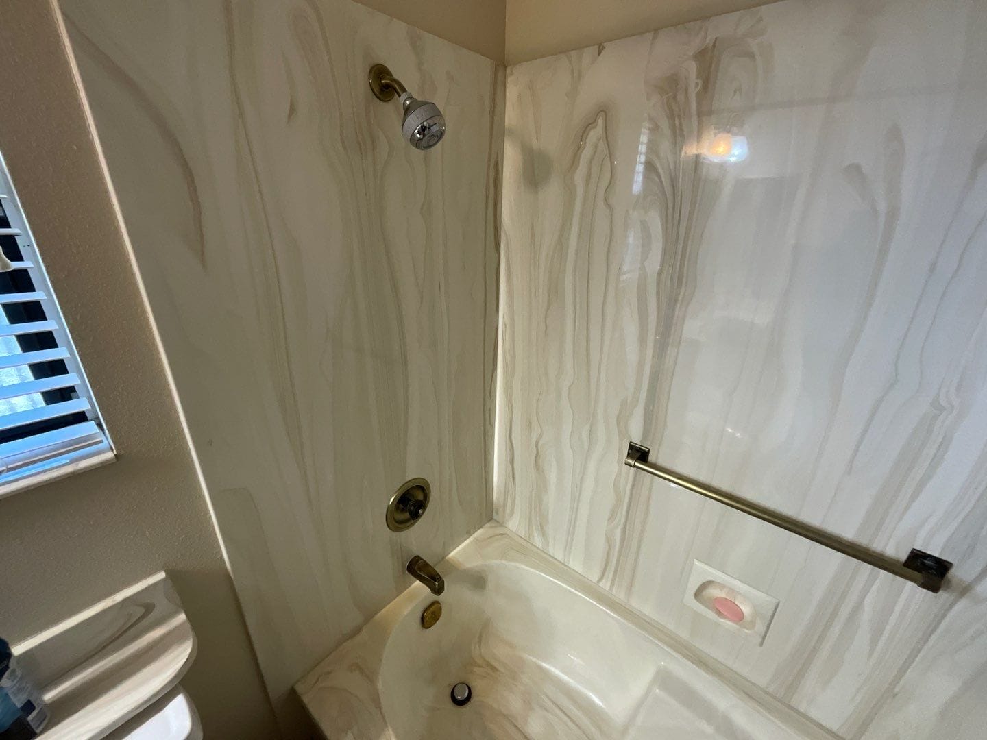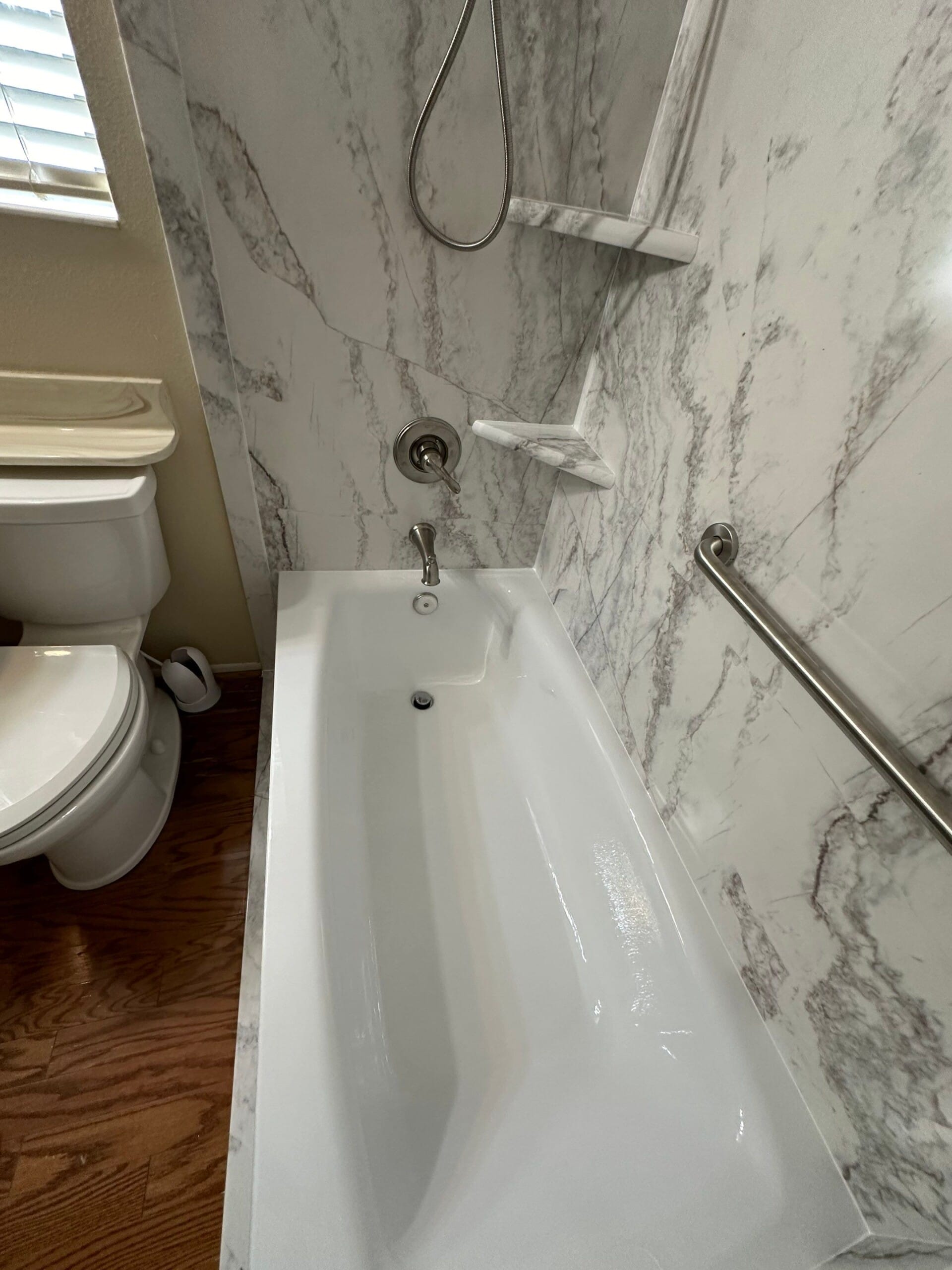 Installation involved the complete removal of the original acrylic tub surround and fixtures, followed by thorough structural inspection and any necessary remediation. The new white acrylic tub was installed alongside solid Delta plumbing components and a newly anchored support bench integrated into the right-hand wall panel. Panels were sealed with 100% silicone-free thermal expansion compound, creating a watertight and maintenance-free enclosure. The updated tub and wall area were completed within one working day, with all debris hauled off-site and surrounding surfaces protected throughout the process.