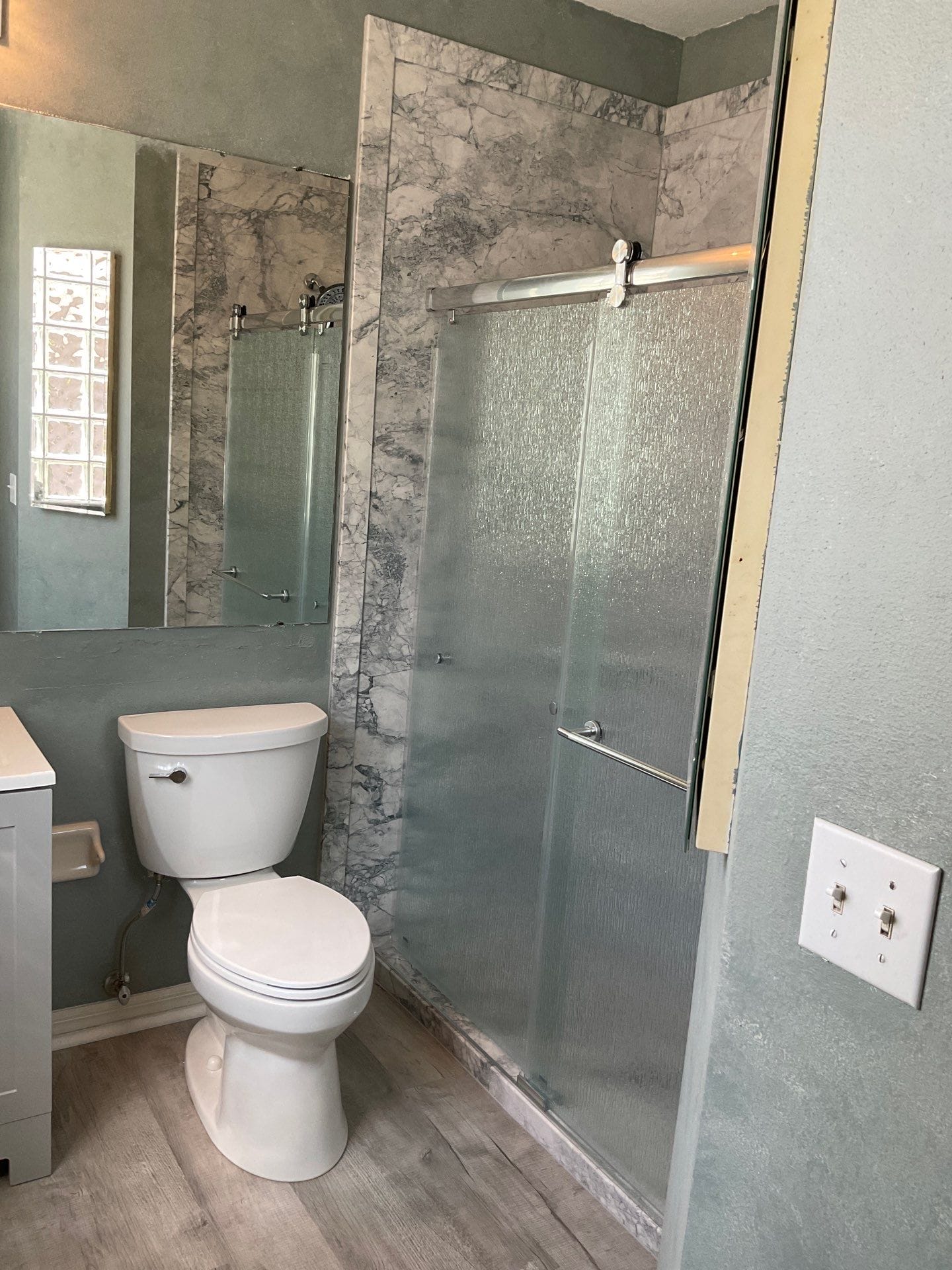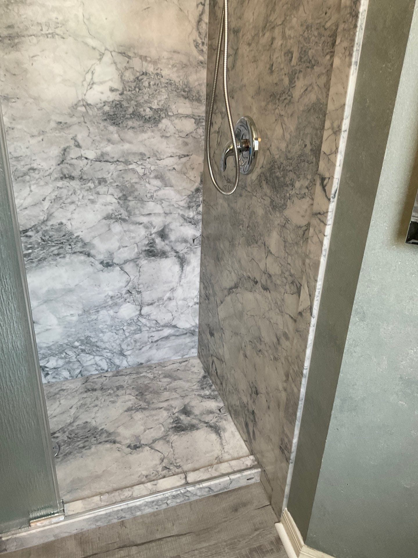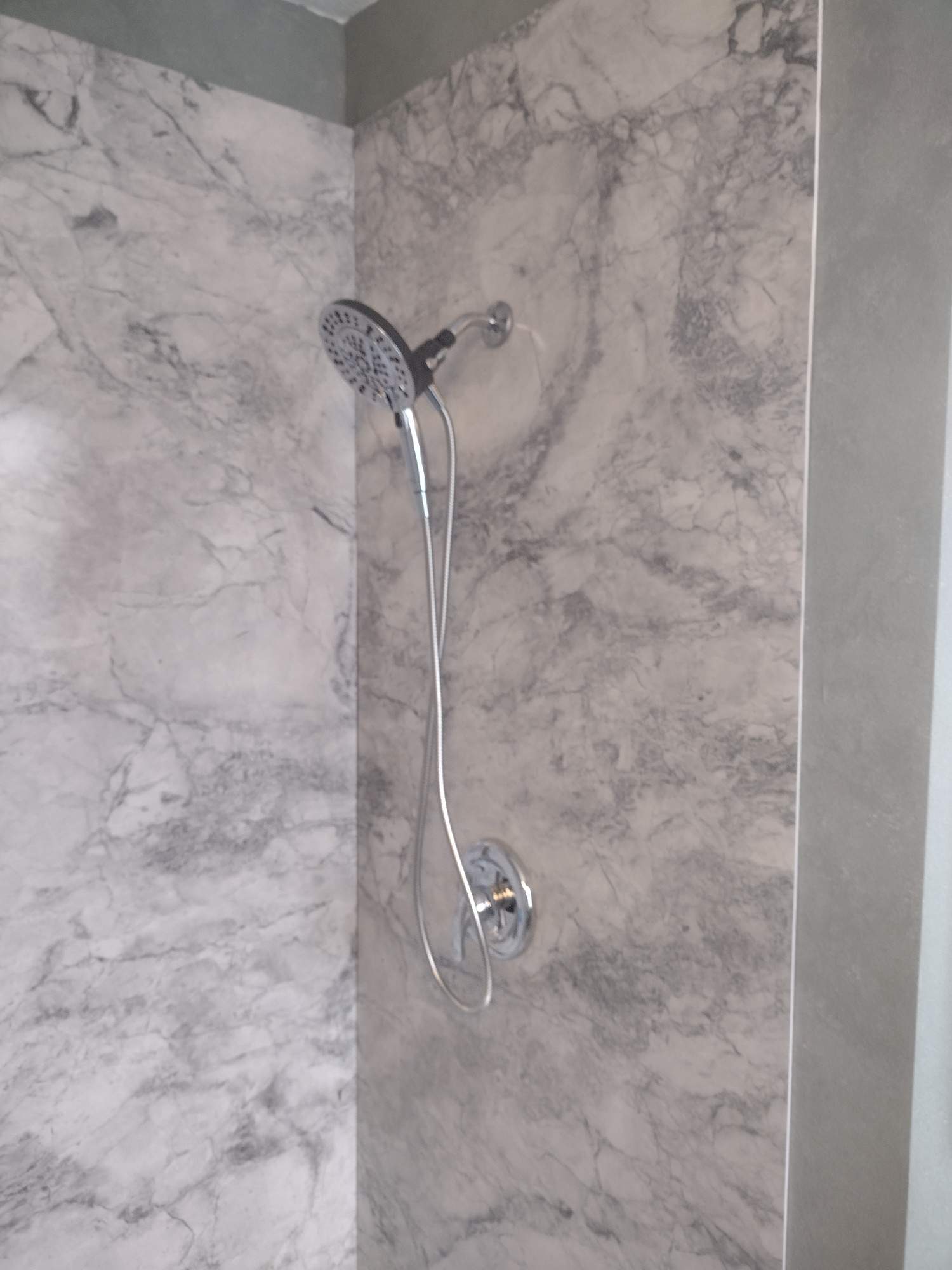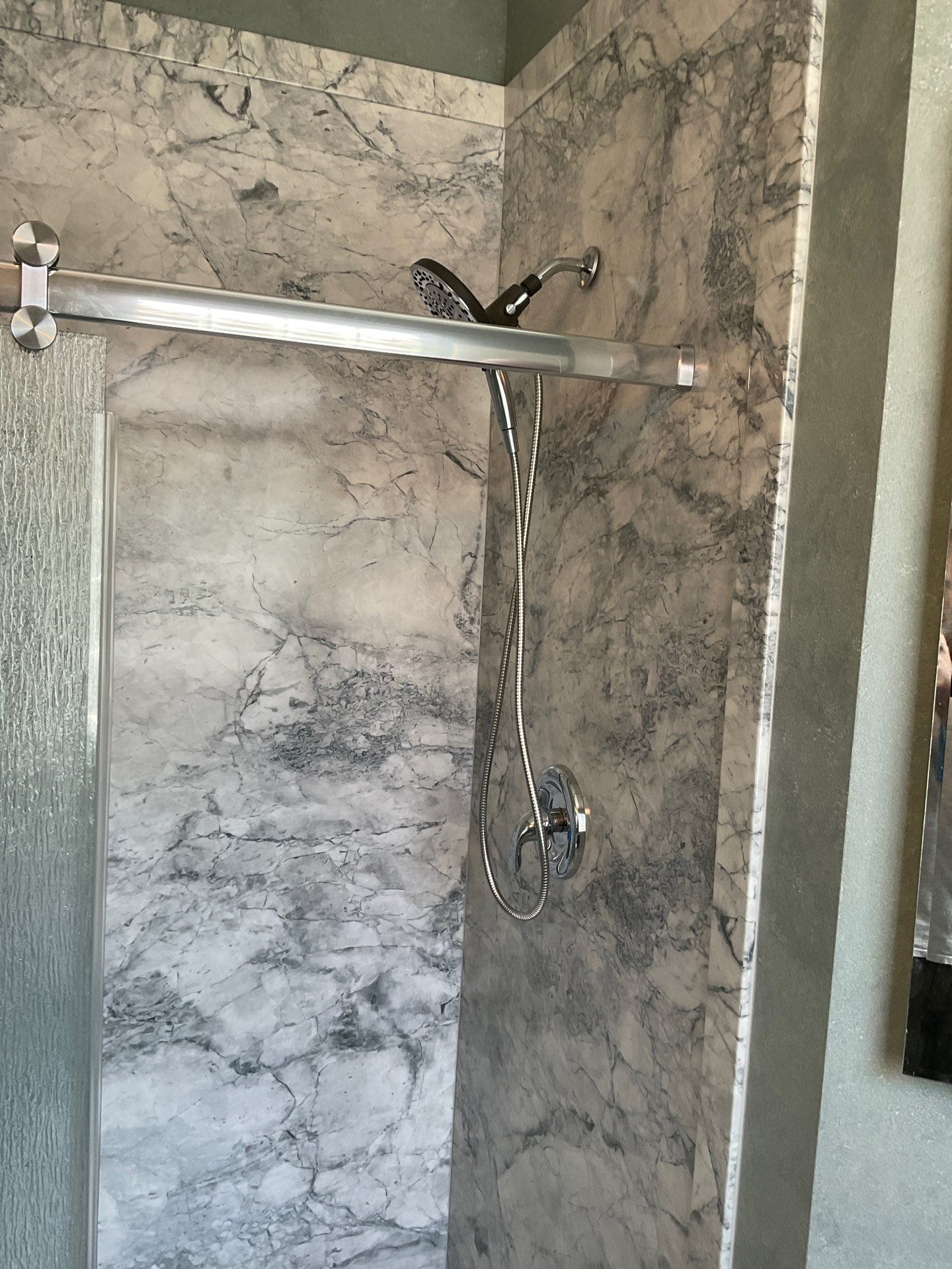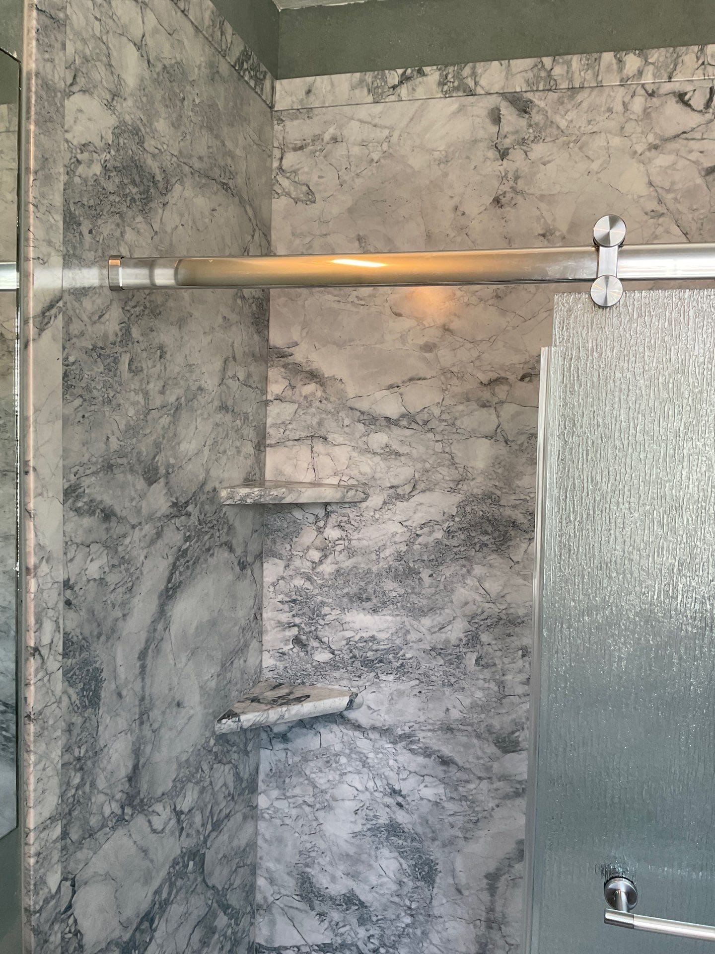 Brushed nickel fixtures were selected to complement existing hardware. Frosted sliding glass doors replaced the curtain to improve enclosure and water retention. Two corner shelves were integrated into the design for streamlined storage without clutter. The customer-approved wall panels feature a gray stone aesthetic with natural veining, aligned to match the room’s color palette while maintaining a high-end appearance. The teak fold-down seat mentioned in the review was not installed and is excluded from the final layout.