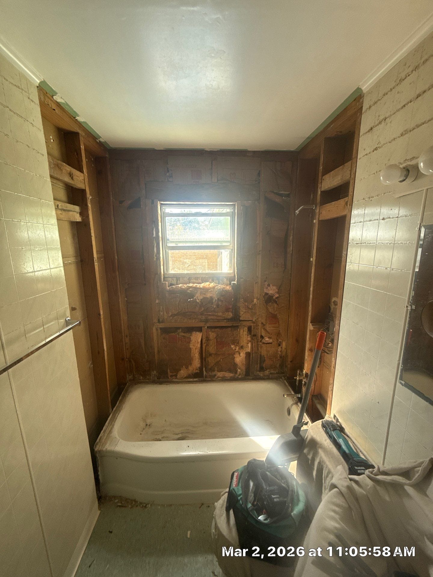 Installation began with removal of the original fiberglass unit and surrounding materials down to the framing. The installation team inspected the structure, installed a waterproof backing system, and positioned the new bathtub within the existing alcove. Composite wall panels were then installed and sealed to create a continuous water resistant enclosure around the tub area. Plumbing fixtures, shelves, and the grab bar were mounted and aligned during the final stage of installation. Protective measures and jobsite cleanup were maintained throughout the project and the installation was completed within a one to two day installation window once materials were prepared.