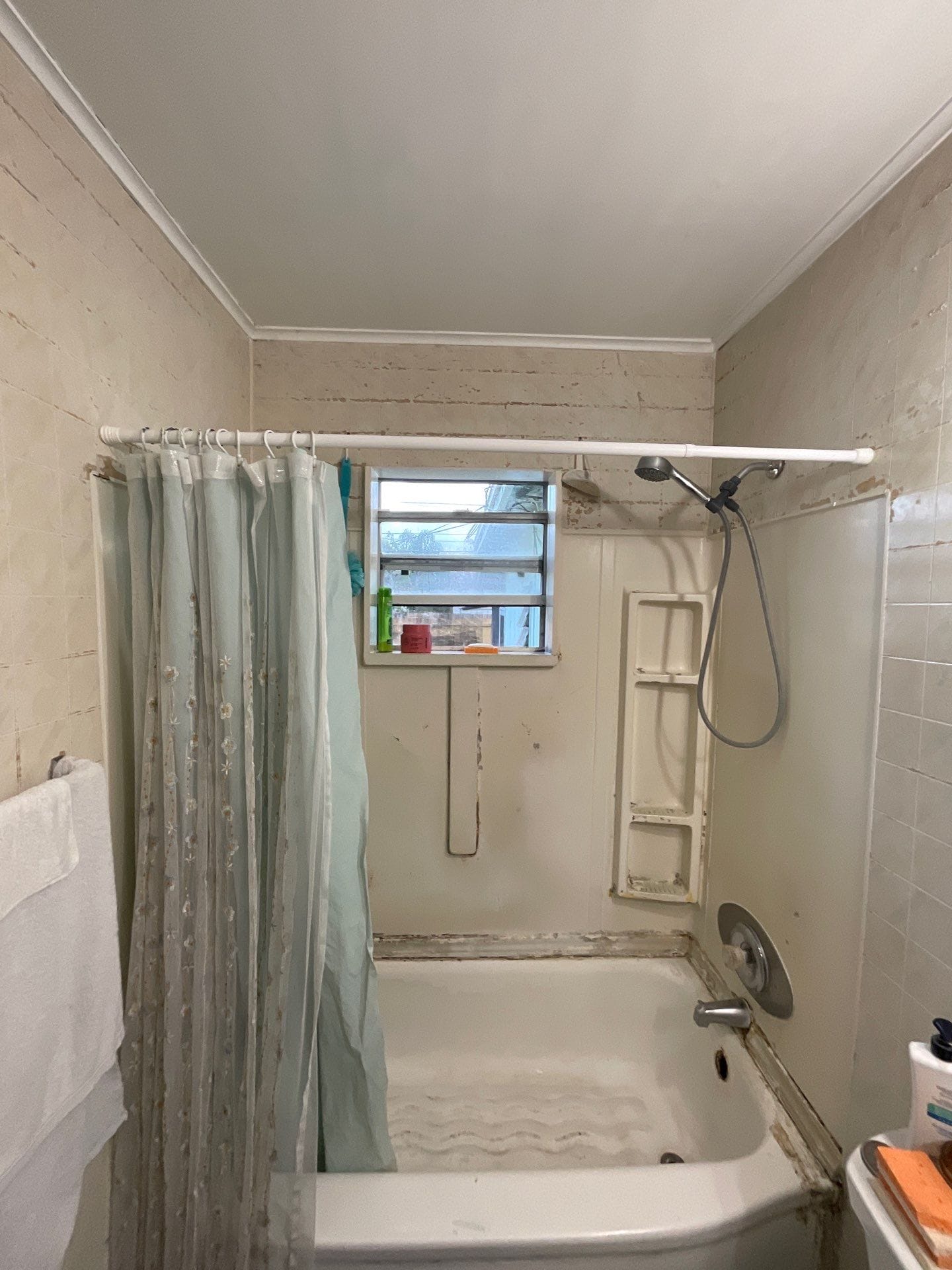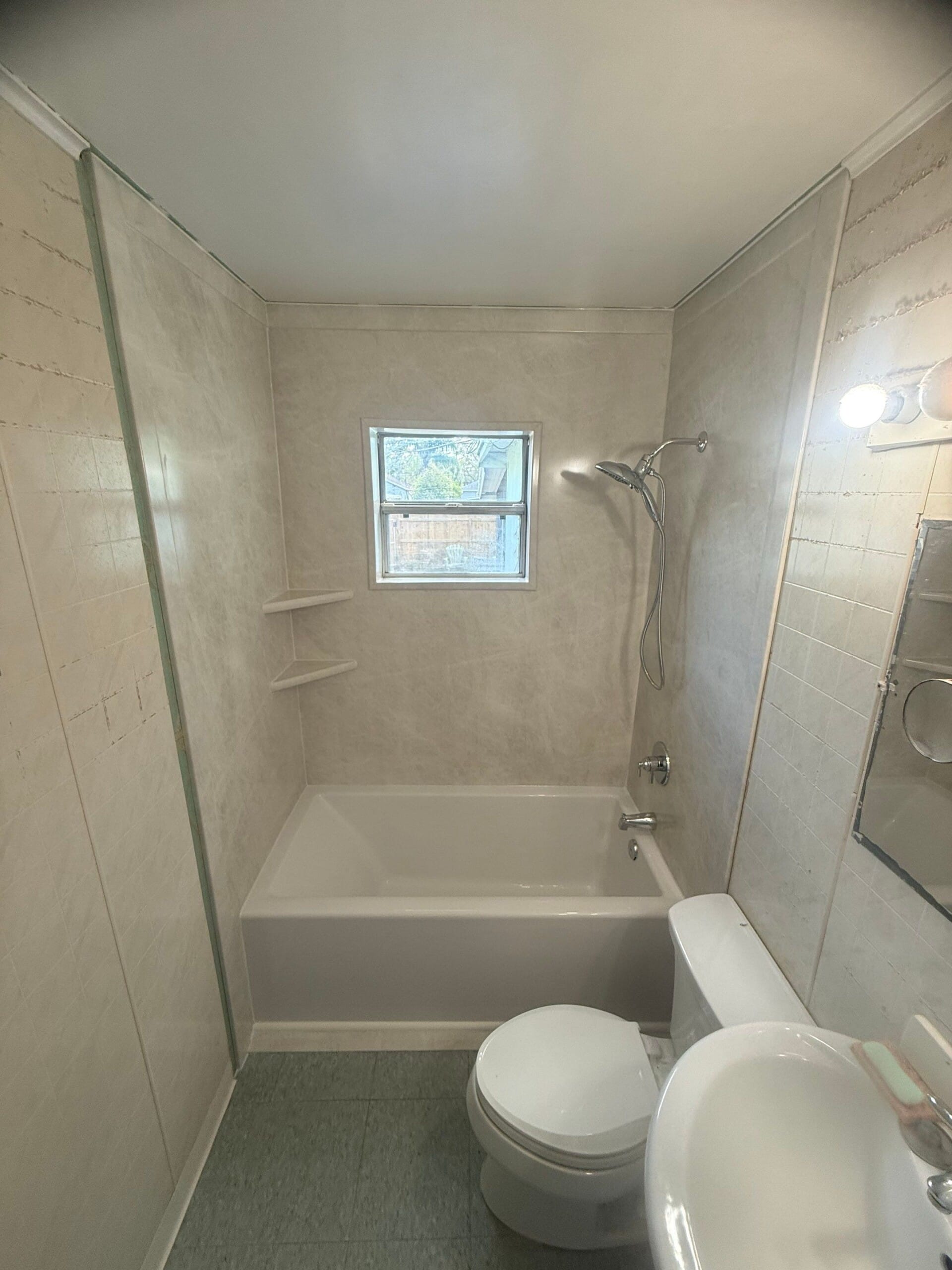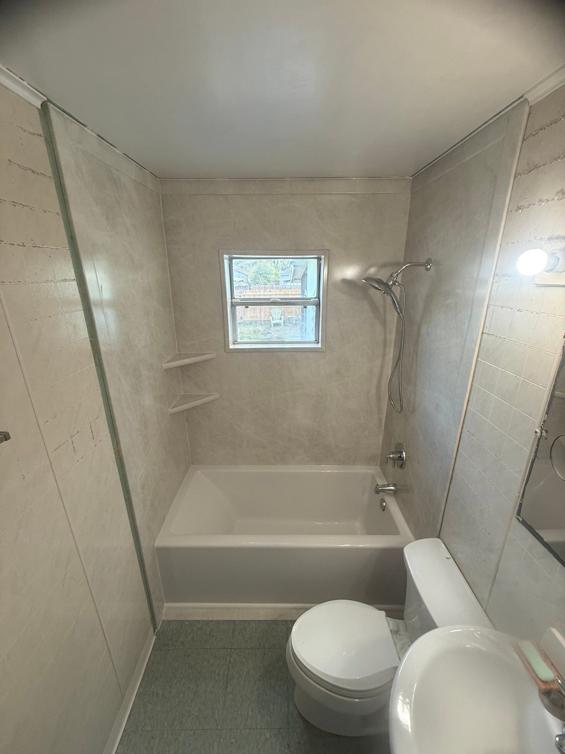 The Five Star Bath Solutions Representative presented a grout free composite wall system designed to deliver a seamless, low maintenance bathing environment. The selected wall panels feature a light stone inspired pattern that brightens the space while eliminating grout lines and simplifying long term care. Brushed nickel plumbing fixtures were installed, including a handheld shower system with integrated controls. Built in corner shelves provide convenient storage while maintaining a clean appearance, and a reinforced grab bar was incorporated along the wall to provide added stability and support. The design preserved the bathtub configuration while introducing updated materials and a more refined overall finish.