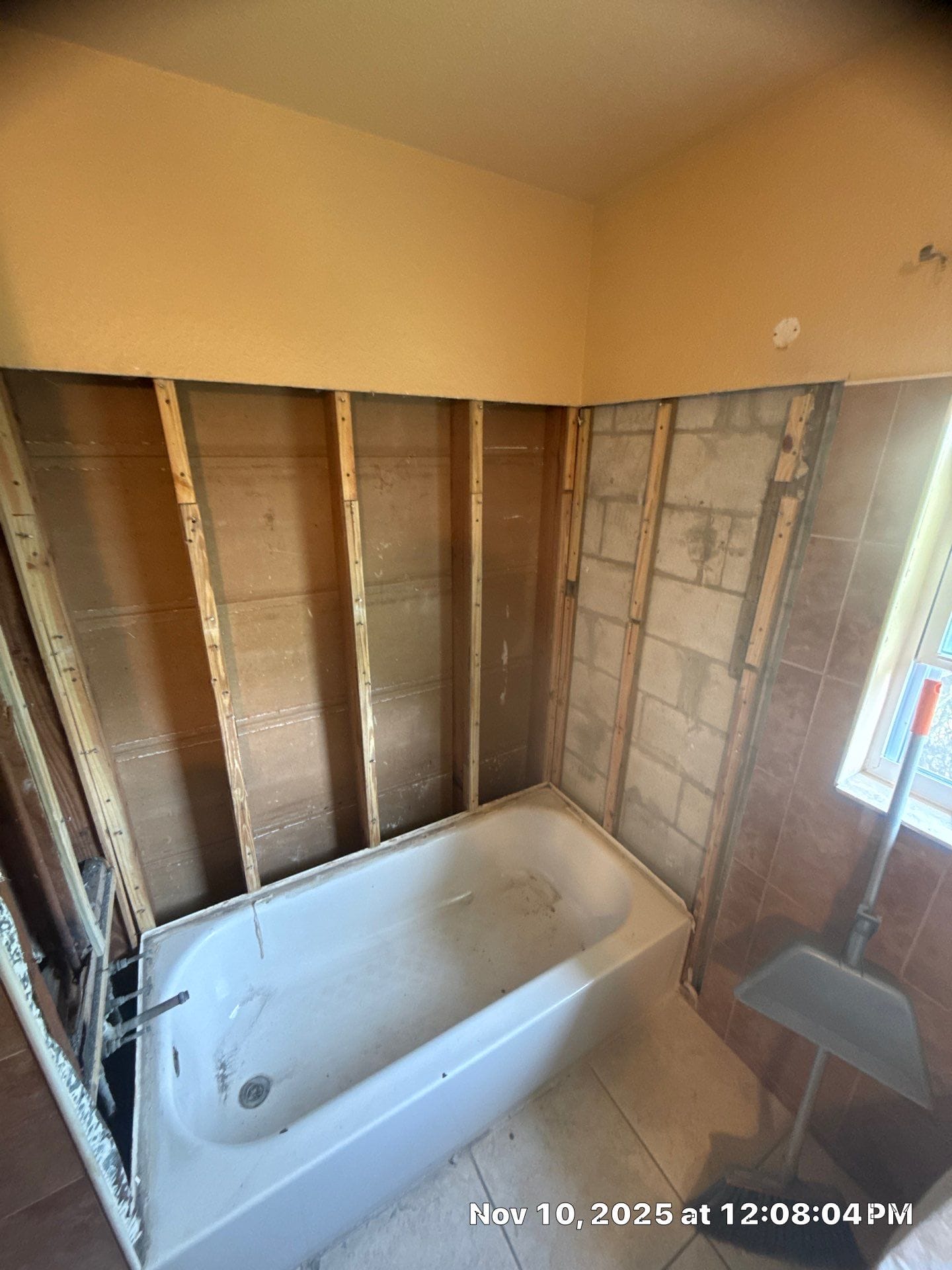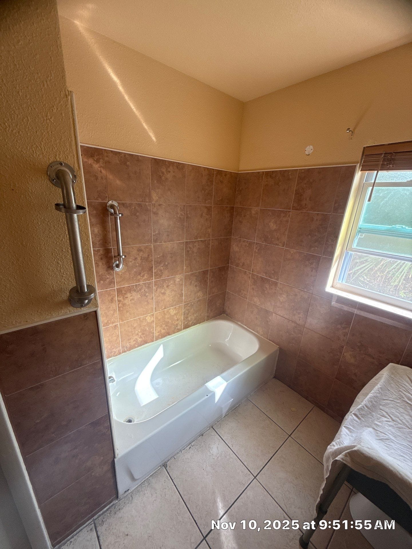 The remodel involved full tub and tile removal, subwall inspection, and preparation for a new low-threshold shower base. Drain placement was preserved, and plumbing access remained consistent with the original layout. Seamless marble-style panels were installed alongside safety upgrades including a wall-mounted teak seat, two secure grab bars, and a handheld shower system. While the customer initially requested a fixed glass panel, the final result showed a return to a straight curtain rod, likely for practical or comfort reasons. The project was completed within two days, with no disruption to surrounding tile areas.