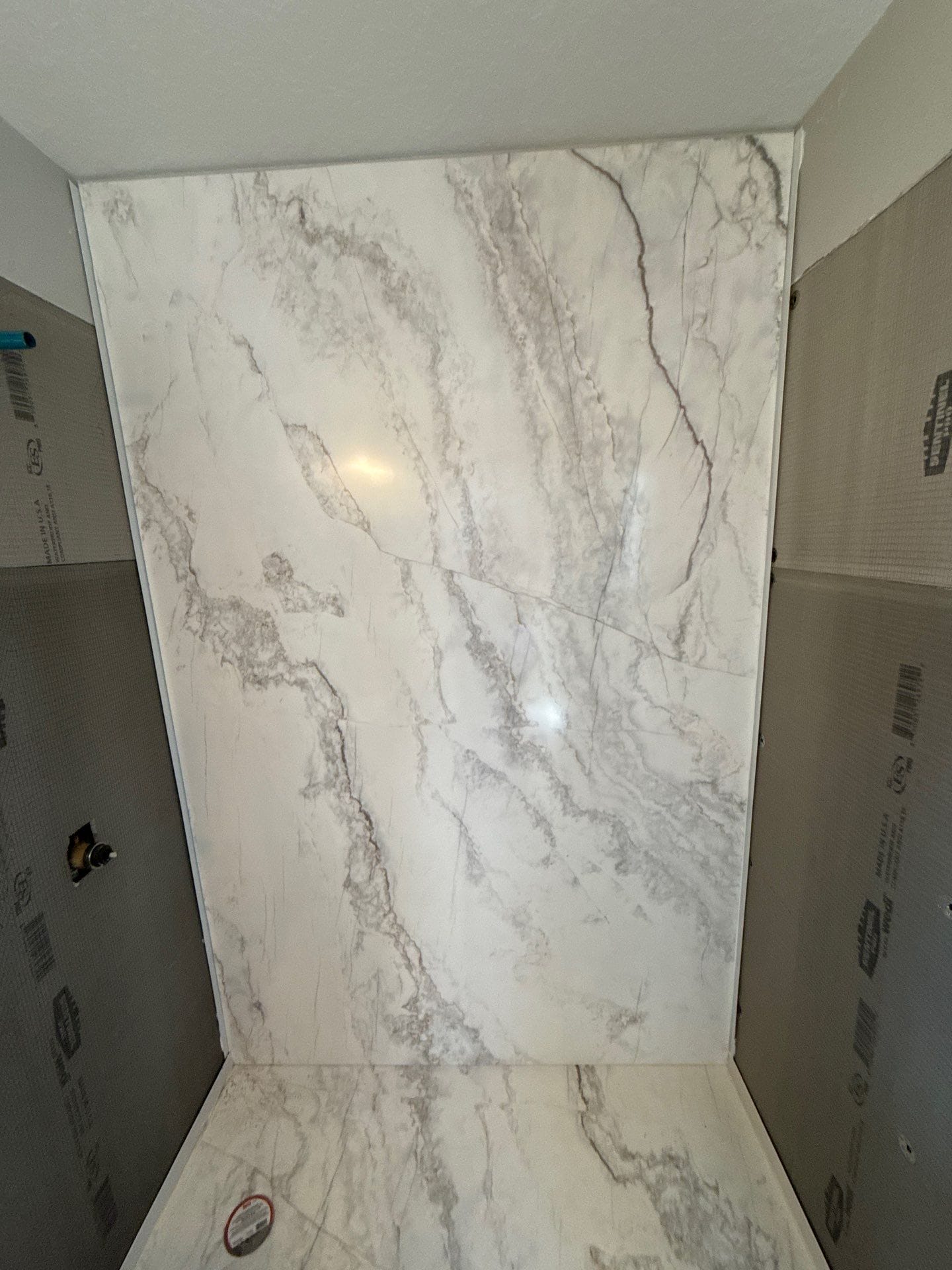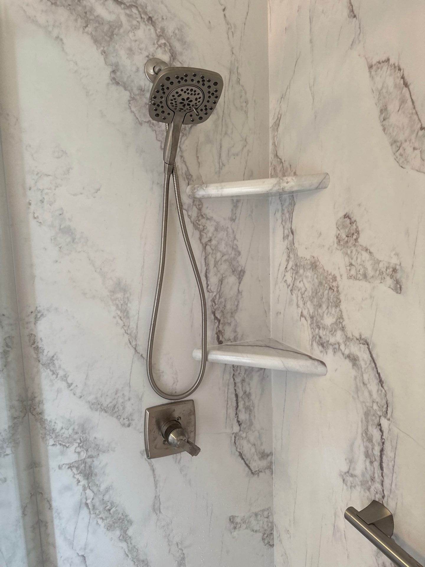 The installation team began by carefully removing the tub and tile surround, inspecting the subfloor and plumbing to ensure structural readiness. No external waste bins were required, and all demolition debris was cleared in-house. A new waterproof Shower Shield backer was installed before the marble-look composite panels were secured in place. Grab bars were anchored into studs, and a single corner shelf was mounted as requested. The glass sliding door, contrary to the customer’s original curtain preference, was ultimately chosen to complement the contemporary look. The entire project was completed within one working day.