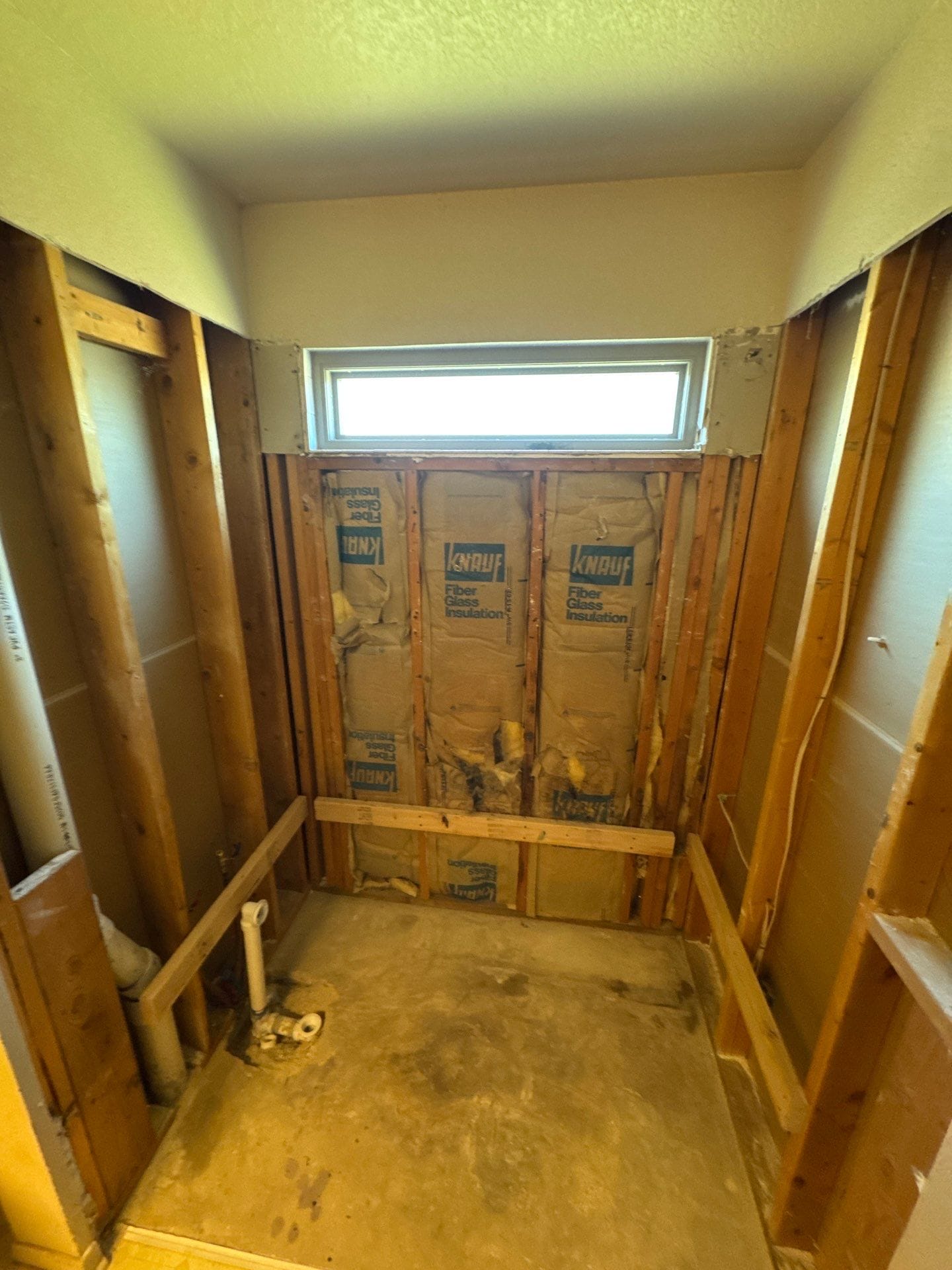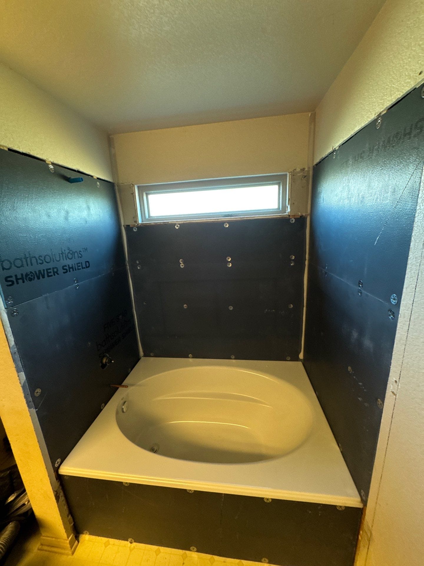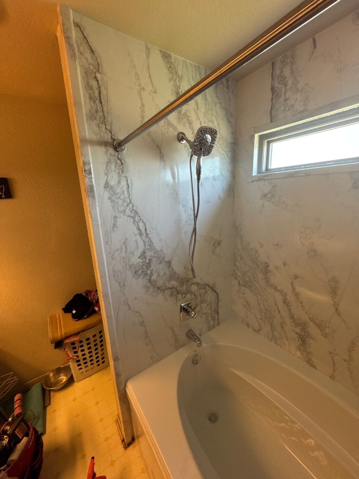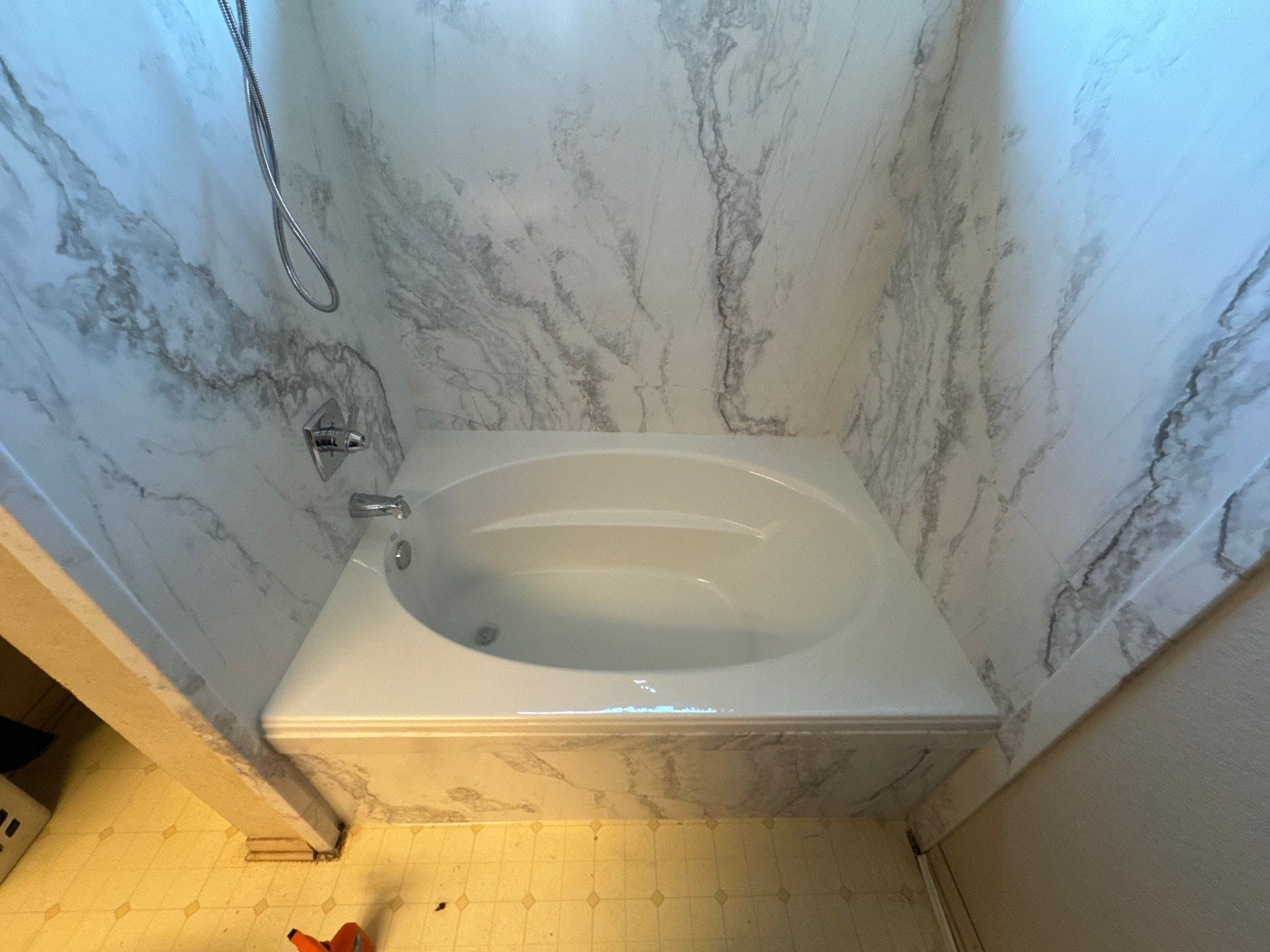 Installation included removal of the original tile surround and existing tub down to the framing. Wall areas were repaired and properly prepared before installing a waterproof backer system. The new bathtub was set securely in place, followed by installation of the grout free marble look wall panels, updated plumbing trim, and shower rod. All materials were sealed and finished for a clean transition at the window and surrounding drywall. The renovation was completed efficiently, typically within one to two days depending on site conditions, with debris removed and the work area contained during the process.