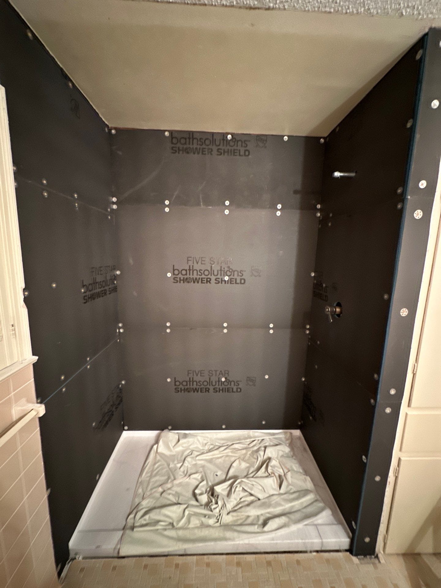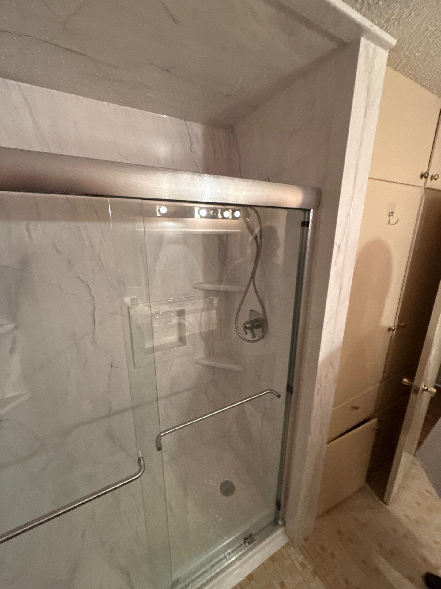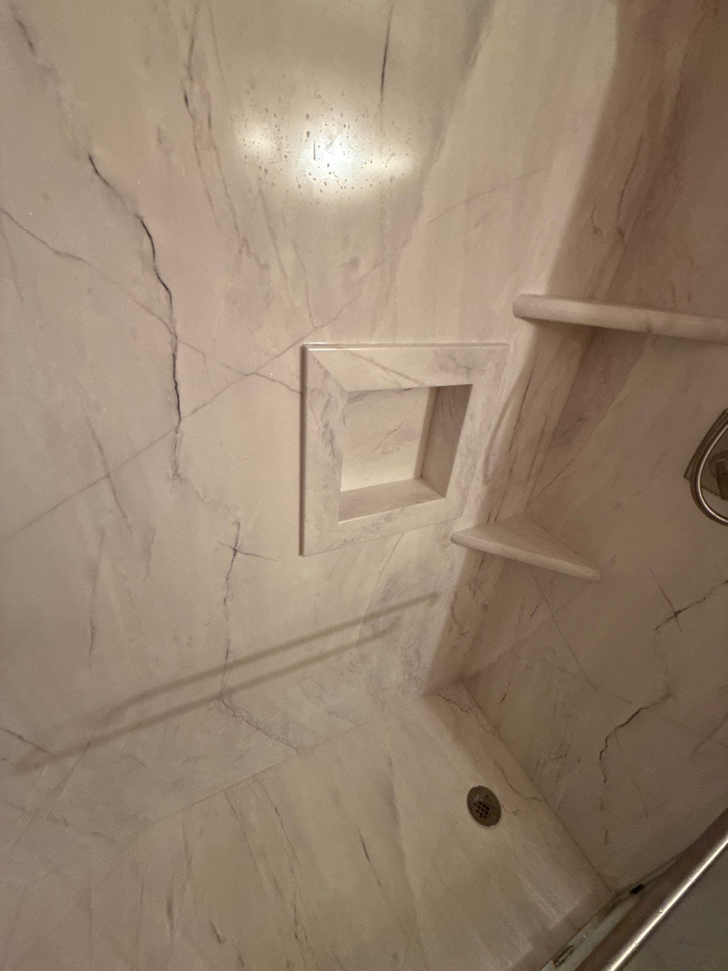 Installation involved a full demolition down to the studs to address plumbing and structural needs. The crew installed a walk-in shower system featuring Calacatta White wall panels with a smooth, marble-like appearance. The setup included a sliding barn-style glass door with brushed metal hardware, matching shower fixtures, corner shelves, a recessed storage niche, and strategically placed safety grab bars. The project was completed efficiently, transforming the space from a tub layout to a functional shower enclosure.