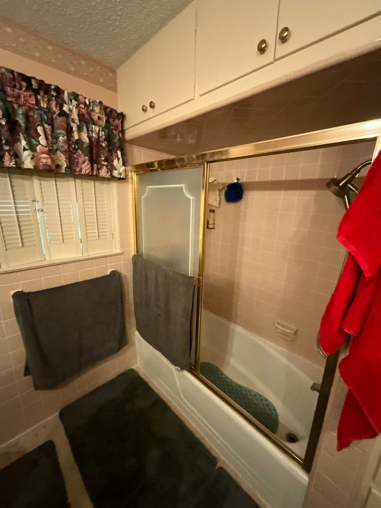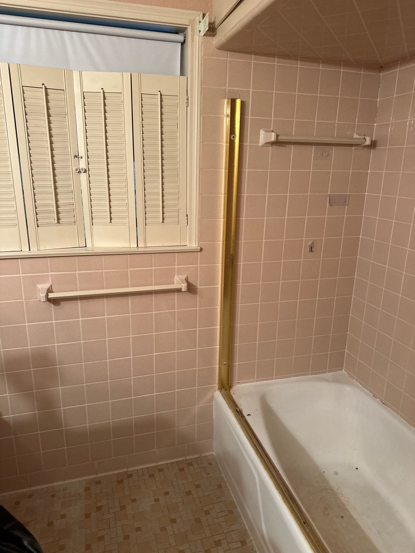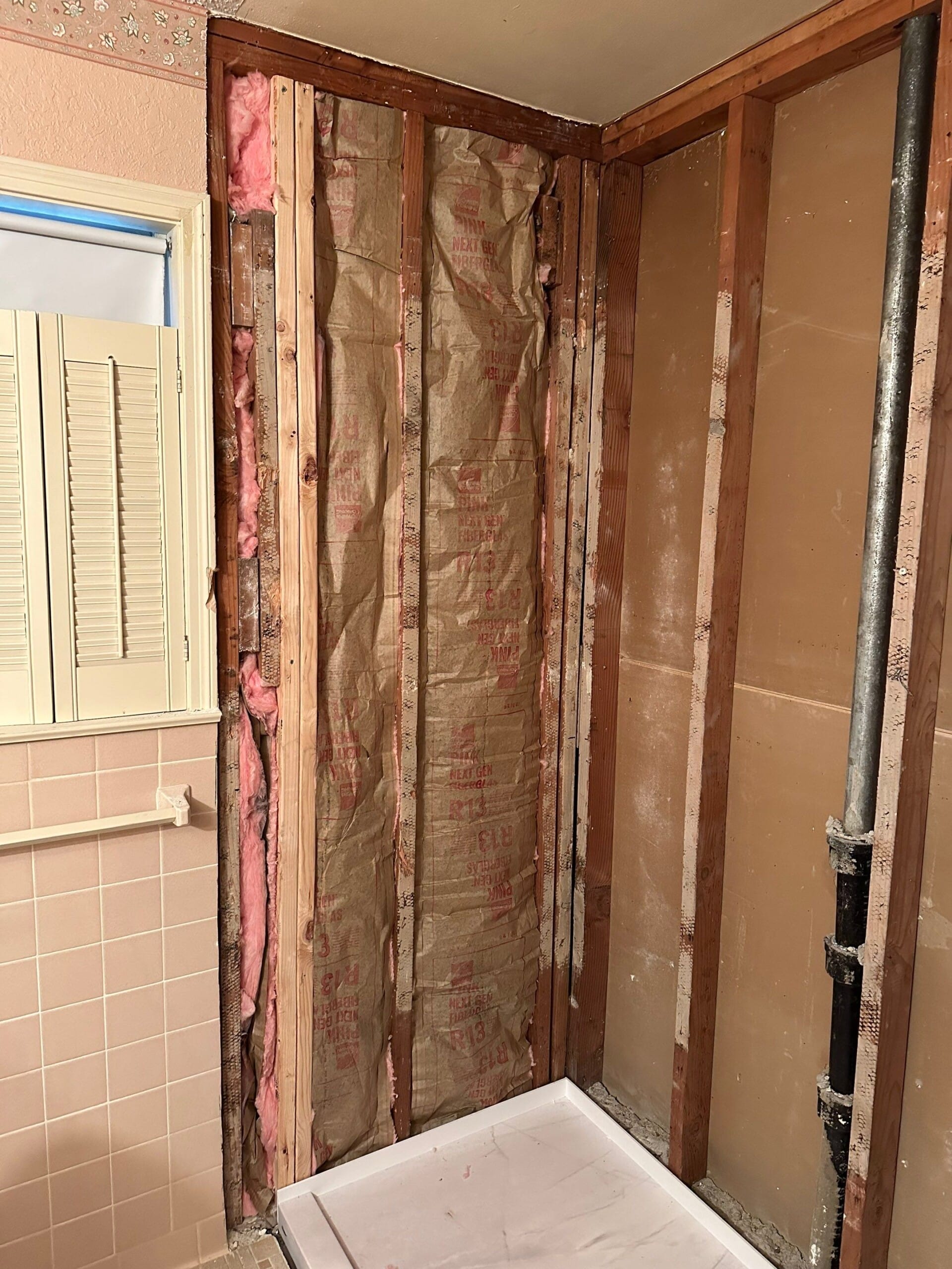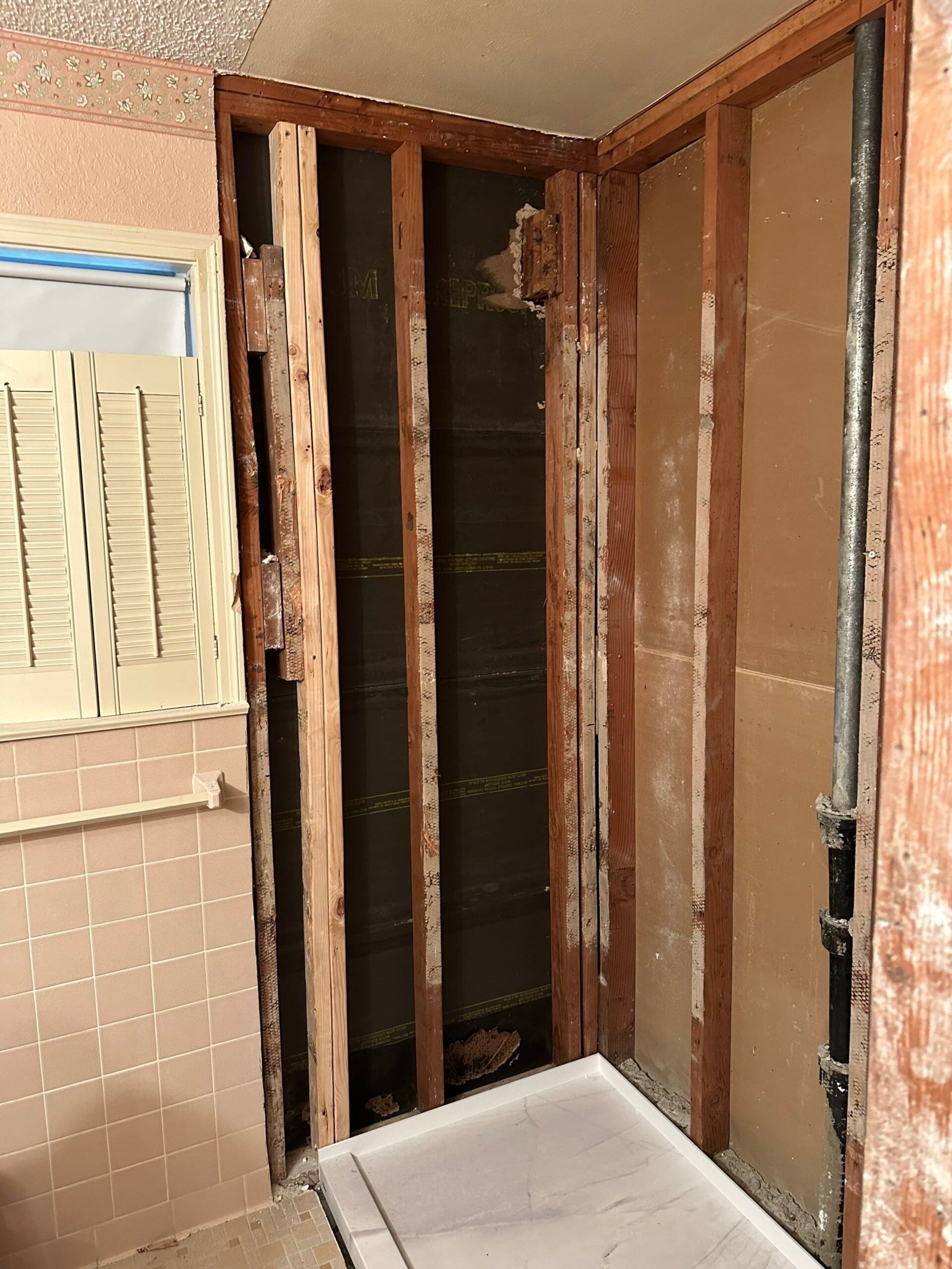 Installation involved a full demolition down to the studs to address plumbing and structural needs. The crew installed a walk-in shower system featuring Calacatta White wall panels with a smooth, marble-like appearance. The setup included a sliding barn-style glass door with brushed metal hardware, matching shower fixtures, corner shelves, a recessed storage niche, and strategically placed safety grab bars. The project was completed efficiently, transforming the space from a tub layout to a functional shower enclosure.