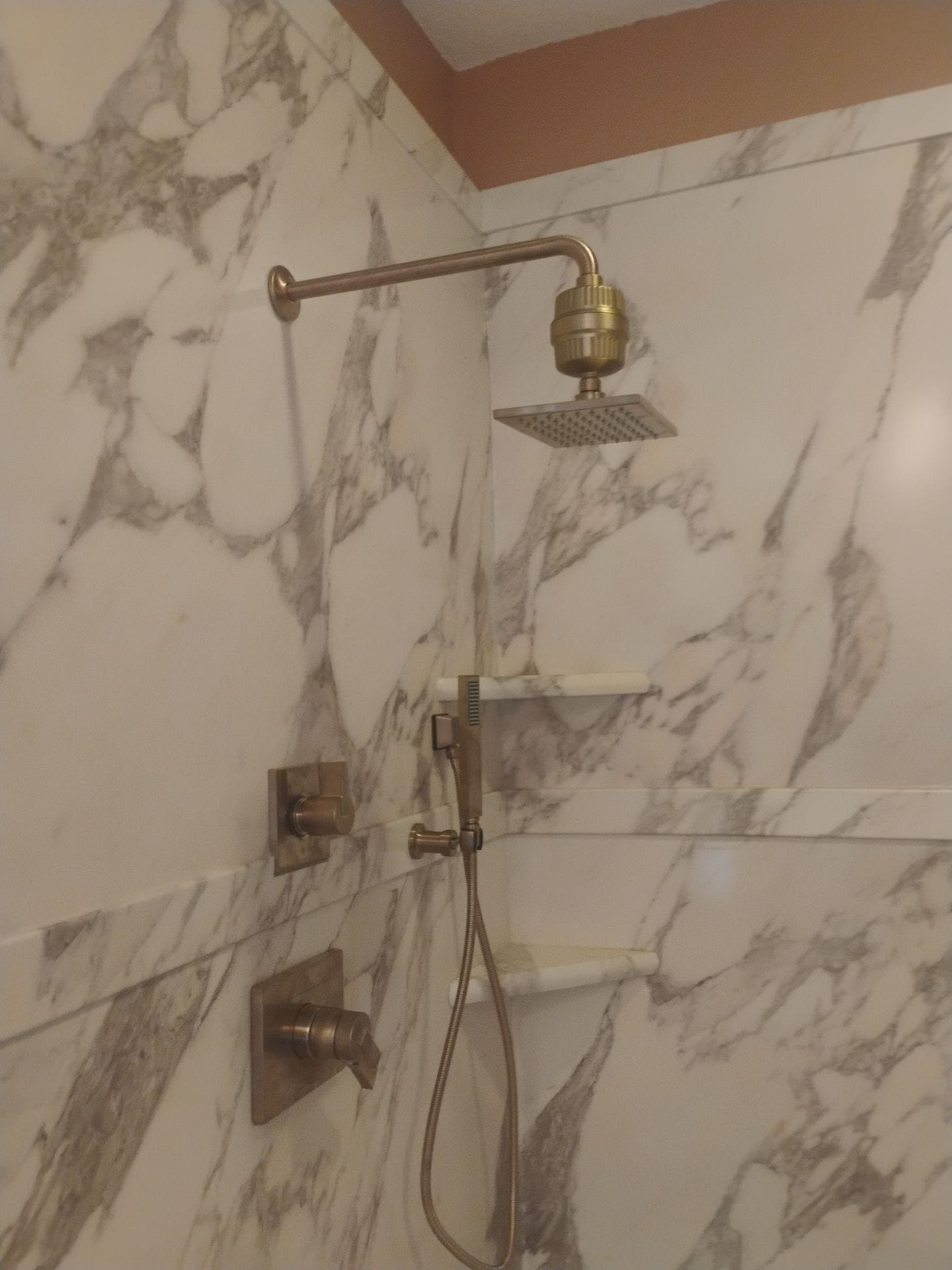 * Brushed bronze rain head with diverter and handheld; two corner shelves