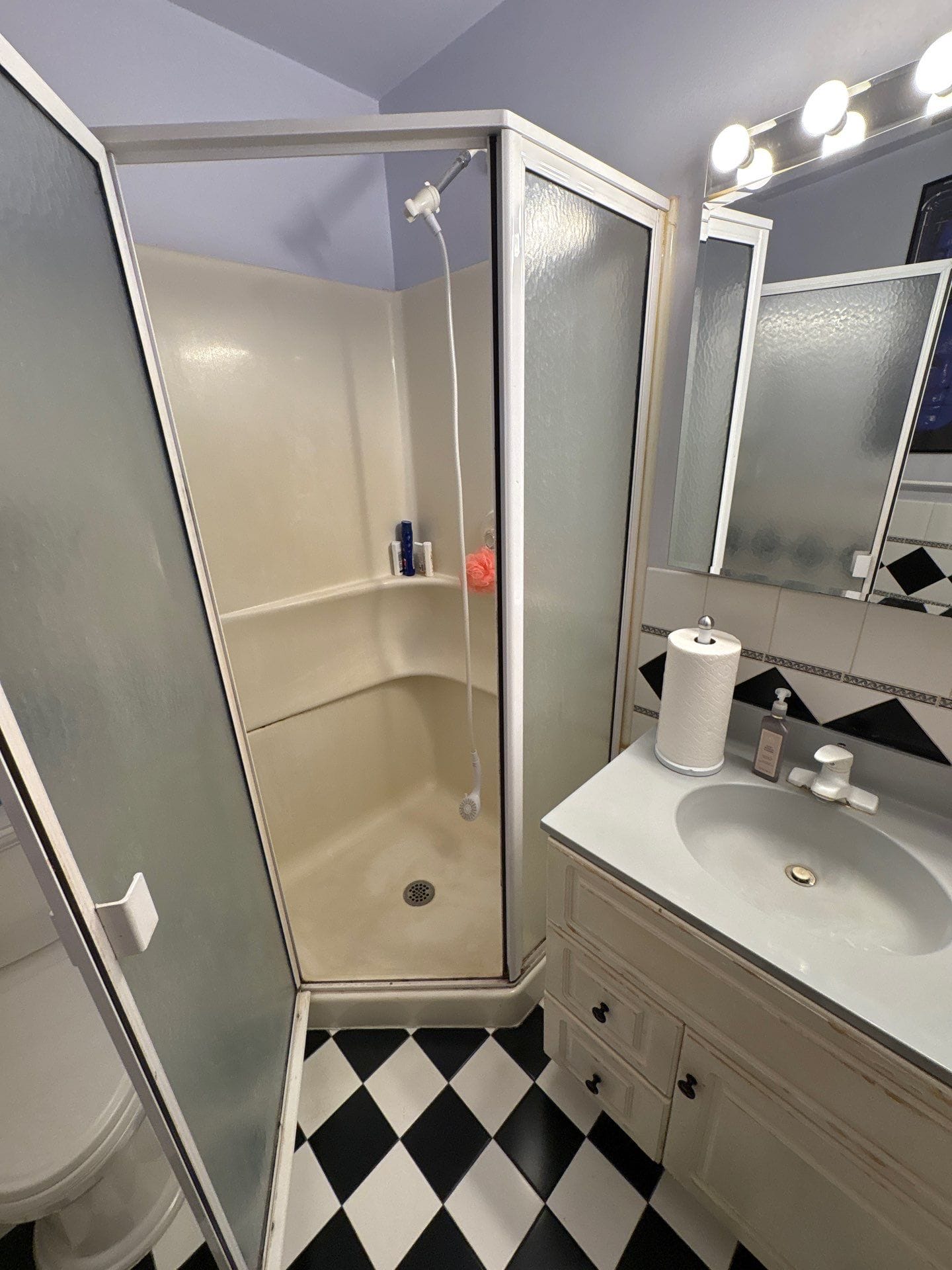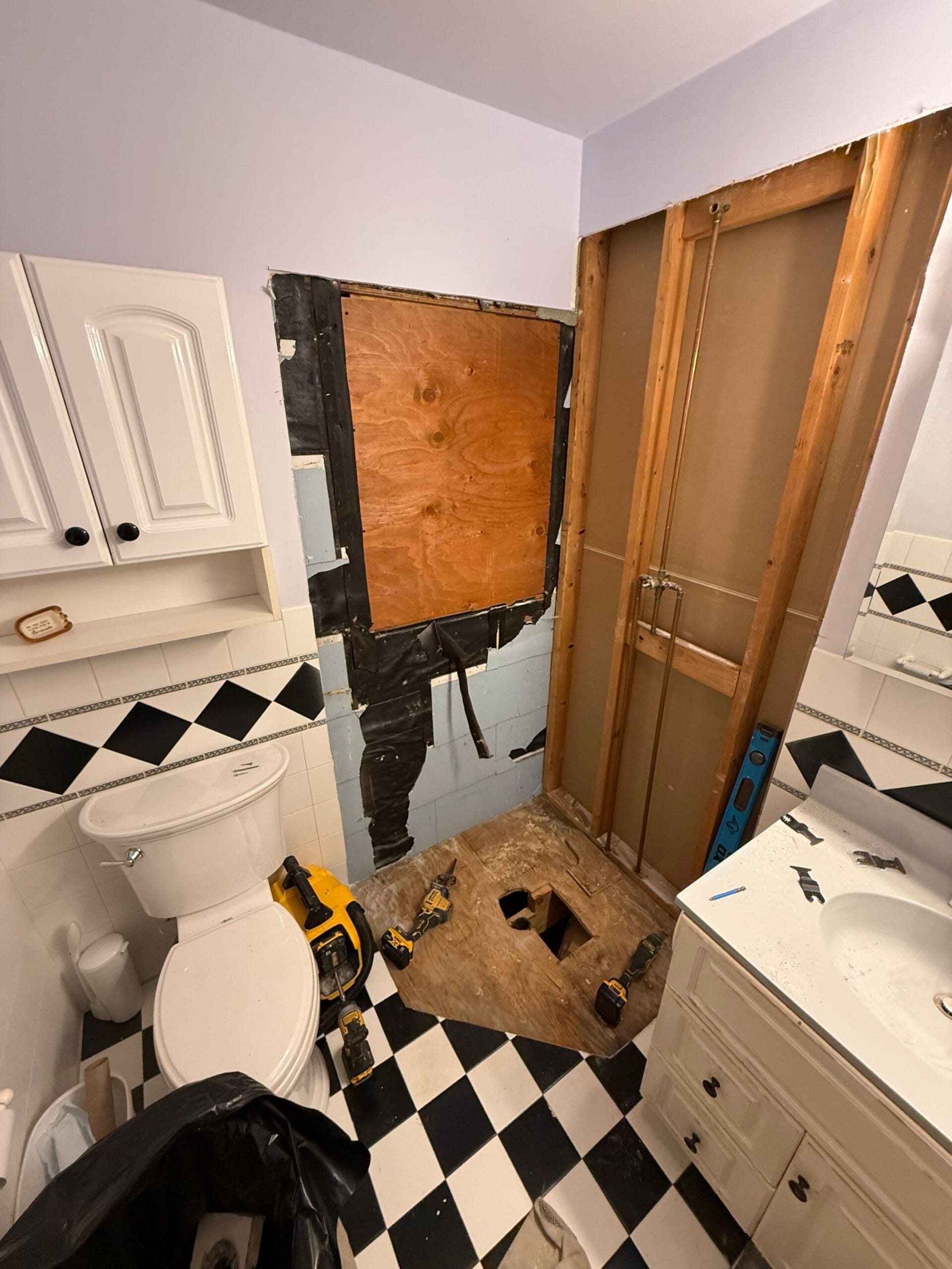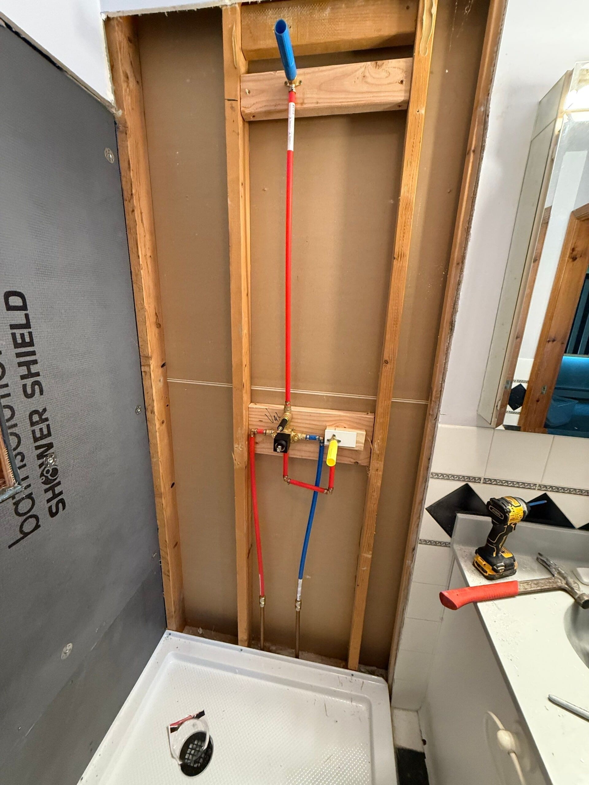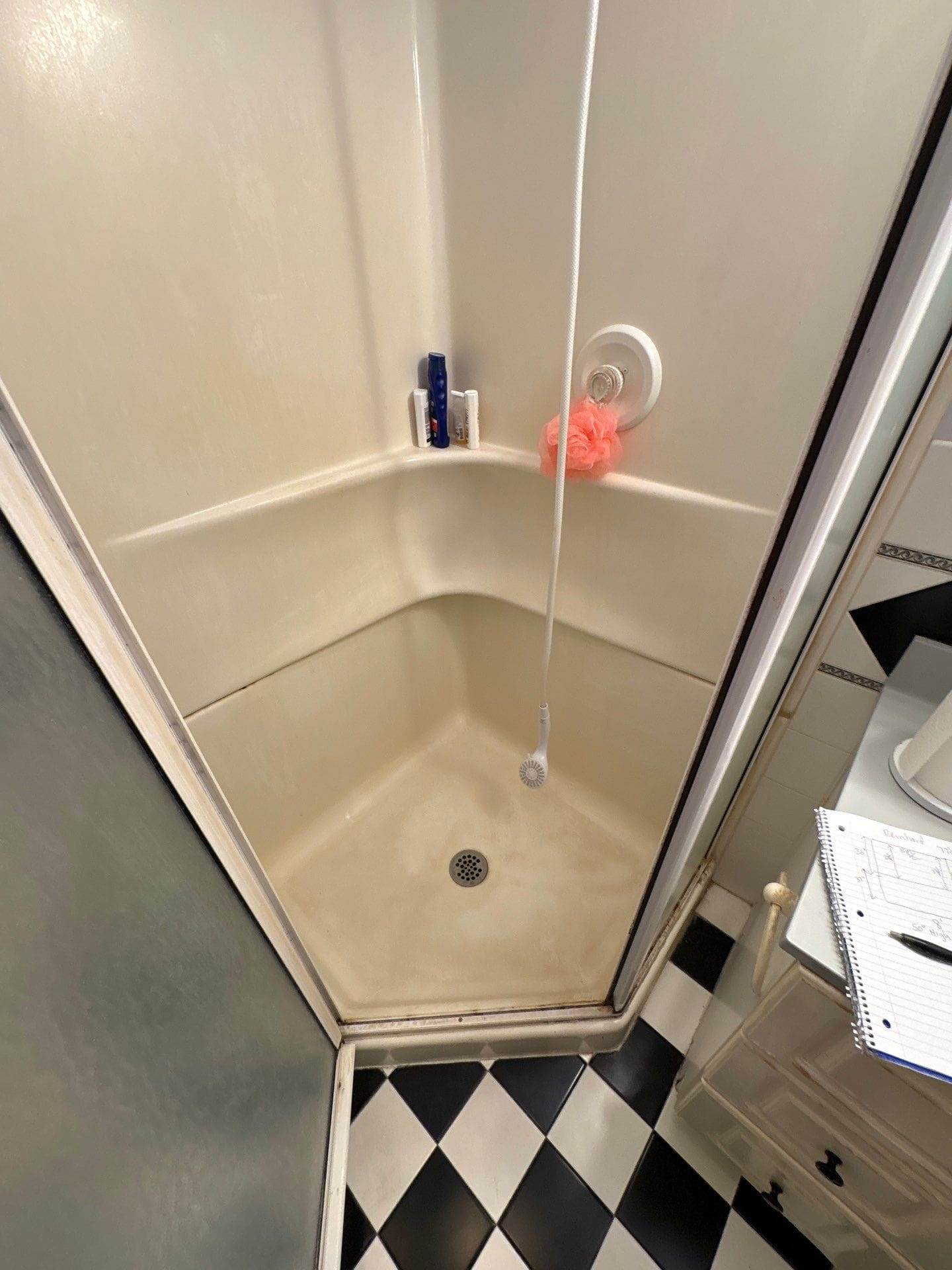 Catherine Walker from Five Star Bath Solutions conducted a full inspection using a moisture meter, revealing high water saturation behind the wall. Catherine recommended complete demolition to the studs and subfloor, followed by a new waterproof system with composite wall panels and a solid PVC shower base. She explained that the panels are non-porous and grout-free, eliminating future mold risks and requiring only light maintenance. The custom design reflected the customer’s aesthetic preferences and accessibility needs, including a rainfall shower head, recessed niche, two corner shelves, a grab bar, and a handheld sprayer. Based on the completed photos, a built-in bench was not included in the final layout, although it was part of the original discussion.