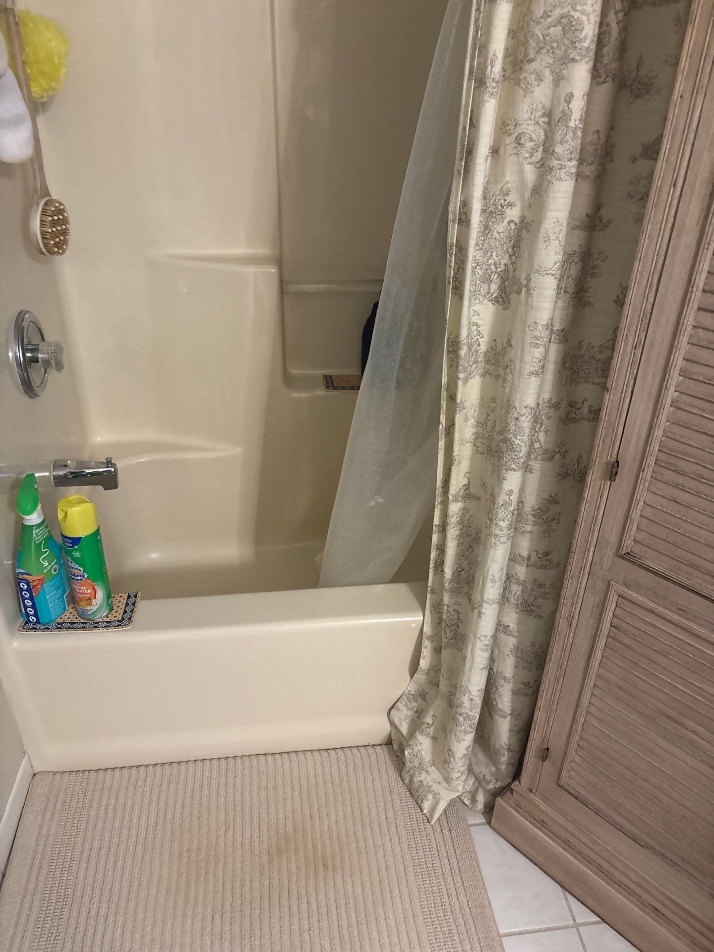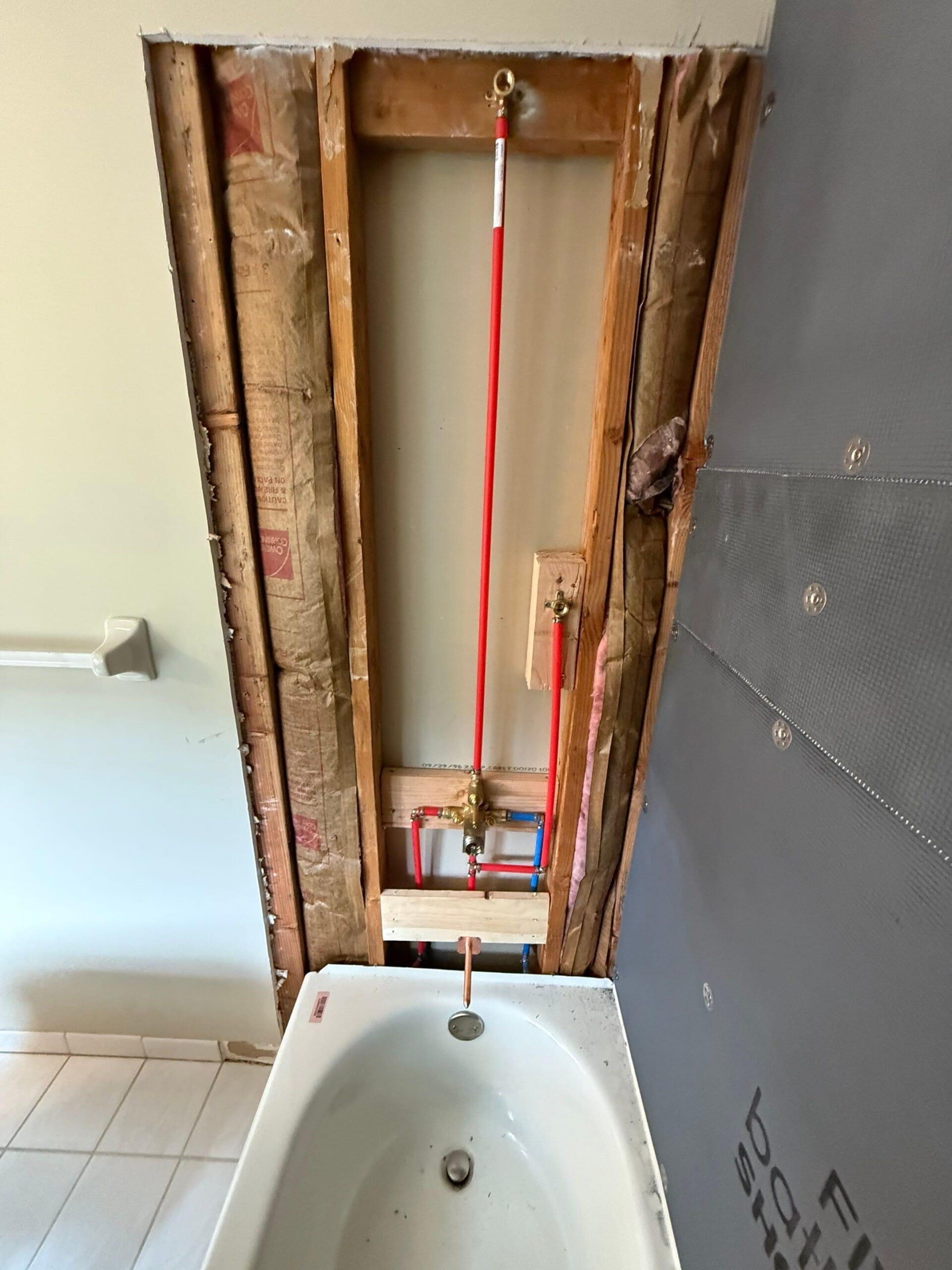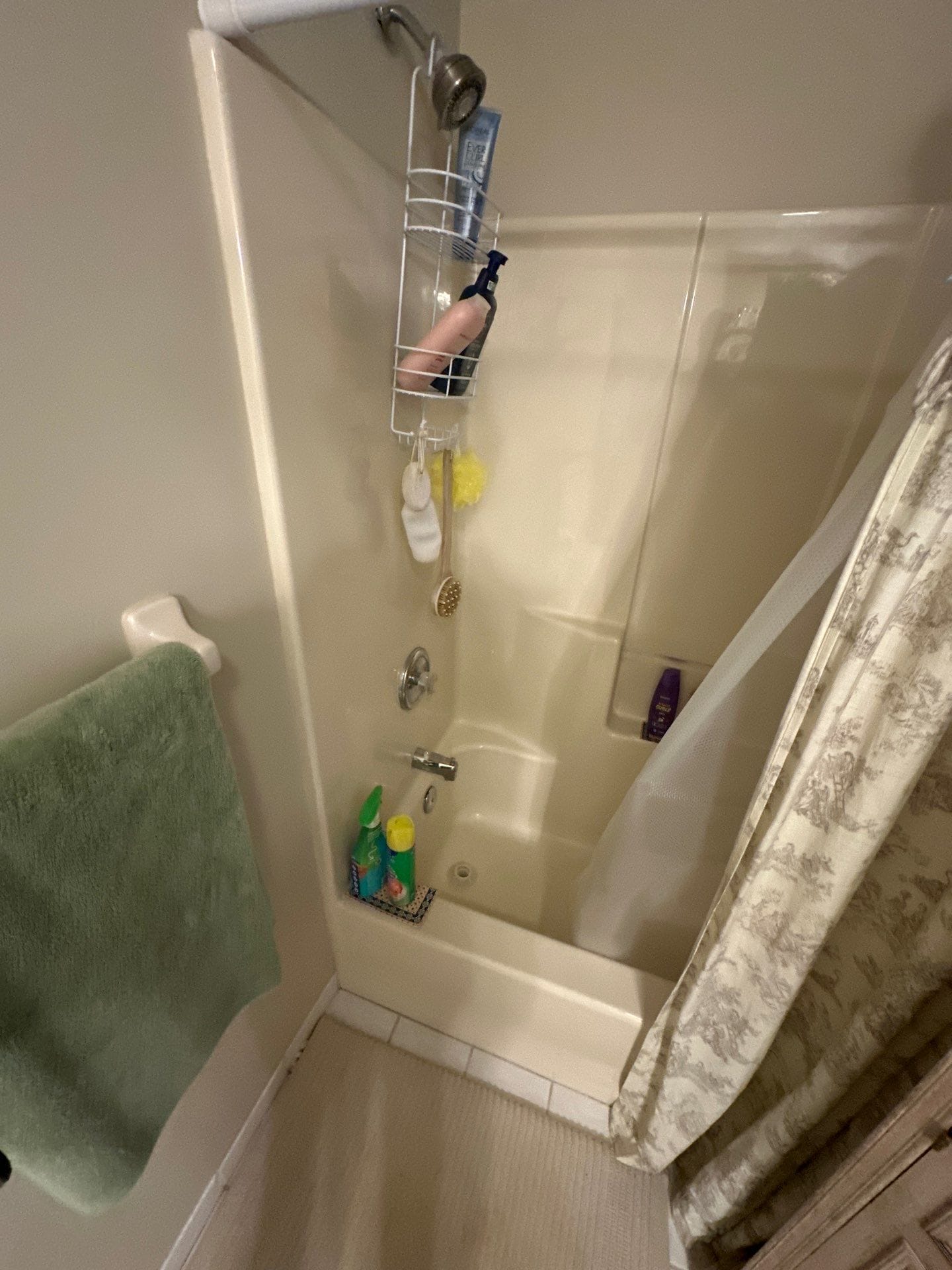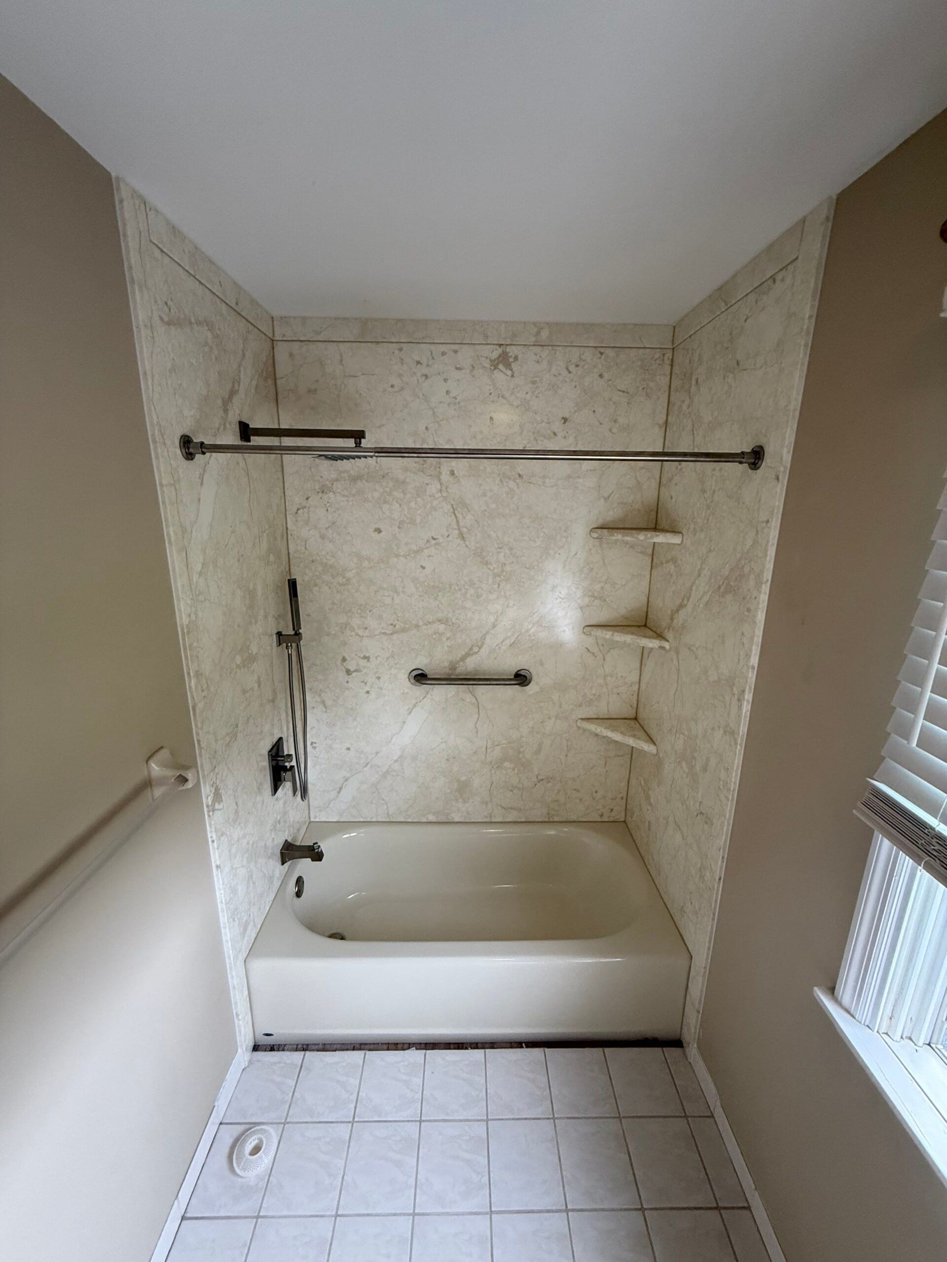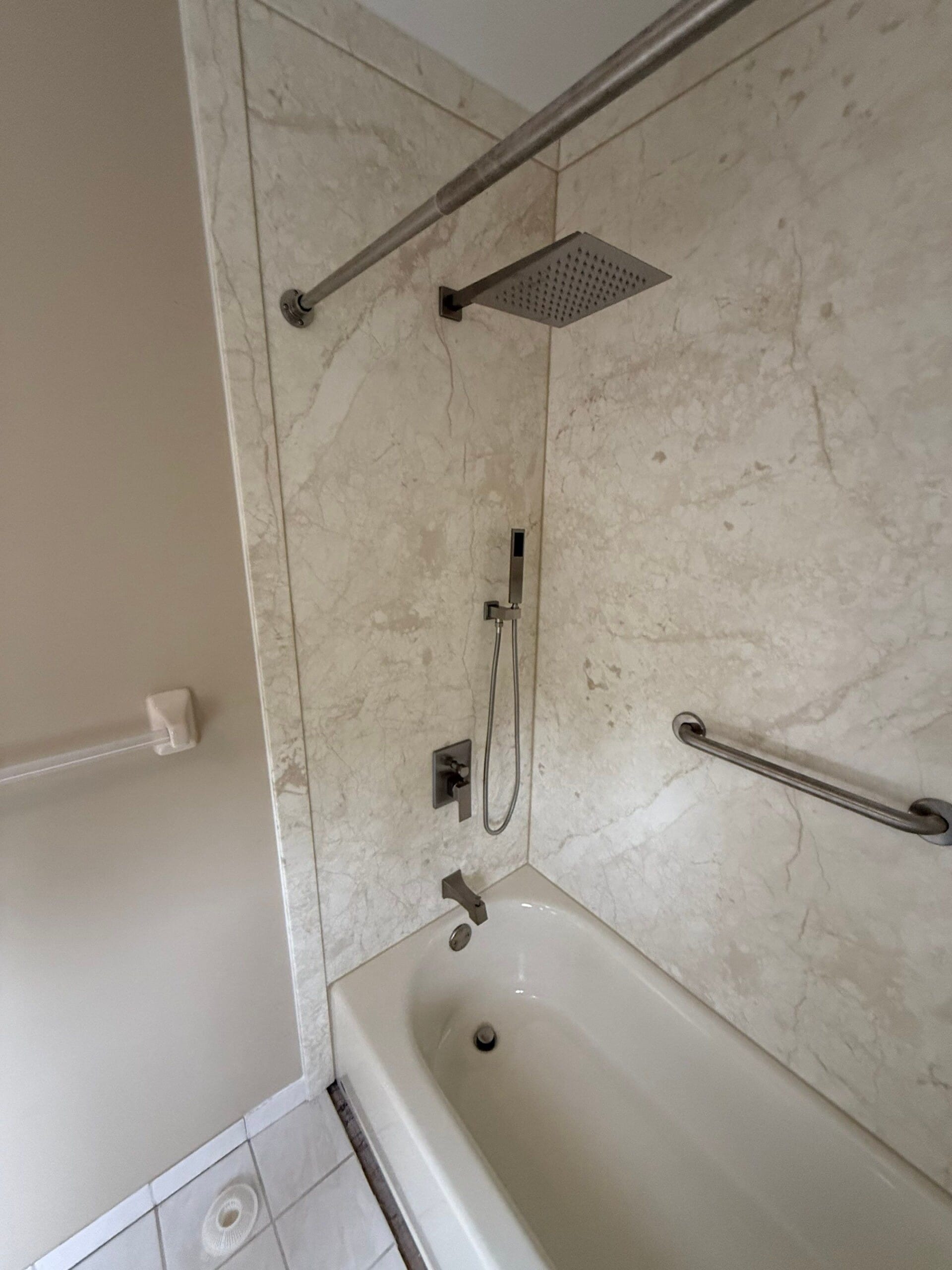 The project included full demolition and removal of the existing almond-tone tub enclosure, followed by waterproof backer board preparation. The installed system featured a neutral marble-style panel design, not the previously requested Subway Diamond finish. Fixtures were finished in brushed nickel rather than matte black. The existing tub was retained, and new wall panels were fitted over the surround to complete the transformation. A rainfall showerhead was installed with a matching handheld unit, and a horizontal grab bar was added for stability. The bench mentioned in the review was not part of the installed design. Additional corner shelving was integrated to enhance functionality.