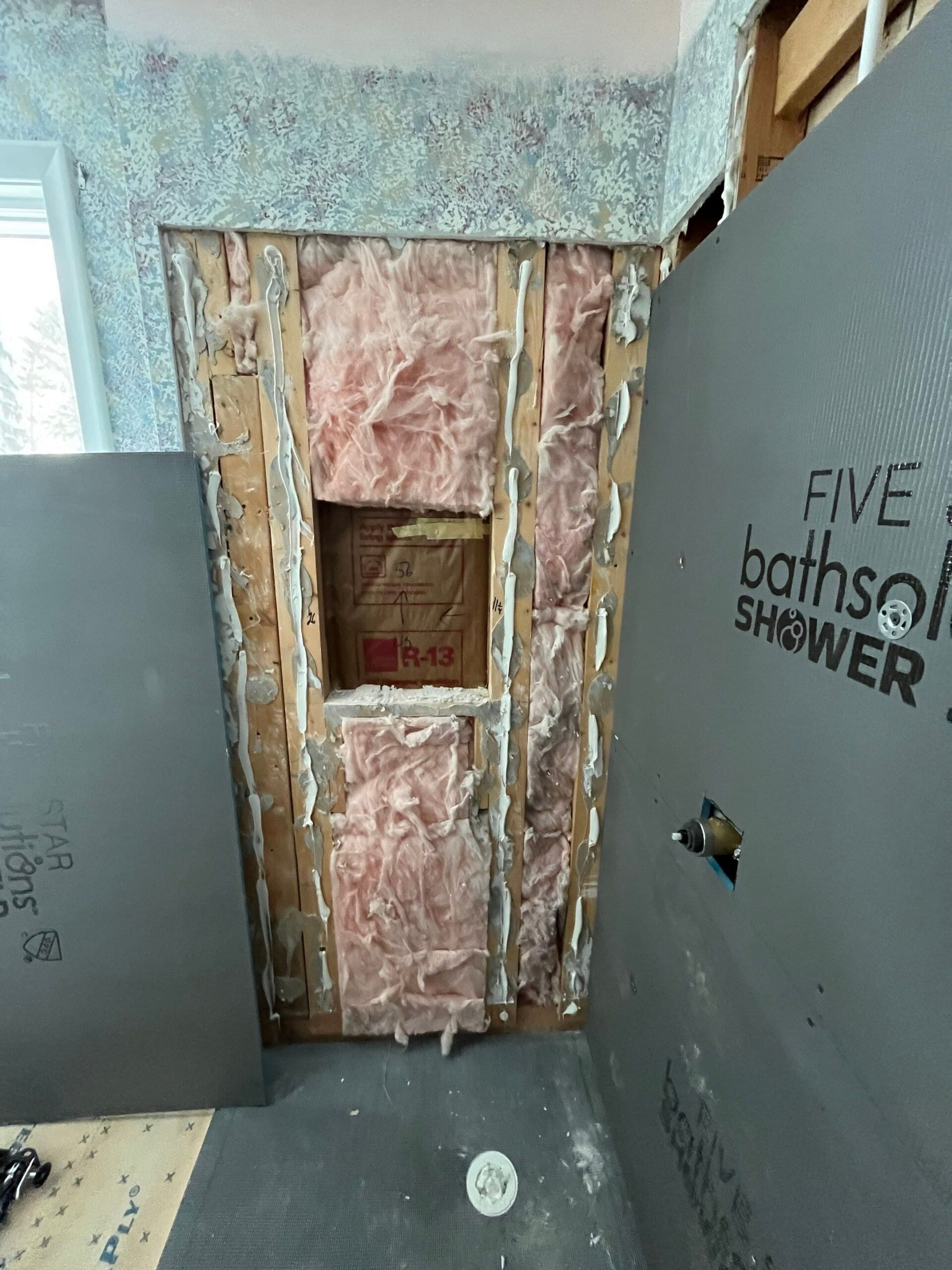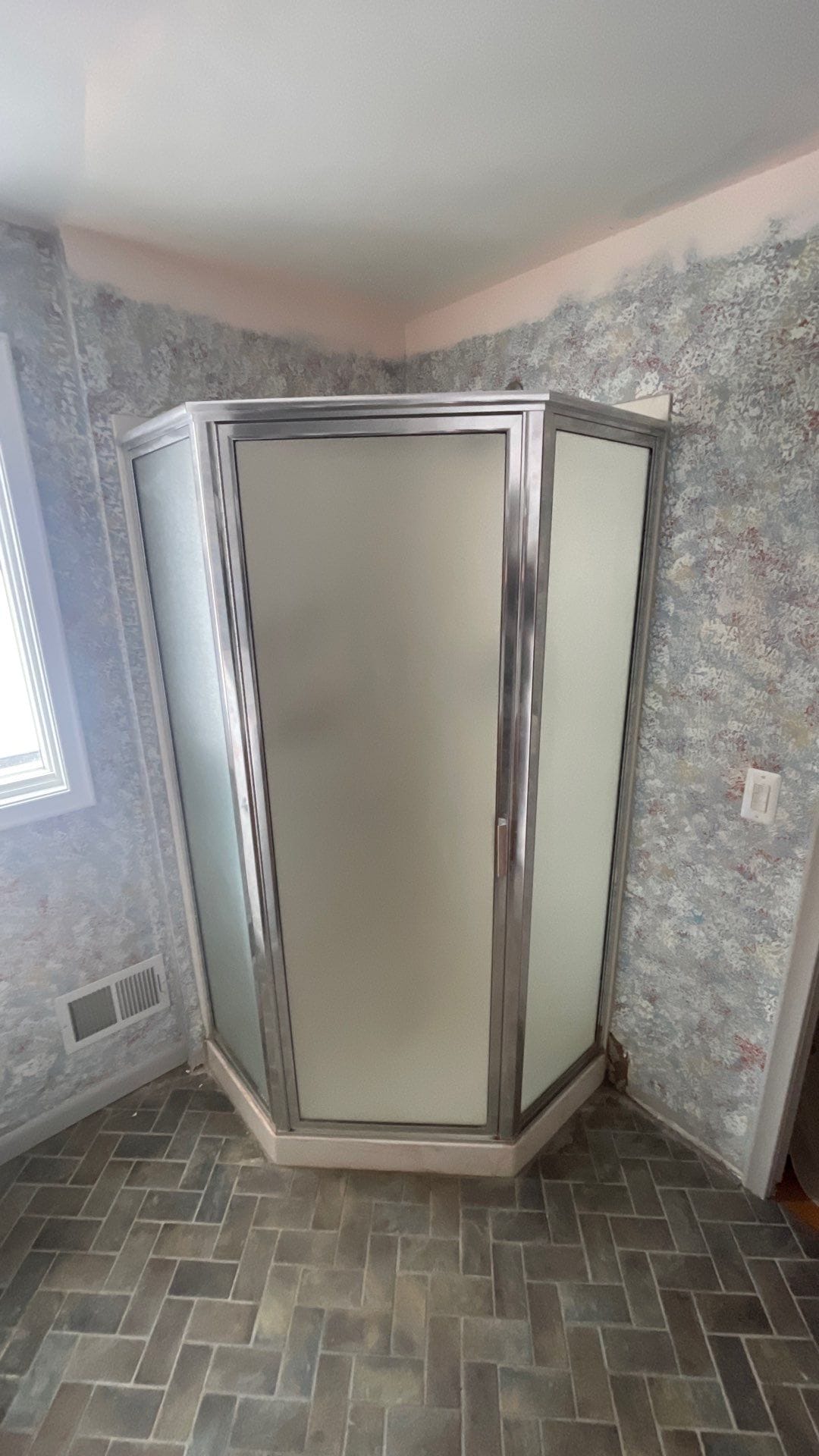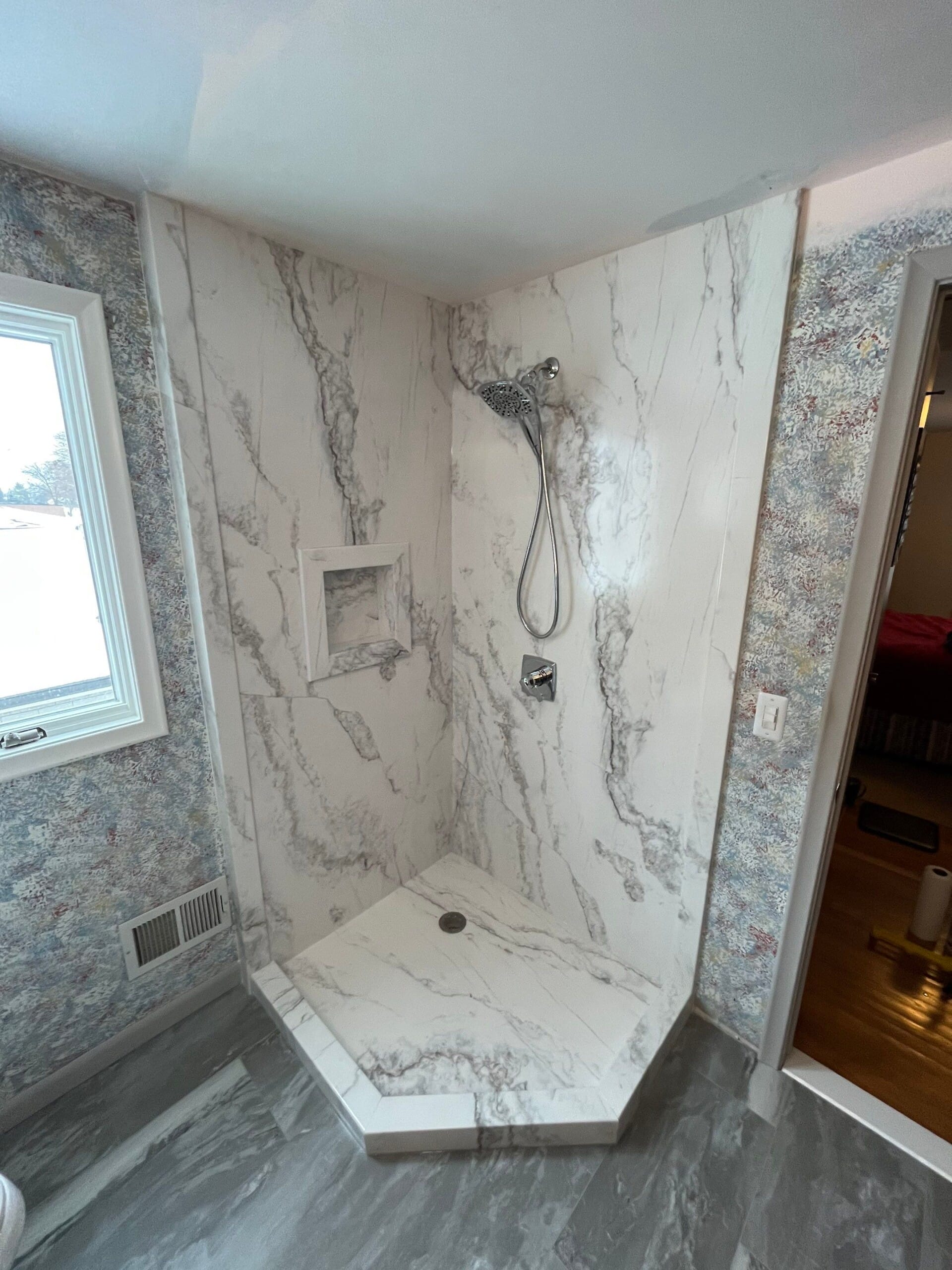 Installation involved protecting the surrounding home, removing the existing framed corner shower enclosure, and taking the space down to the studs to inspect for moisture and structural concerns. Any compromised materials were addressed before installing waterproof backer systems, new plumbing components, and a marble-pattern composite wall system with a matching integrated shower base. A recessed wall niche was installed for practical storage, and all seams were sealed with high-grade antimicrobial silicone. The shower installation was completed within two days, followed by full cleanup and debris removal.