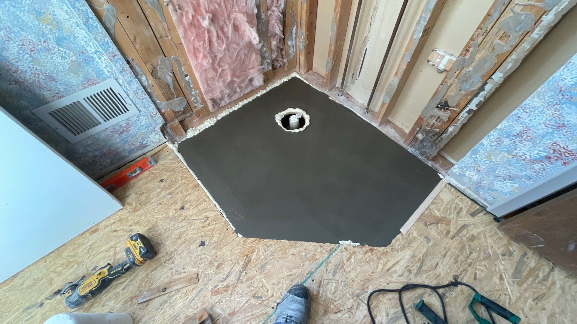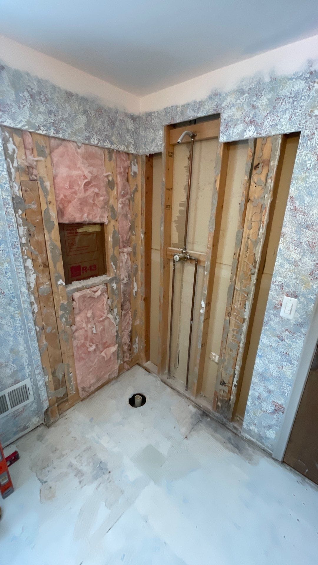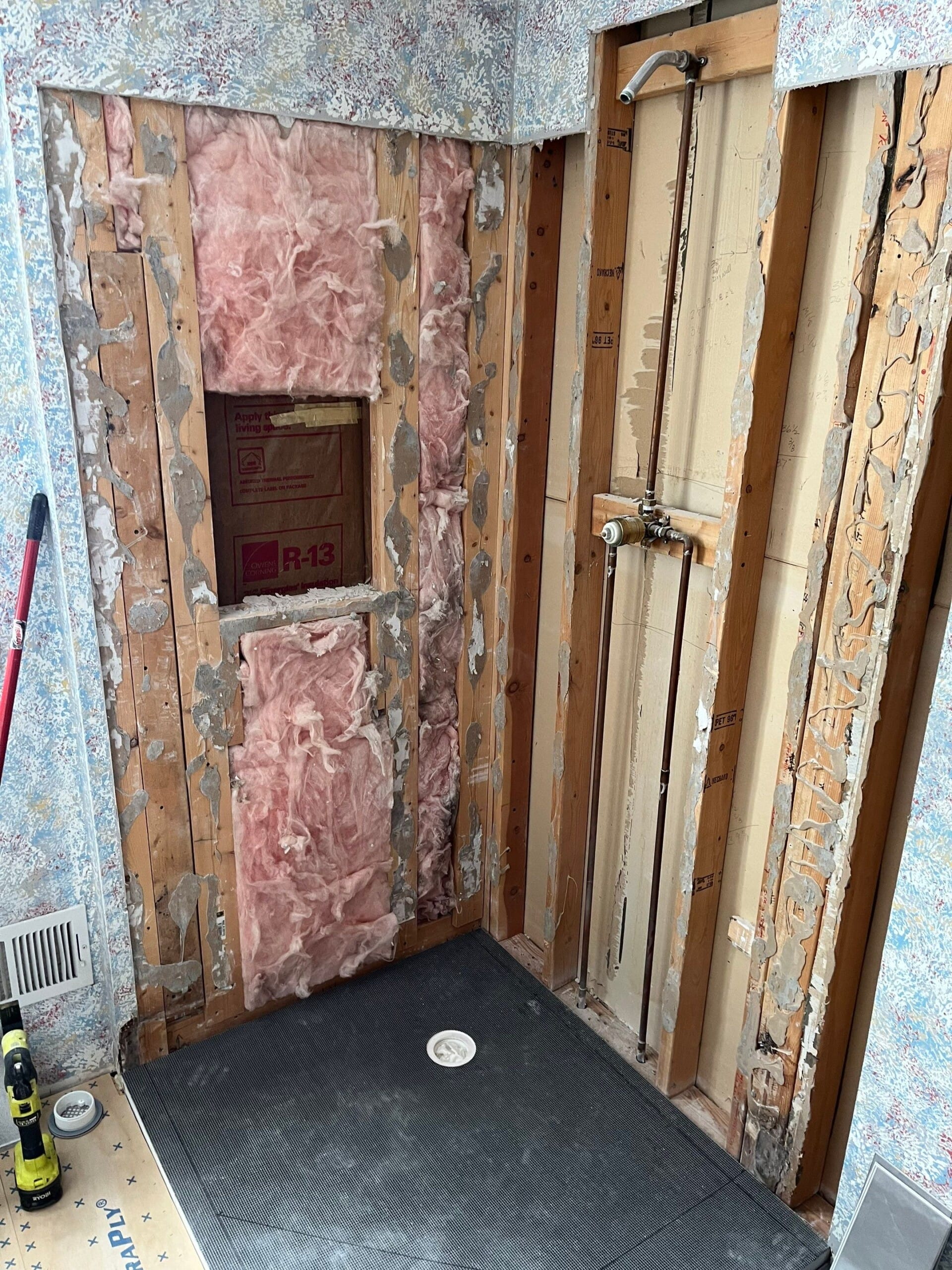 Installation involved protecting the surrounding home, removing the existing framed corner shower enclosure, and taking the space down to the studs to inspect for moisture and structural concerns. Any compromised materials were addressed before installing waterproof backer systems, new plumbing components, and a marble-pattern composite wall system with a matching integrated shower base. A recessed wall niche was installed for practical storage, and all seams were sealed with high-grade antimicrobial silicone. The shower installation was completed within two days, followed by full cleanup and debris removal.