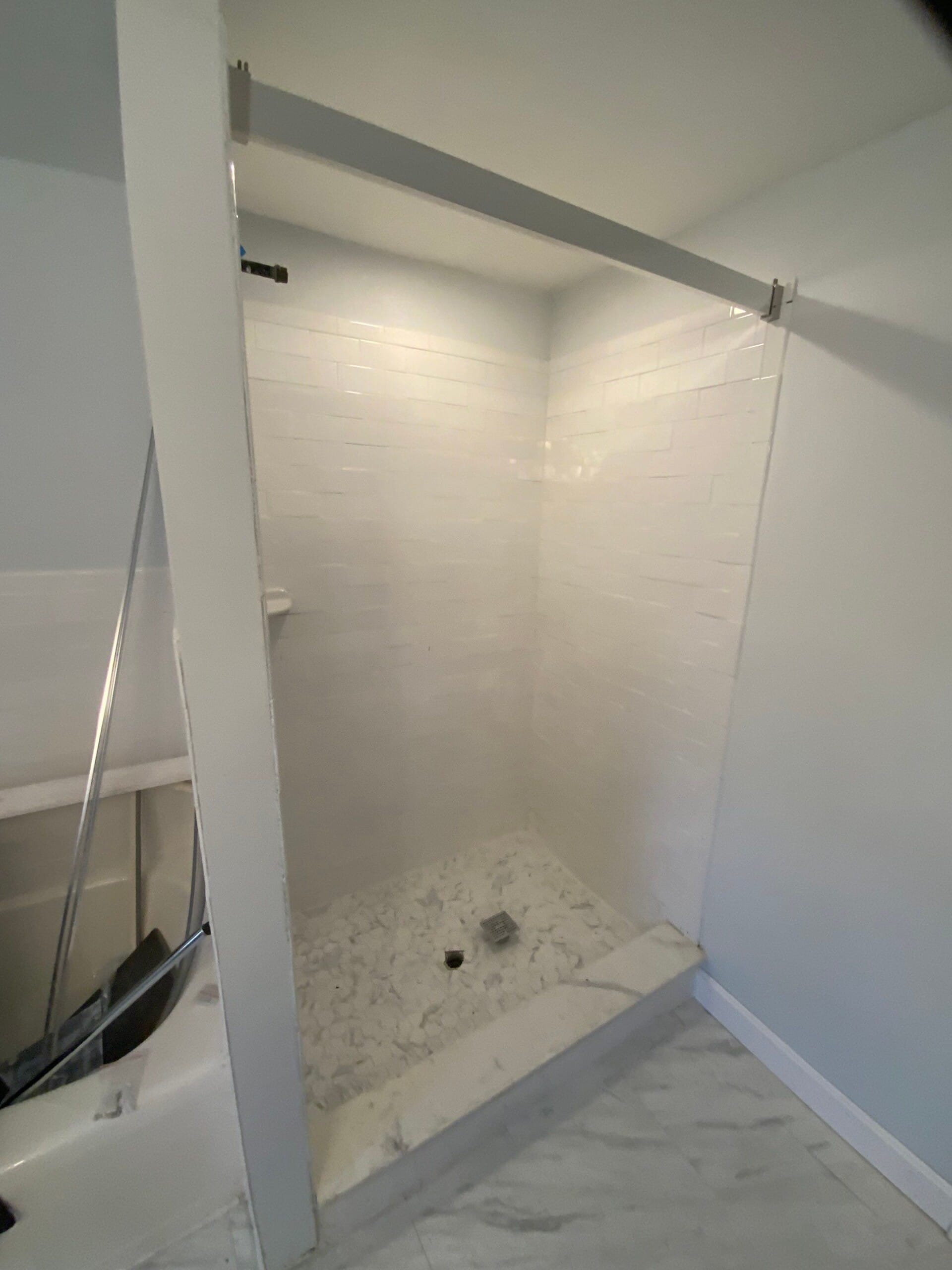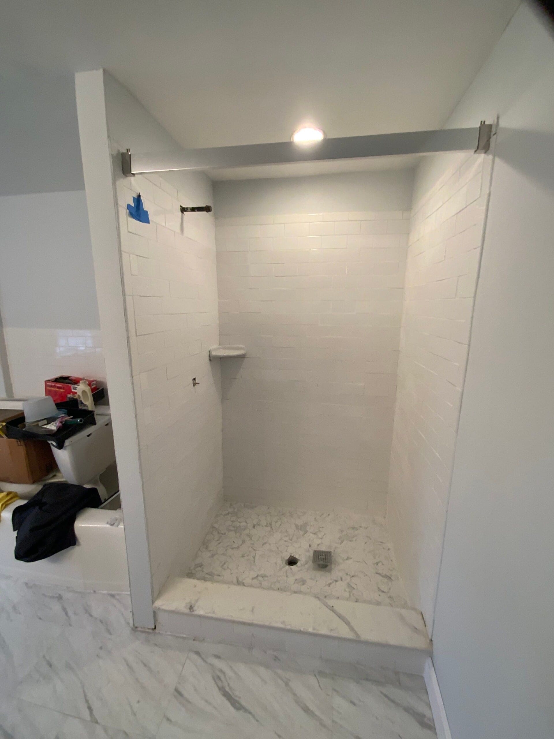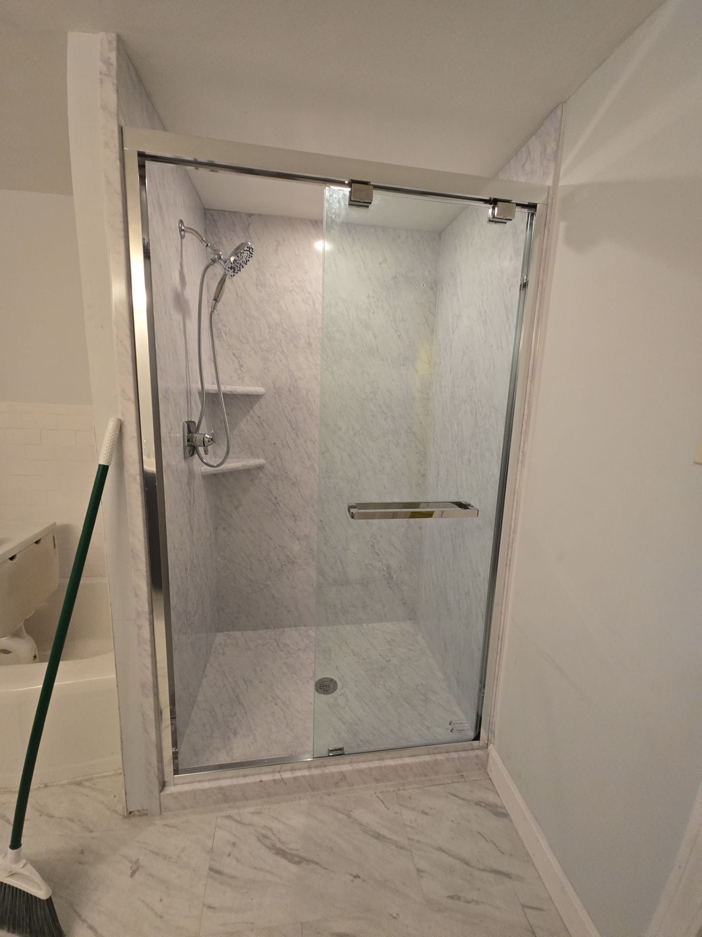 The installation process began with full removal to the studs, followed by inspection and repair of the substrate and surrounding surfaces. New plumbing was installed using a Delta commercial-grade valve system. A waterproof backer and quad-lock corner system were applied before custom-cut wall panels, glass, and hardware were secured. Installation was completed in one day with coordination for condo board access, and all site debris was removed.