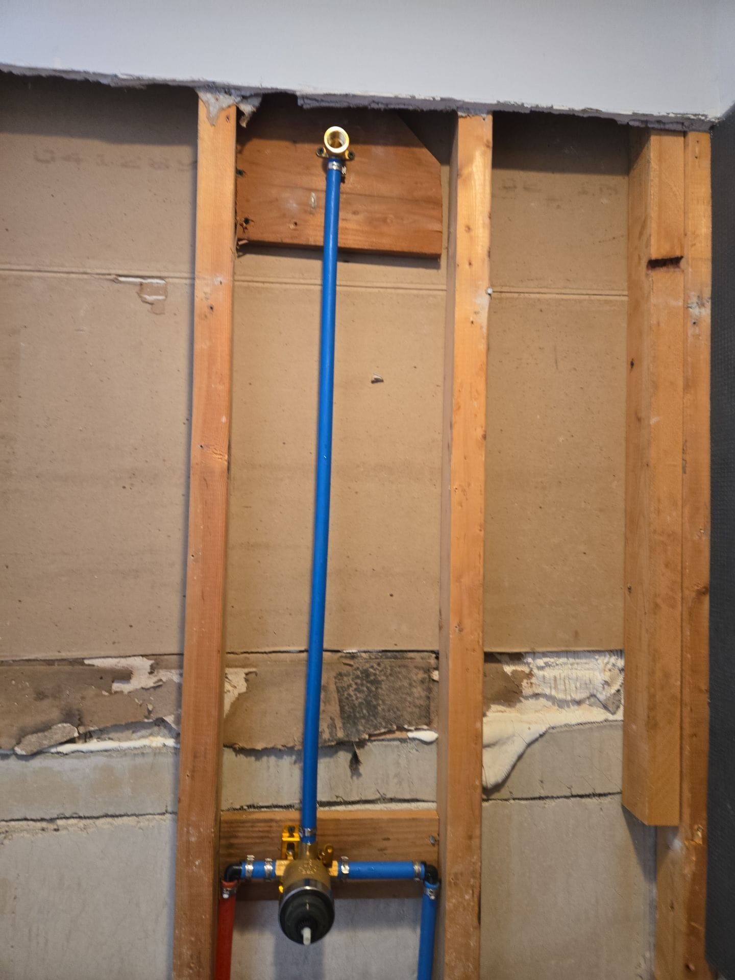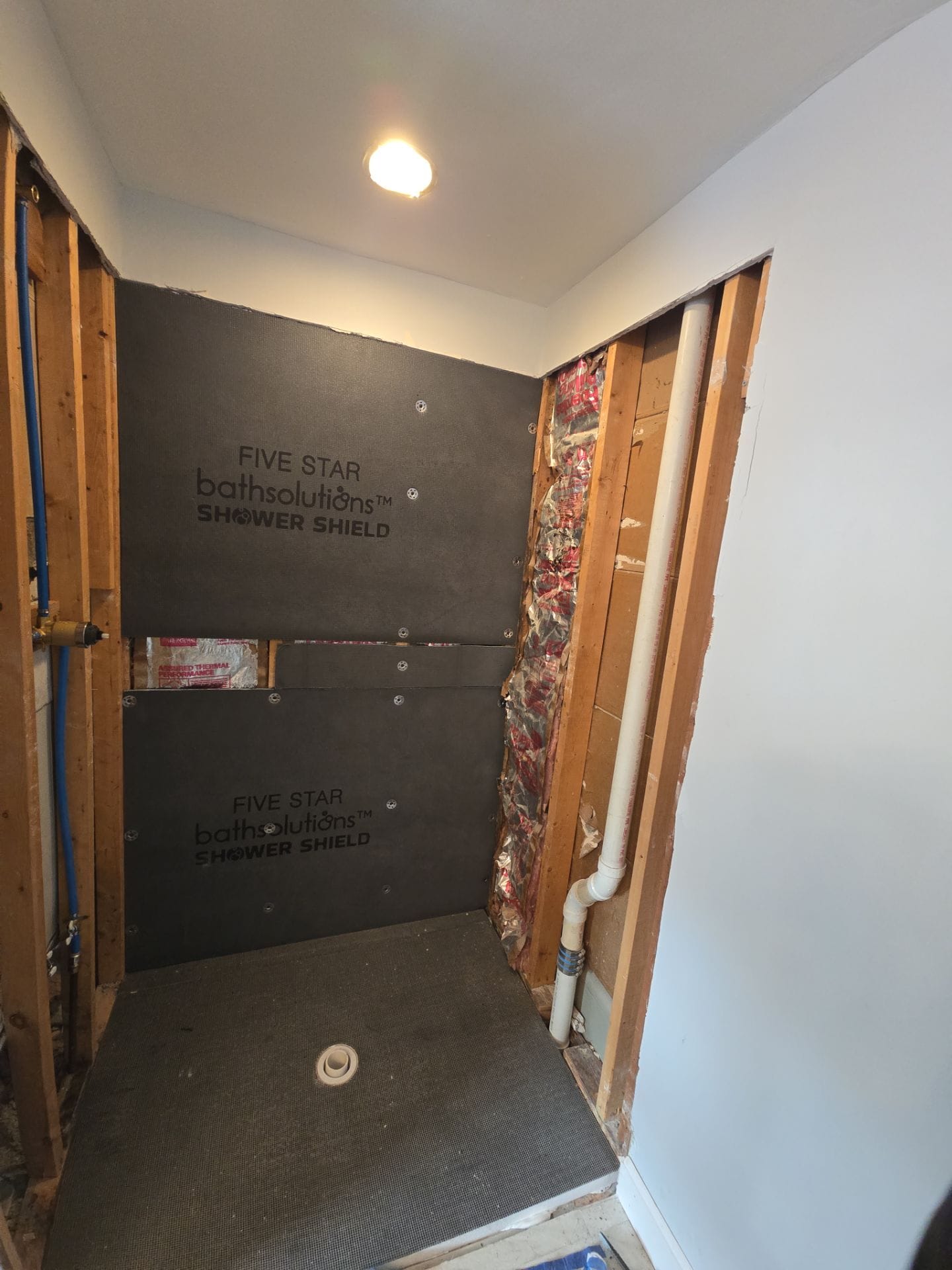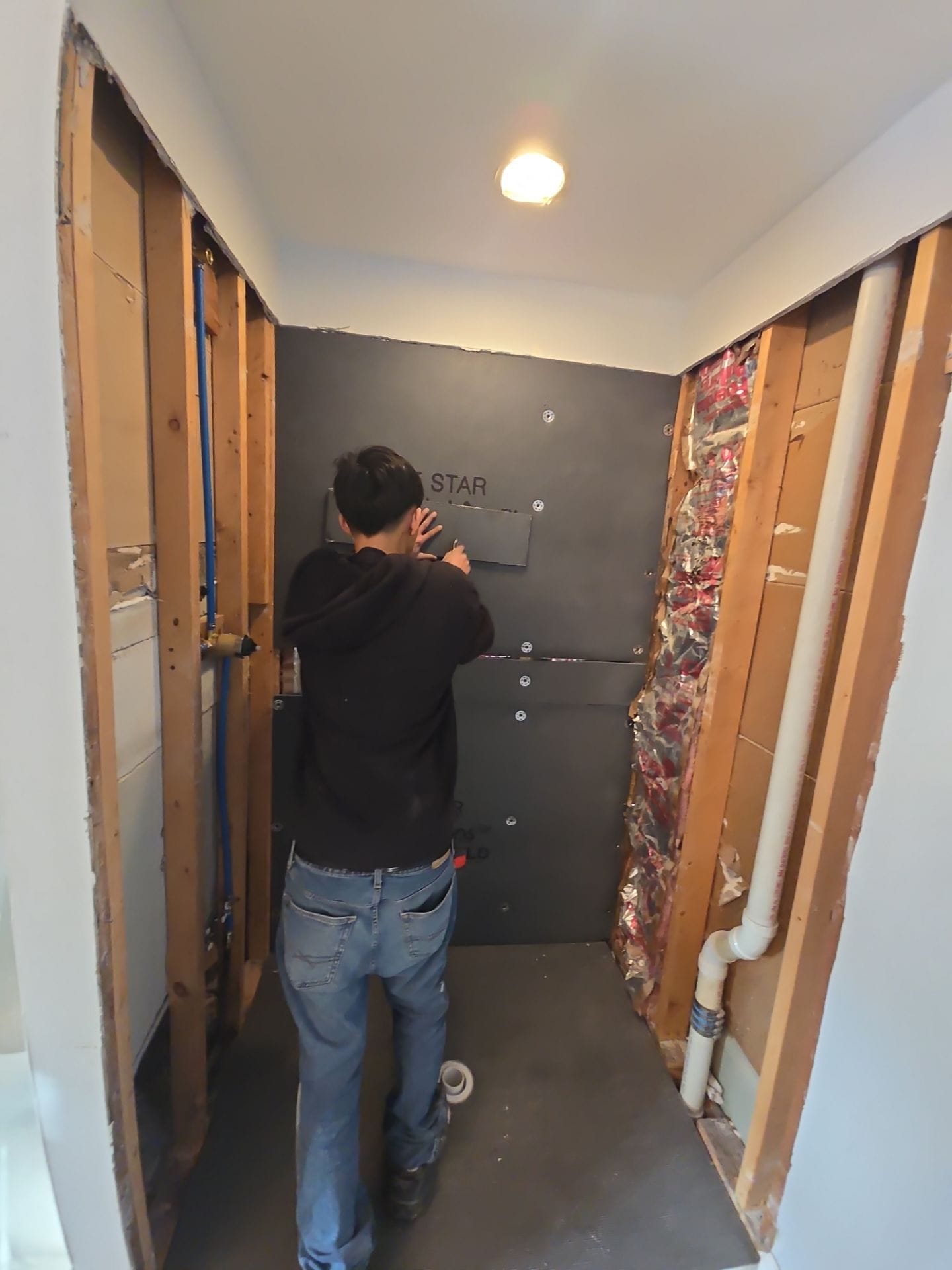 The installation process began with full removal to the studs, followed by inspection and repair of the substrate and surrounding surfaces. New plumbing was installed using a Delta commercial-grade valve system. A waterproof backer and quad-lock corner system were applied before custom-cut wall panels, glass, and hardware were secured. Installation was completed in one day with coordination for condo board access, and all site debris was removed.