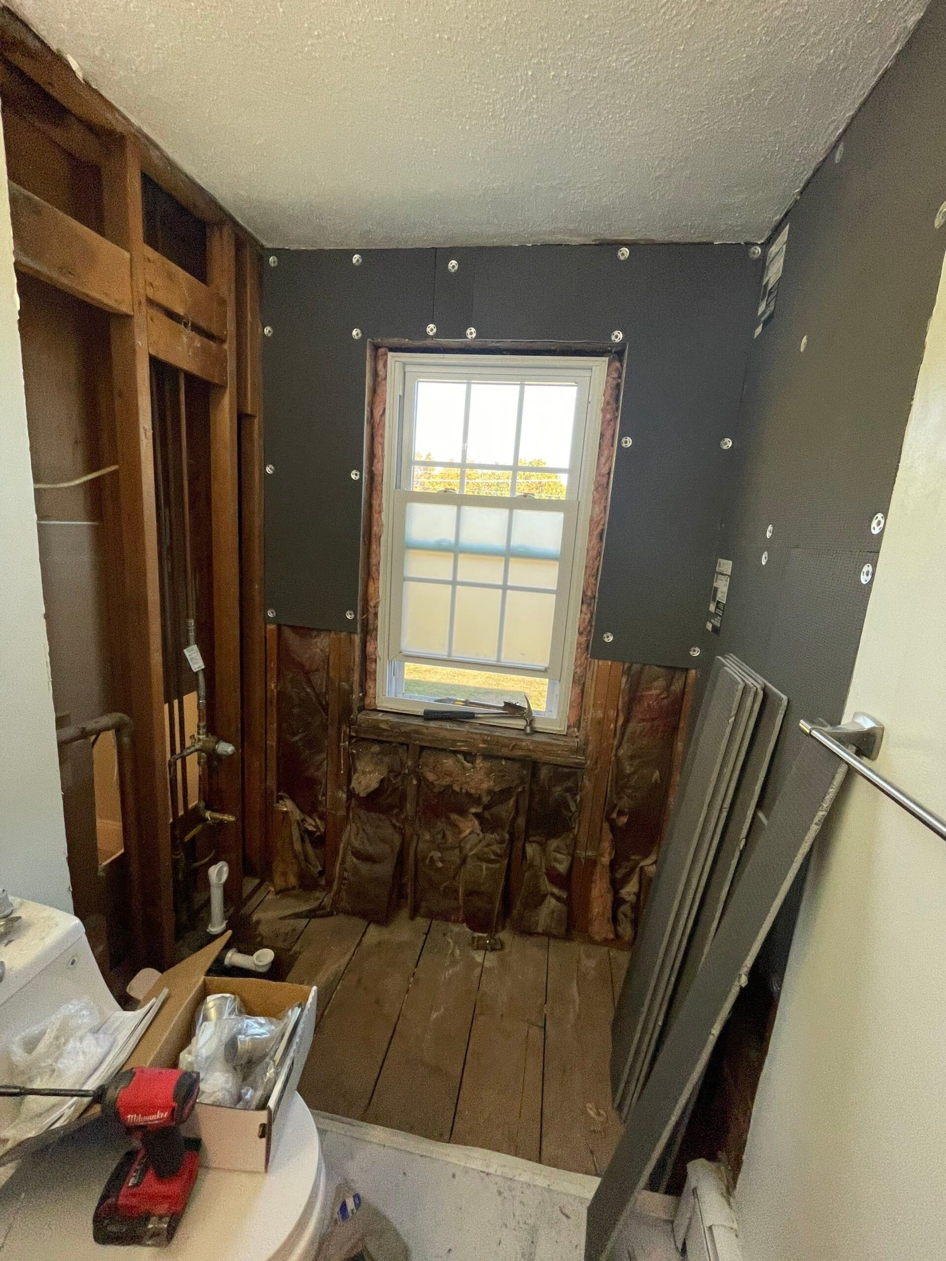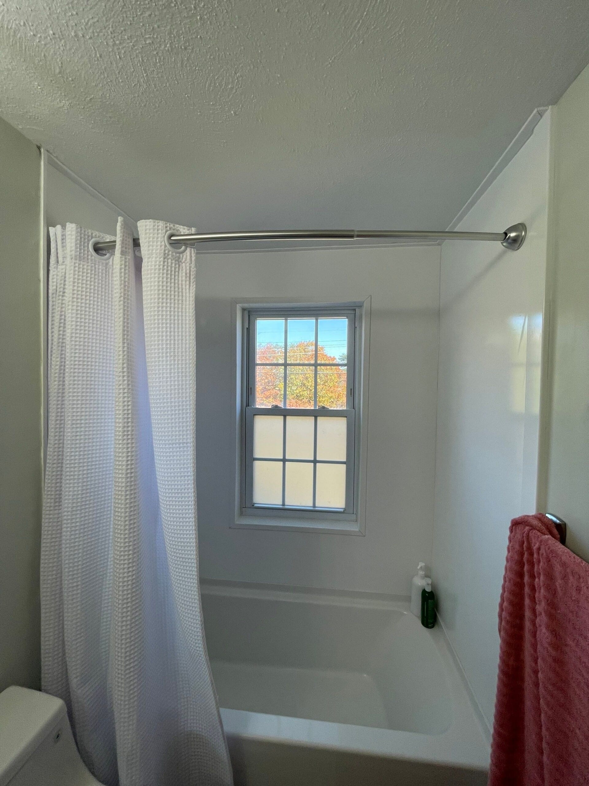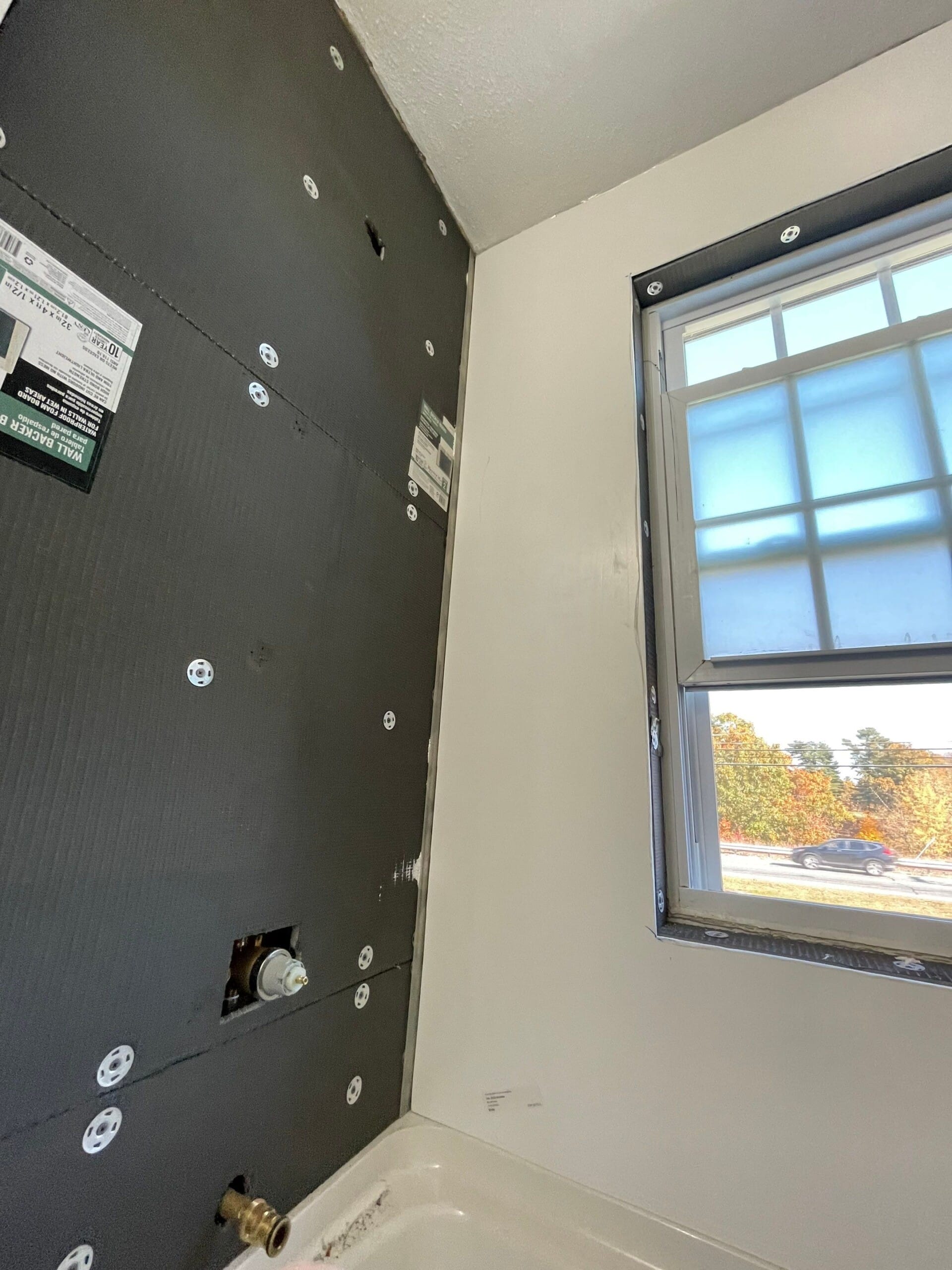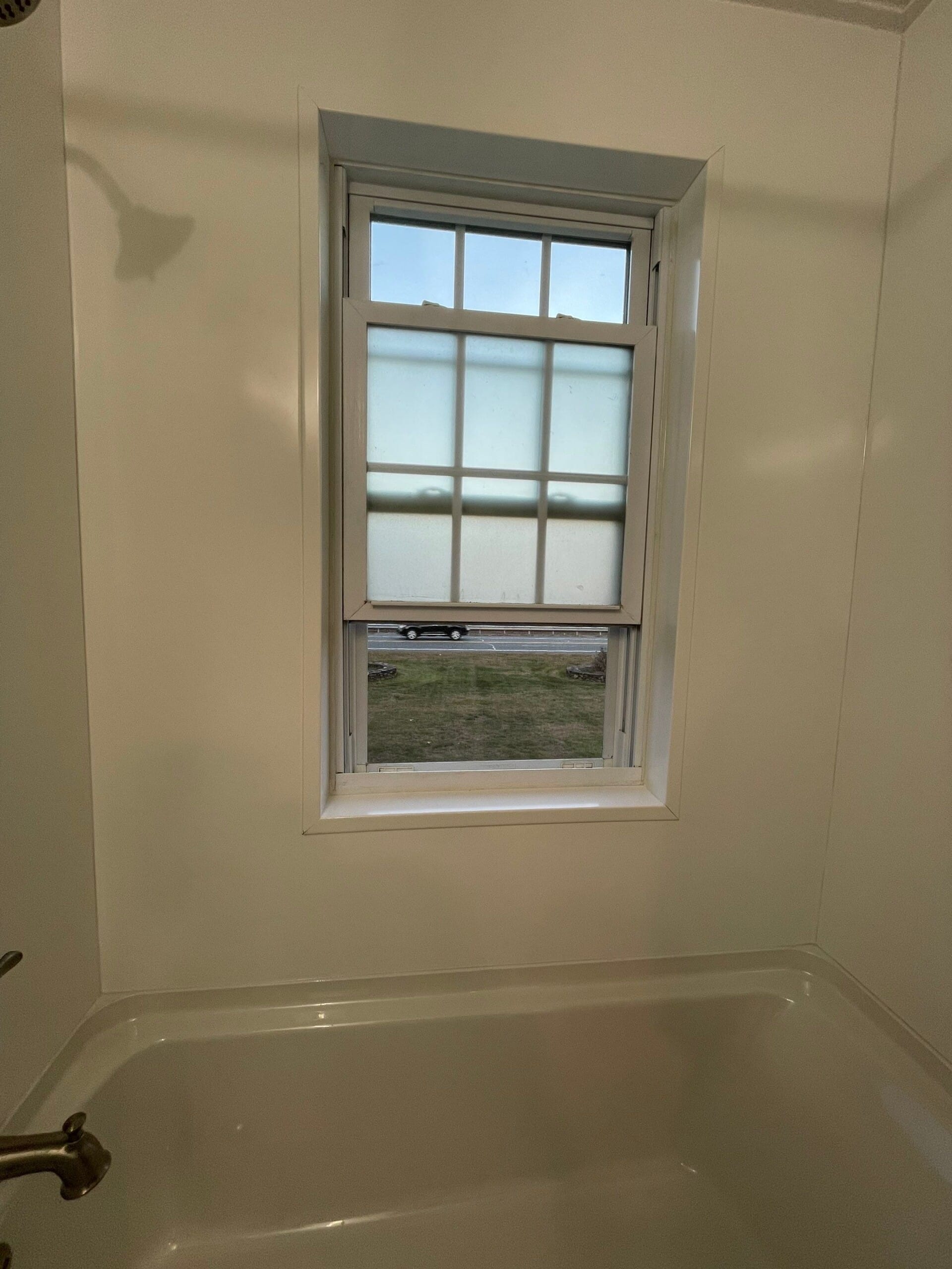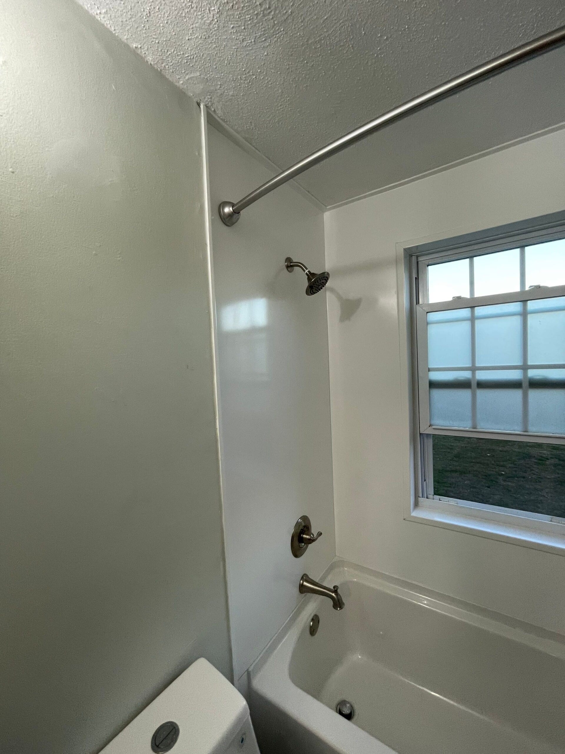 The final remodel maintained a standard bathtub configuration with an updated curved shower rod, brushed nickel fixtures, and full-height white composite wall panels surrounding the tub and window. The install included full demolition of the previous components and replacement of all plumbing up to the tub trim. The window was integrated into the wall system using custom-trimmed panels for a clean waterproof seal. The project was completed using the existing tub footprint and required no structural alterations to the bathroom layout.