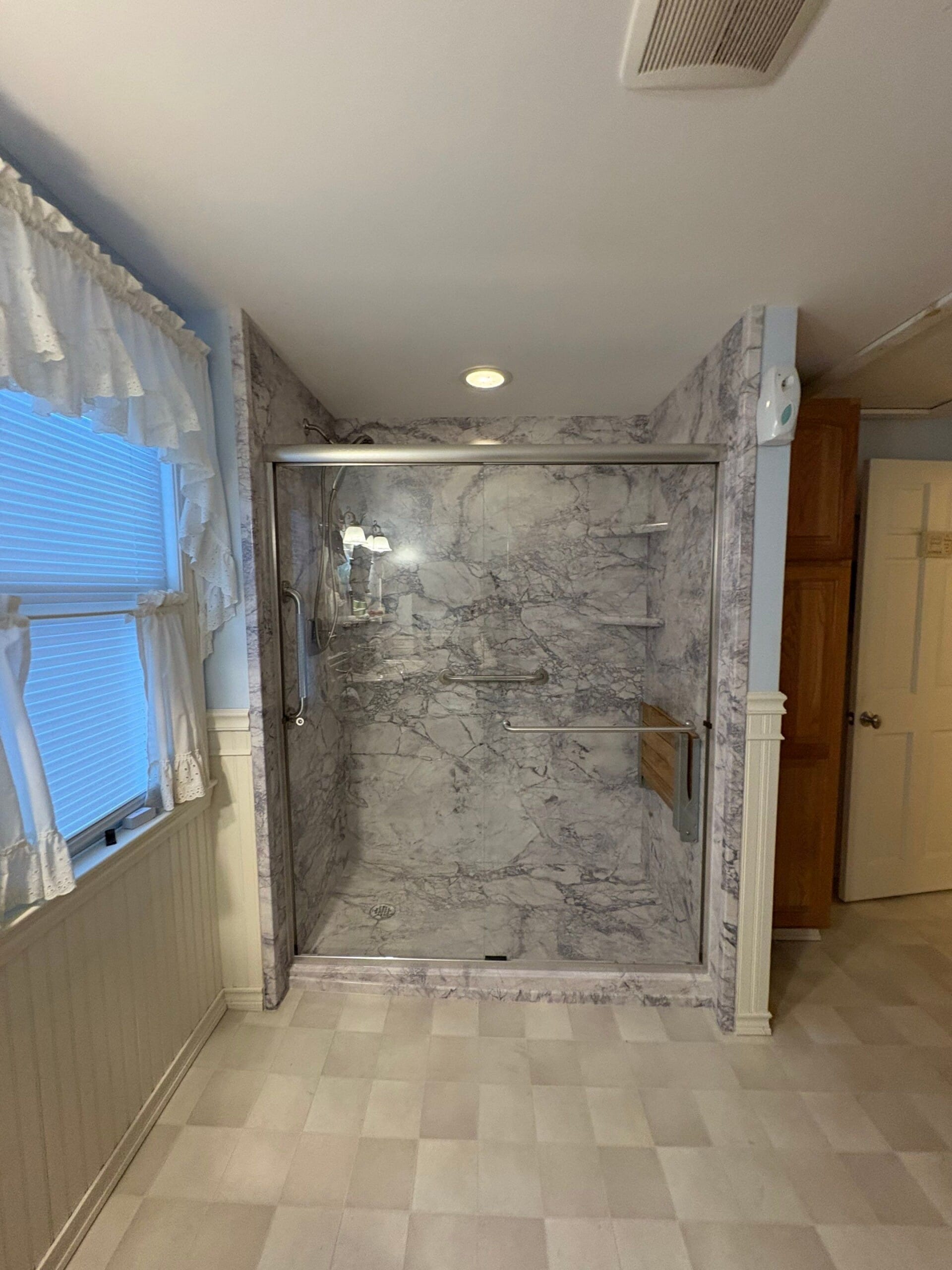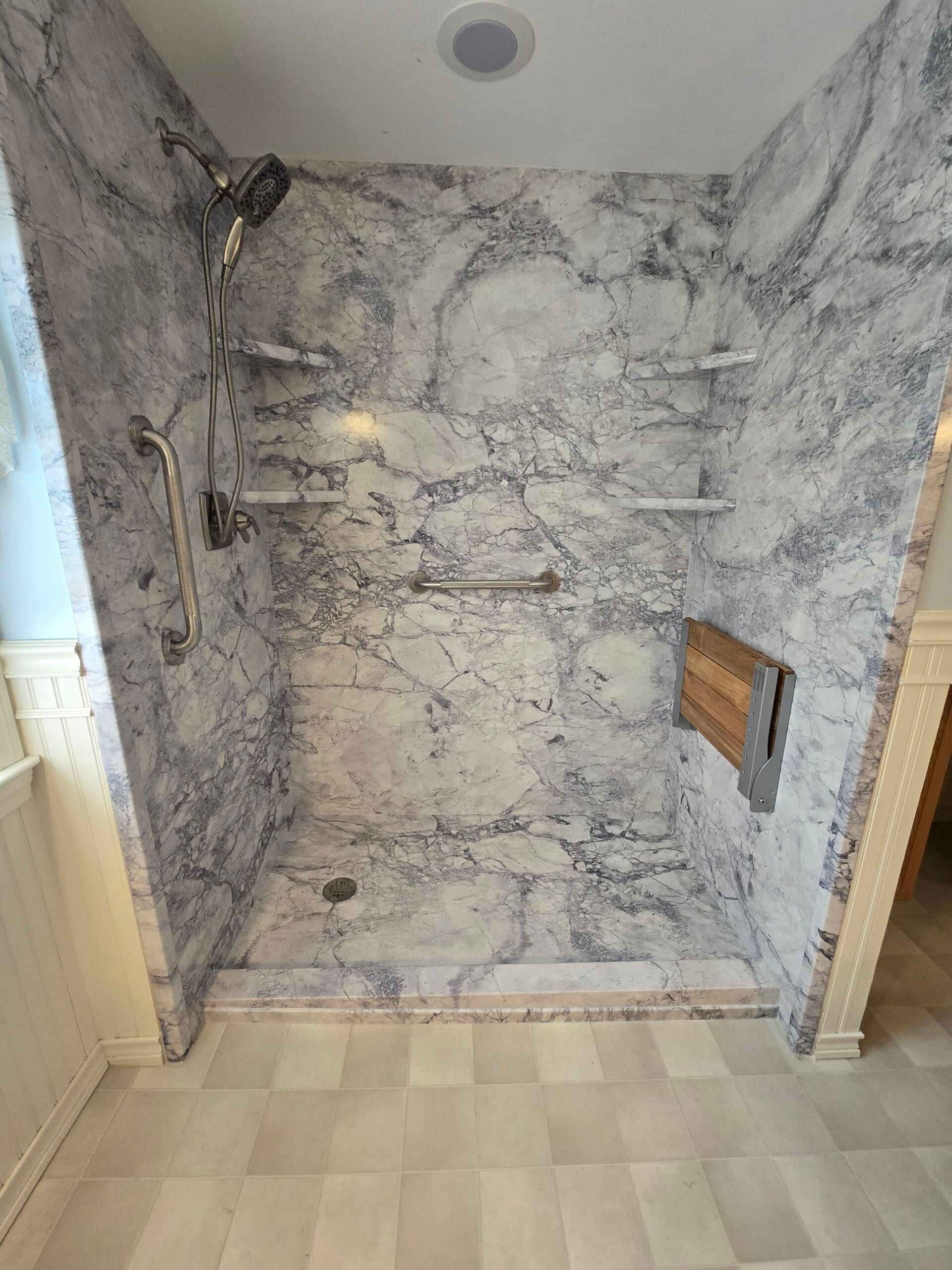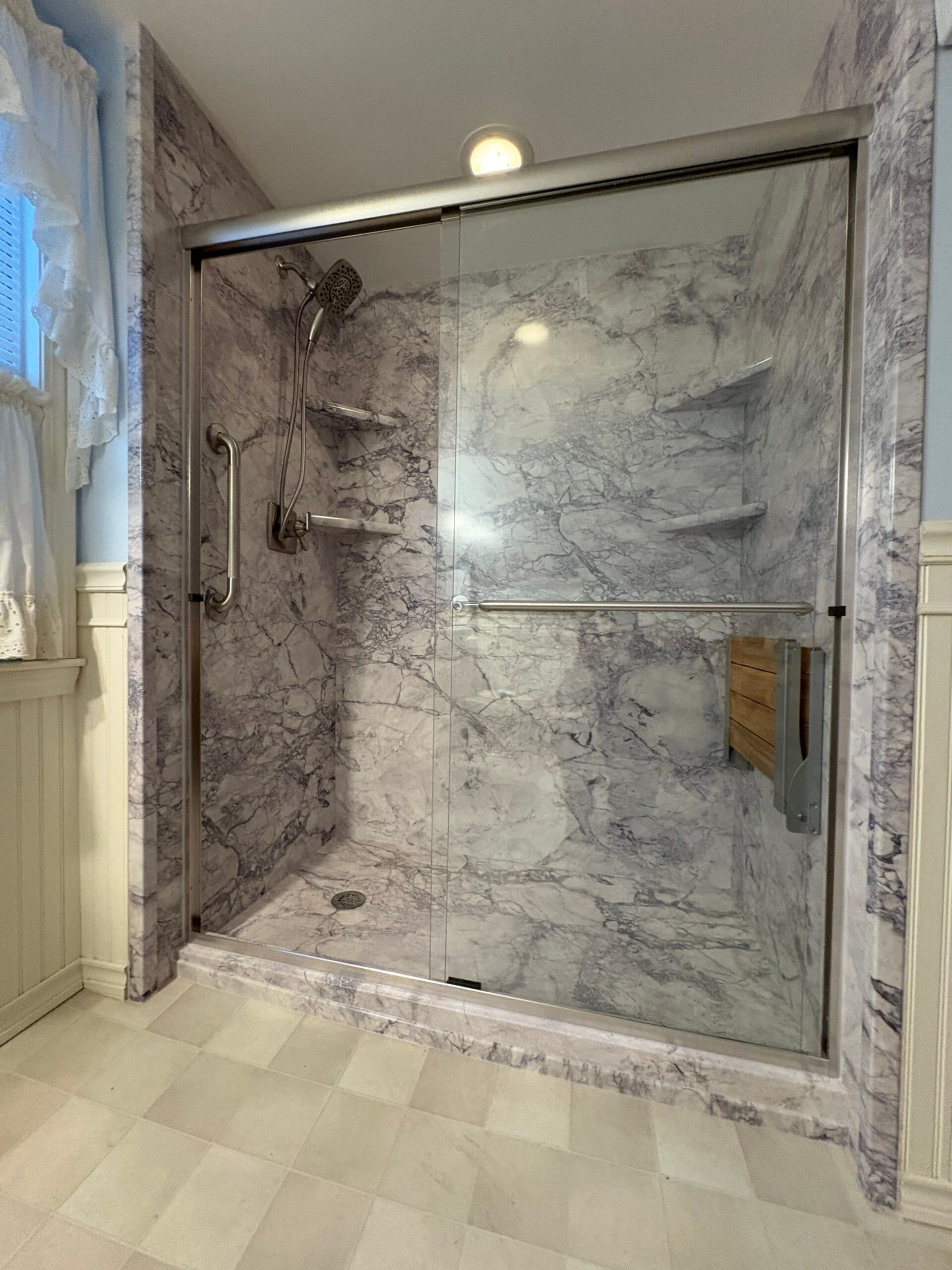 Installation involved a full demo of the existing tub and wall surround, replacement of plumbing components, and the application of waterproof backer board behind the new marble-patterned panels. A frameless glass door system was mounted to complete the enclosure, offering an open feel while preventing water overspray. All grab bars, bench, fixtures, and shelving were strategically installed for ease of use and code compliance. The project was completed with a rapid turnaround, accommodating pre-measured materials and staged inspections during the process.