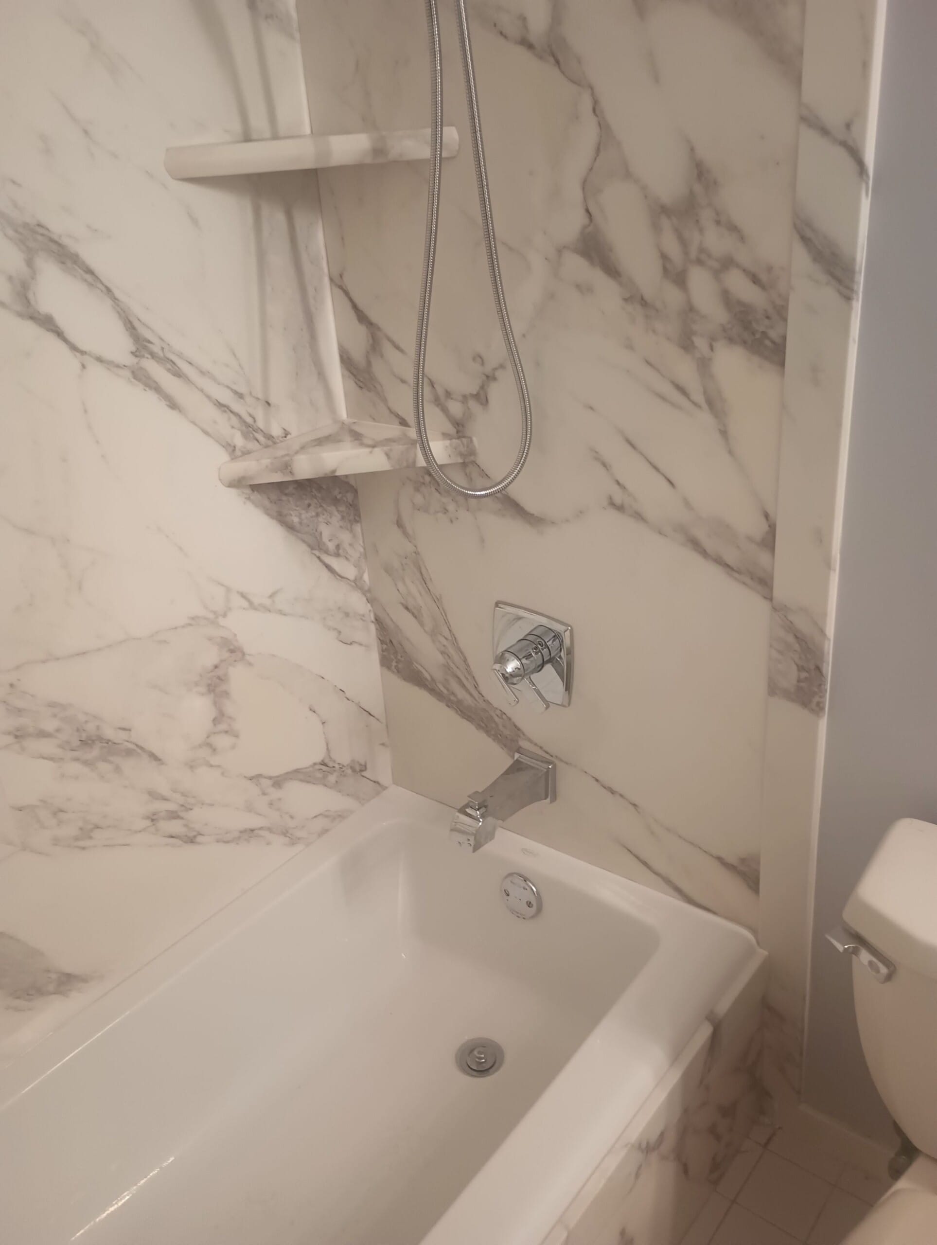 The Representative from Five Star Bath Solutions presented a grout-free wall system designed to eliminate maintenance issues associated with traditional tile while improving long-term durability. The updated design features large-format marble-pattern wall panels with a smooth, non-porous surface that resists moisture buildup. A modern chrome shower system with a handheld fixture was selected to enhance functionality, along with integrated corner shelving and a recessed wall niche for organized storage. The company’s bathroom-focused approach, combined with demonstrated licensing and insurance coverage, reinforced trust and confidence in the proposed solution.