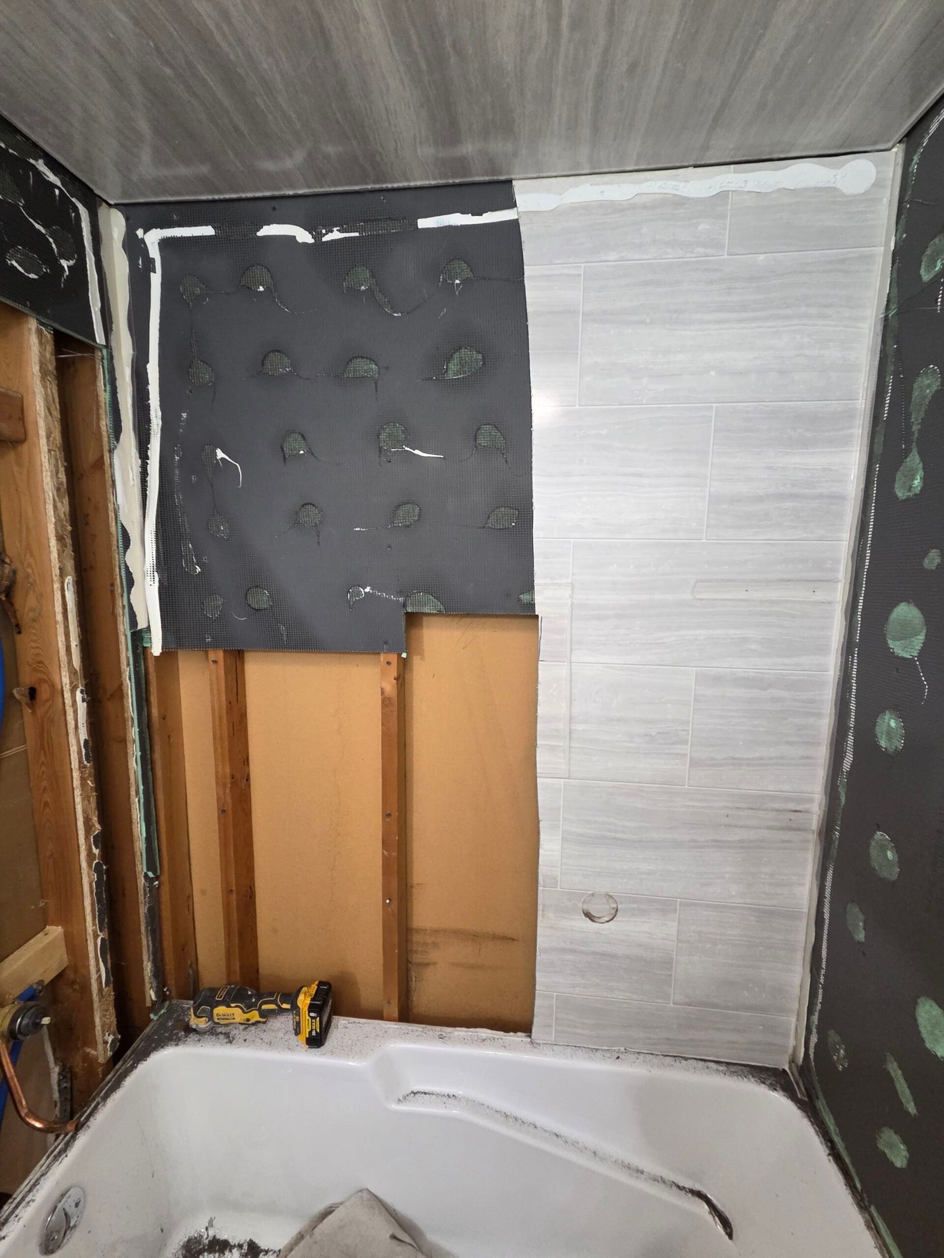 Installation began with removal of the existing tub and surrounding materials to allow inspection of the framing and plumbing systems. Any underlying conditions were addressed before installation of new waterproof backing materials and upgraded plumbing components. The crew then installed the new deep soaking tub, composite wall panels, storage features, and shower fixtures before sealing all joints with antimicrobial silicone. Floor protection and debris removal were maintained throughout the process, and the installation was completed within approximately two to three days followed by a short curing period before the bathing area was ready for use.