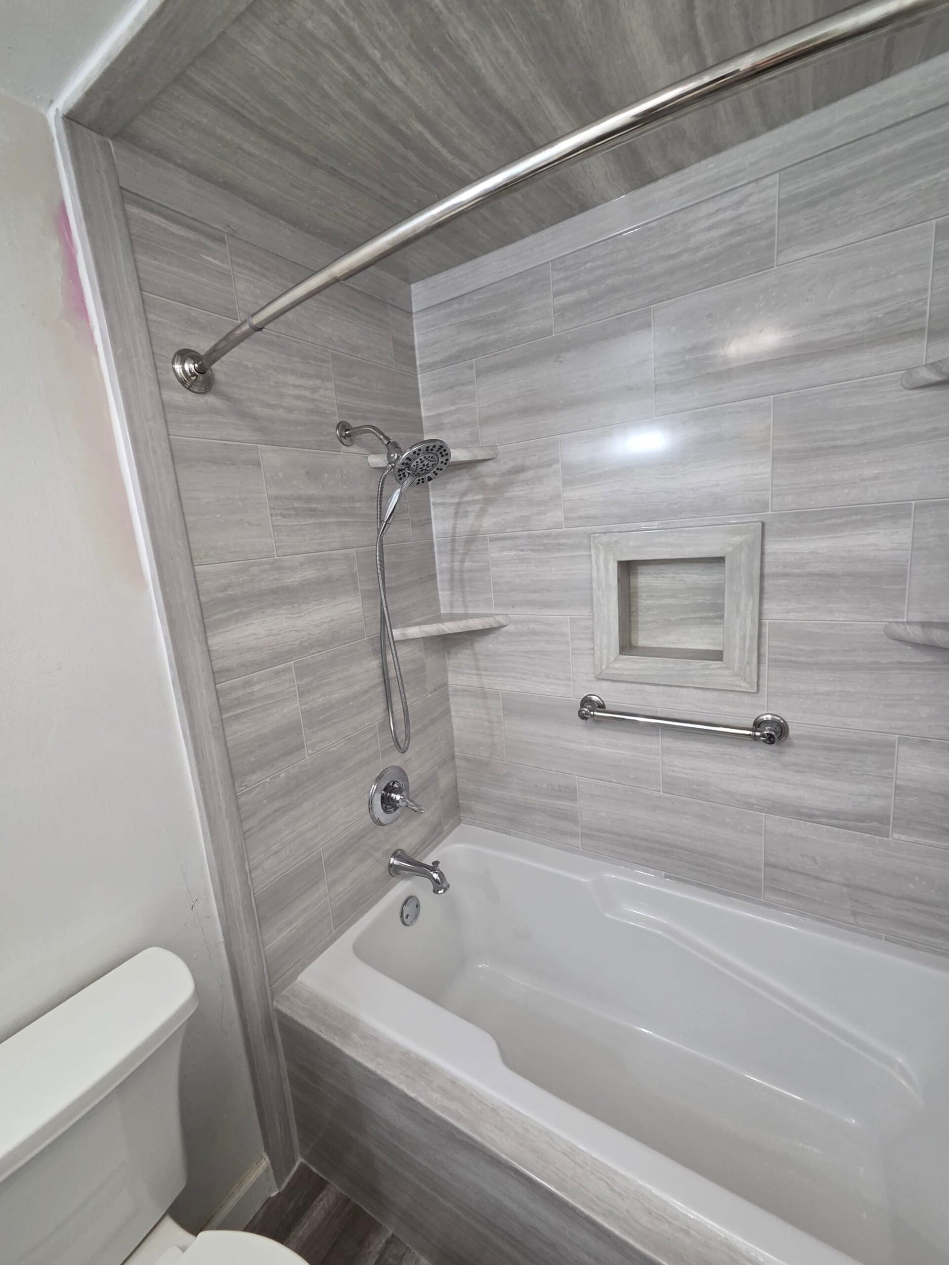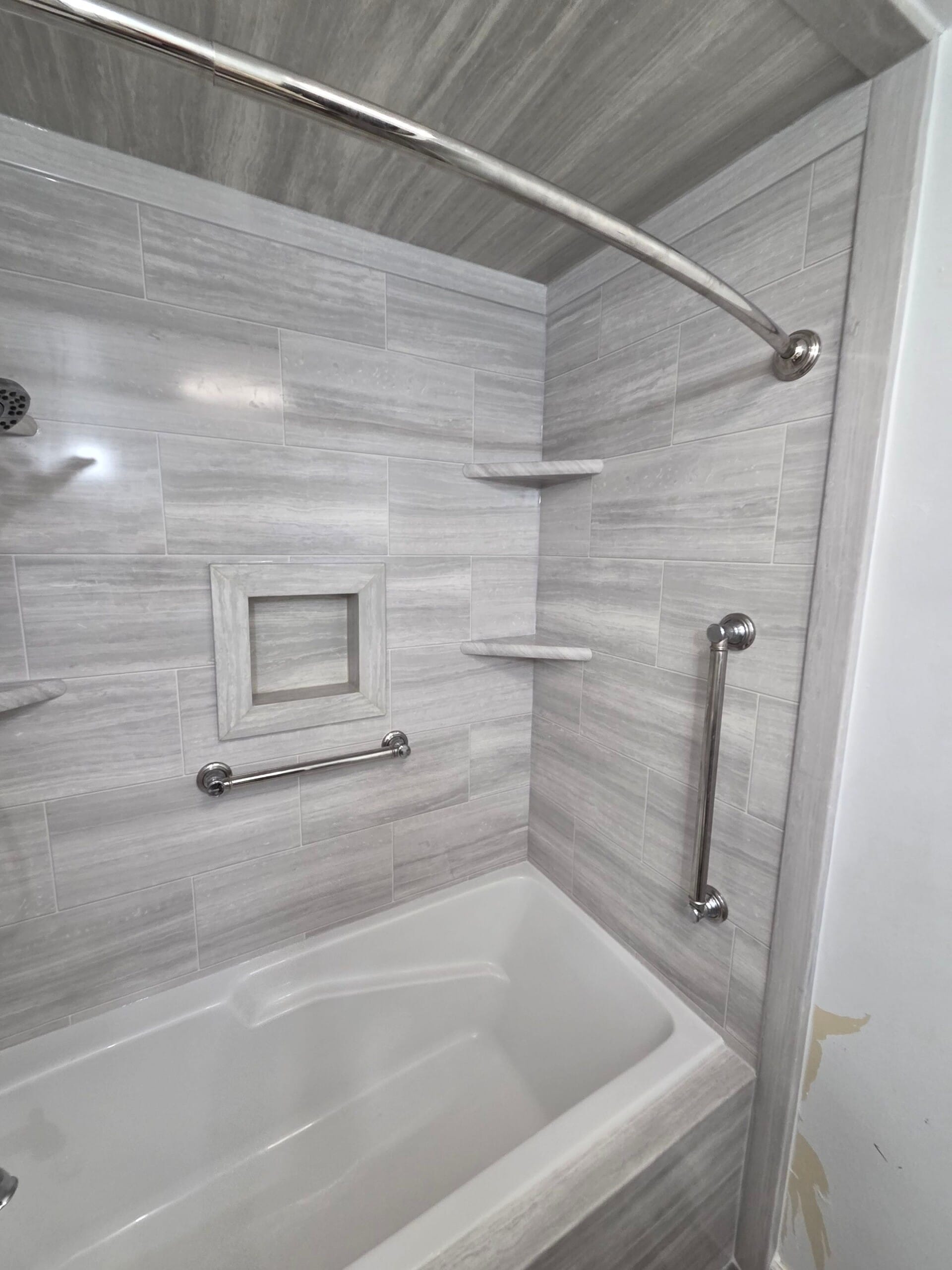 A Five Star Bath Solutions Representative presented a grout free composite wall system designed to improve durability and reduce maintenance compared to traditional tile installations. The selected wall system features gray stone inspired panels with integrated corner shelving and a recessed storage niche for additional organization. Polished chrome plumbing fixtures and a handheld shower system were incorporated to provide both comfort and flexibility during bathing. The Representative explained the company focus on bathroom remodeling and wet area renovations, supported by trained installers and consistent installation practices that help ensure reliable results and long term performance.