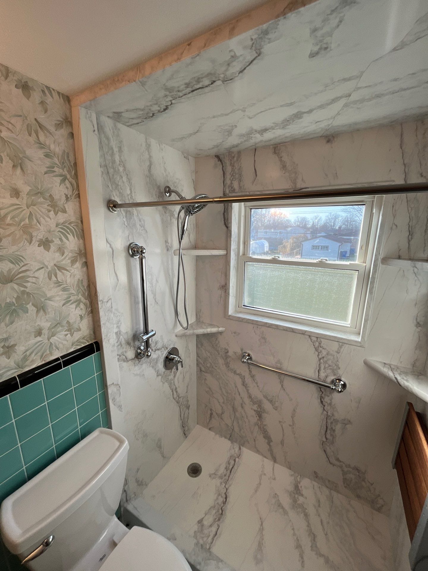 Installation involved full demolition of the existing shower area, removal of the original green board, and replacement with mold-resistant synthetic backer board. Composite walls were cut to size and installed floor to ceiling, surrounding a low-threshold base with a slip-resistant coating. Plumbing was upgraded with PEX lines, and the handheld unit was positioned for seated or standing use. Installation was completed in one day, with a 24-hour cure time. The design was verified using 3D rendering and samples provided prior to the build, and additional access through a basement storm shelter allowed for plumbing efficiency.