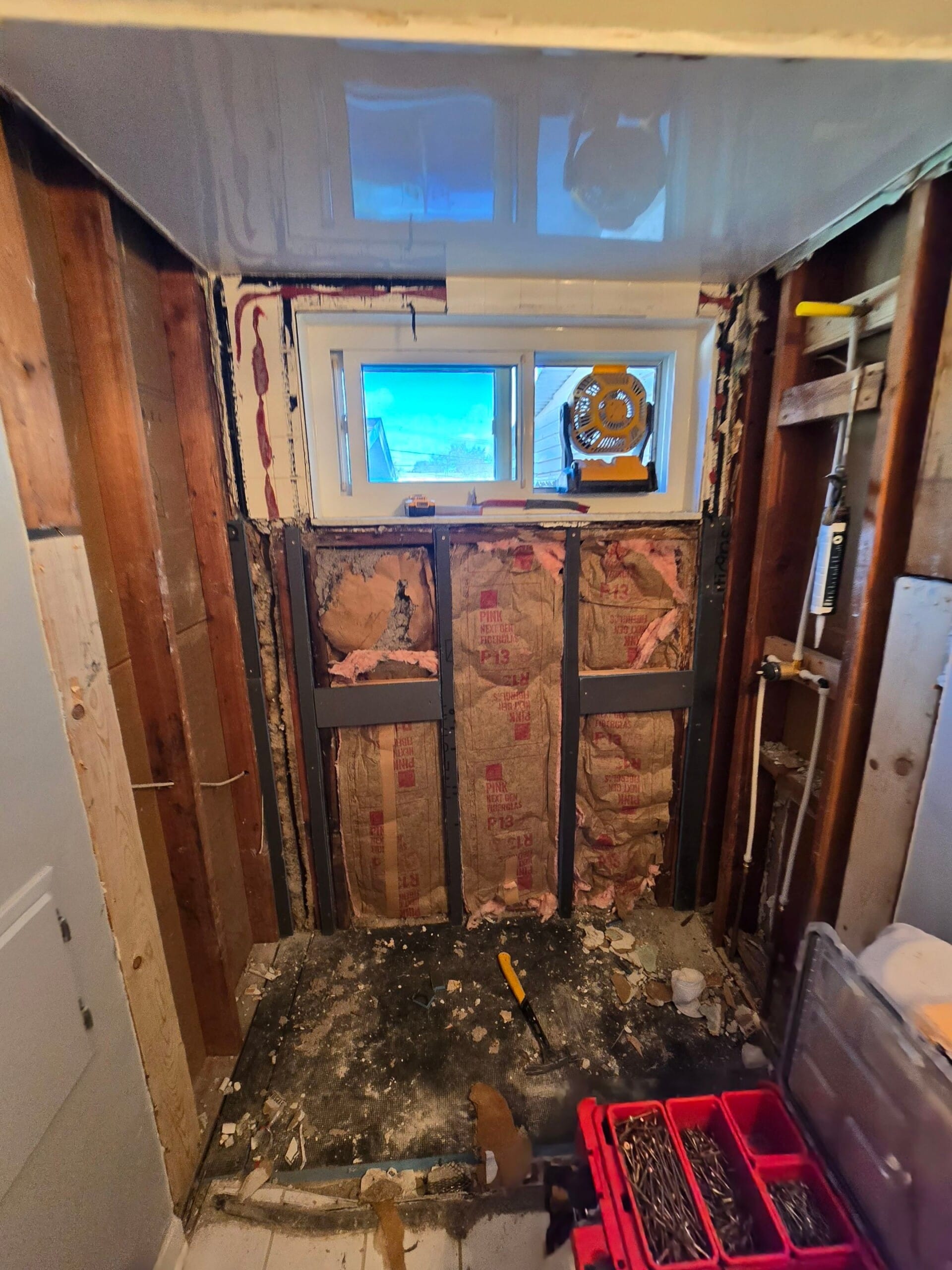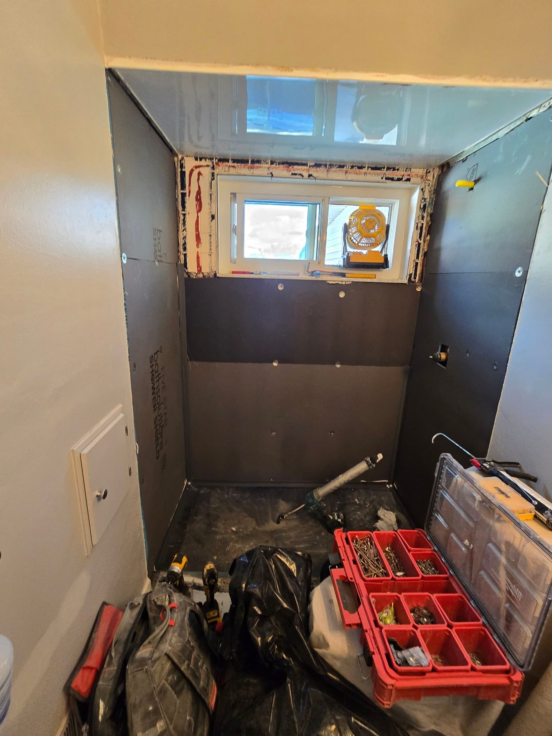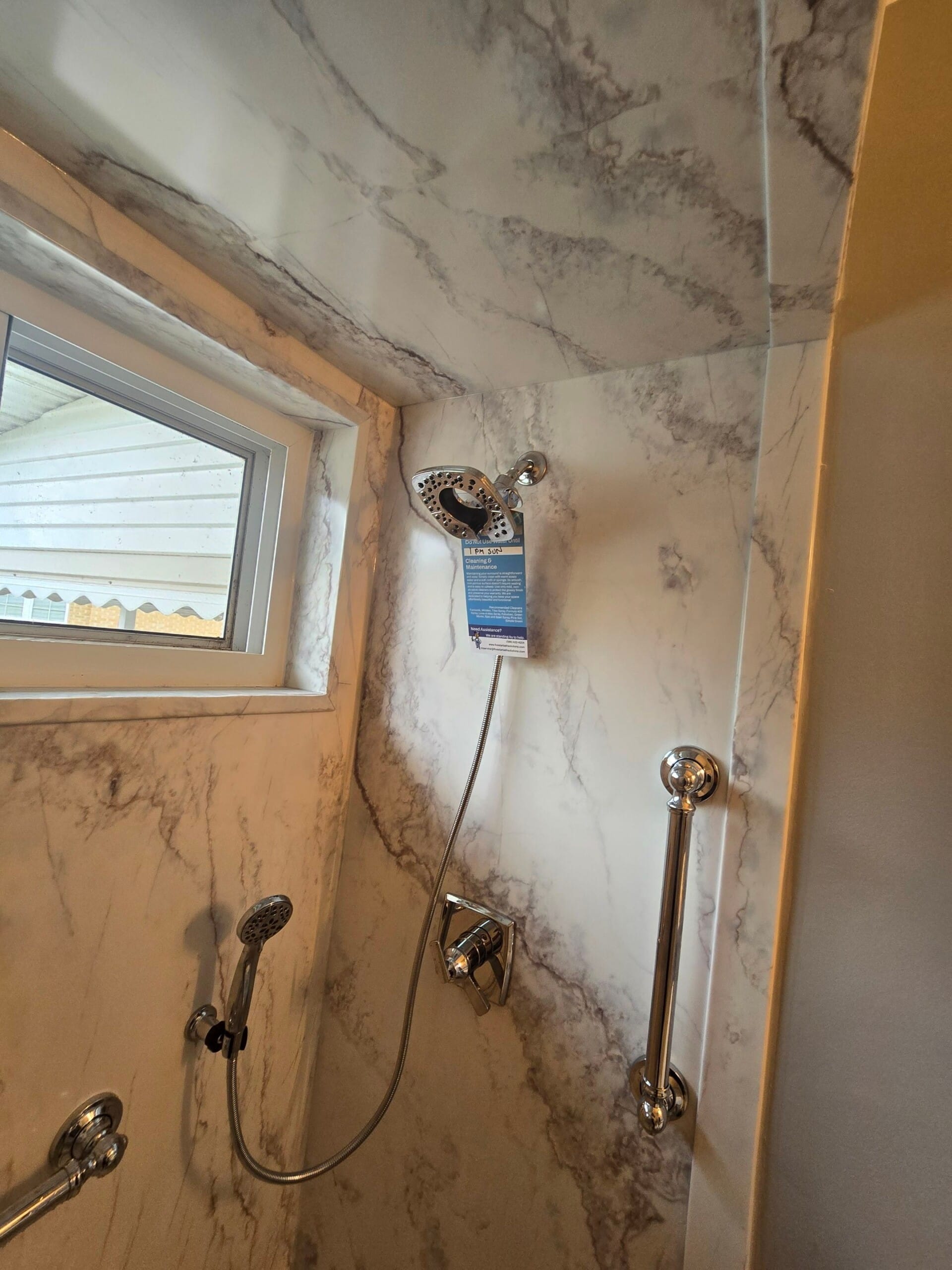 Installation was completed in one day with full demolition shown in progress during the initial tile and backerboard removal phase. Wall studs and plumbing were exposed before installation of the mold-resistant synthetic backer board. A composite shower base was installed flush to the floor to eliminate flex, and PEX plumbing replaced outdated copper lines. The angled ceiling and lower window ledge were fully encased in composite, and marine-grade sealants were applied throughout. Structural reinforcements were included under the company’s no surprise guarantee.