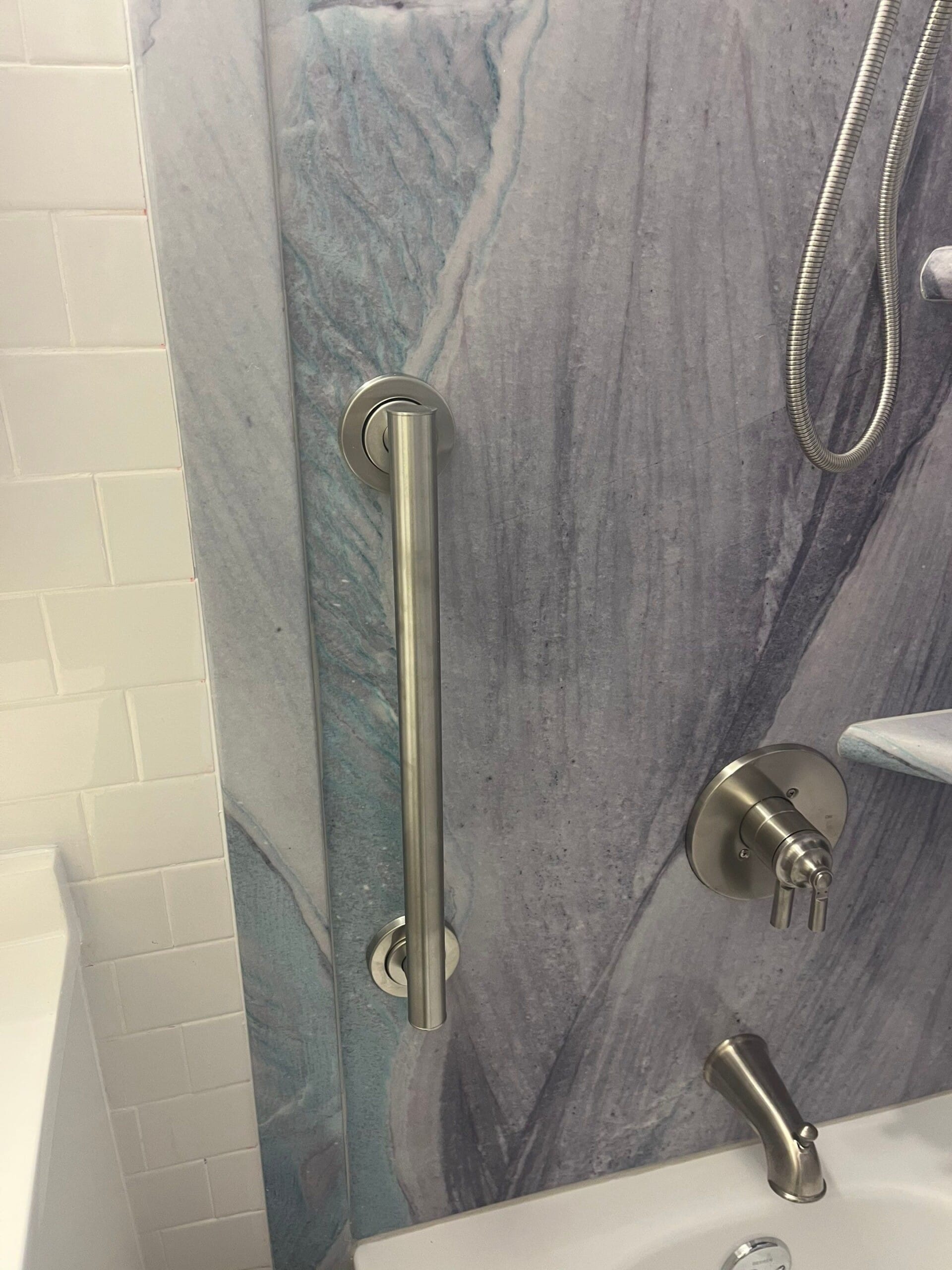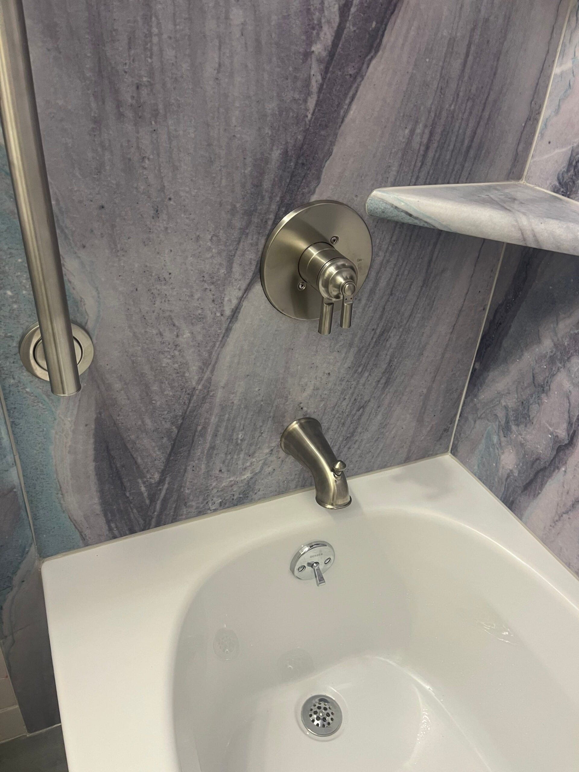 Installation involved a comprehensive demolition of the existing space down to the studs to ensure structural integrity. The crew applied a double waterproofing layer before installing the new composite wall panels and bathtub. Finishes such as brushed nickel fixtures and integrated corner shelving were added to enhance functionality. The site was protected throughout the process, and the final walkthrough ensured every element met the company's rigorous quality standards.
