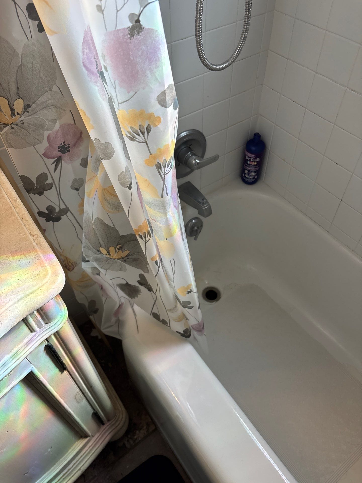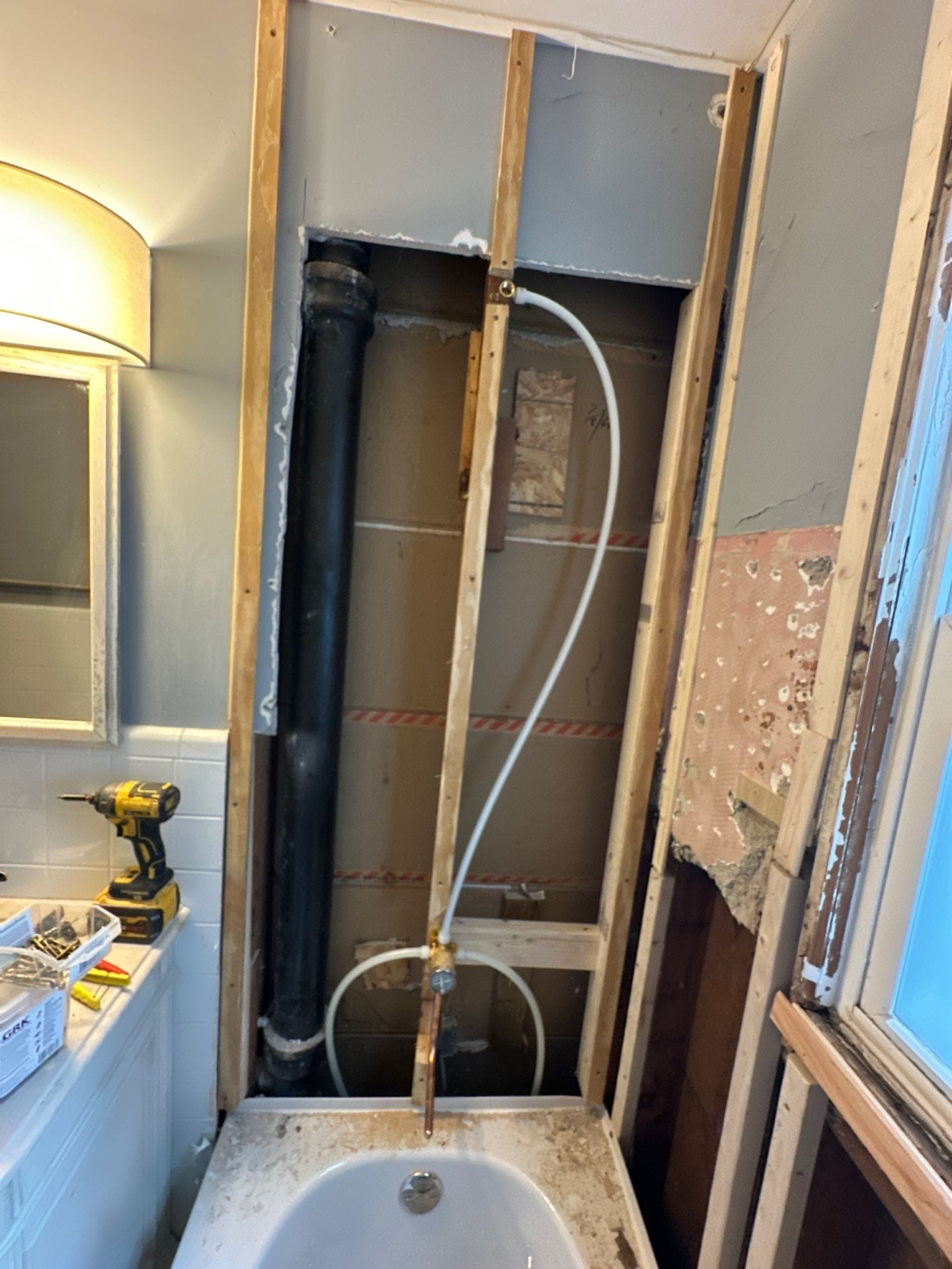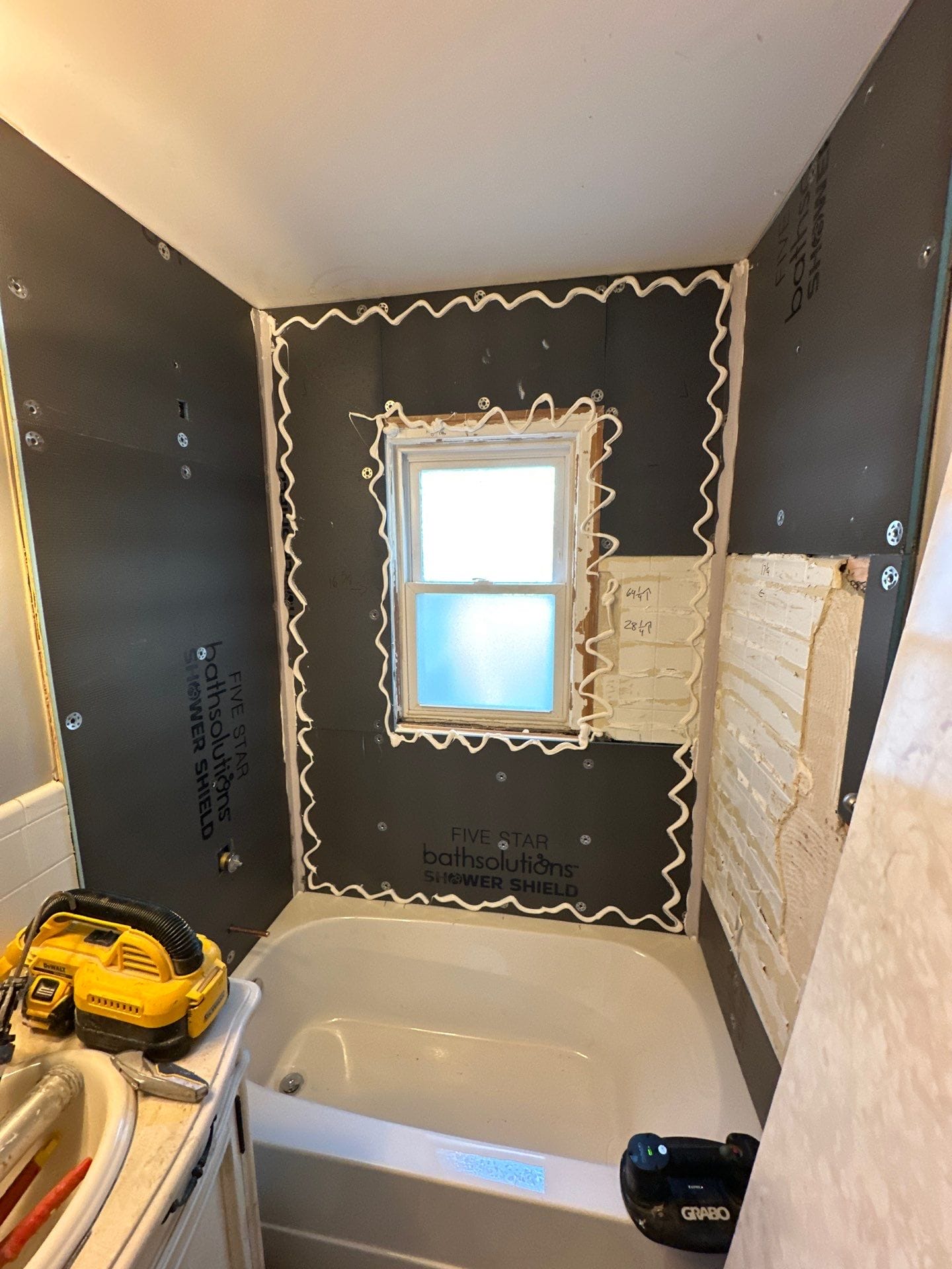 Ted, the Five Star Bath Solutions representative, explained that tile was not used due to long-term moisture risks. Instead, the new installation includes a dry lock board behind the wall panels, which acts as a foam and concrete barrier against mold. The process involved full demolition down to the studs, including inspection and remediation of any water damage. New plumbing lines and a diverter were added to ensure reliable drainage and temperature control.