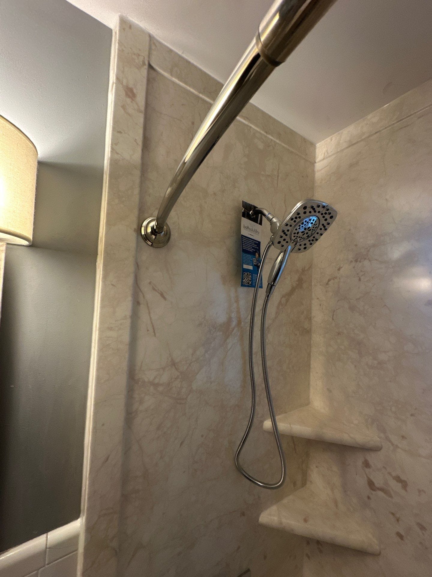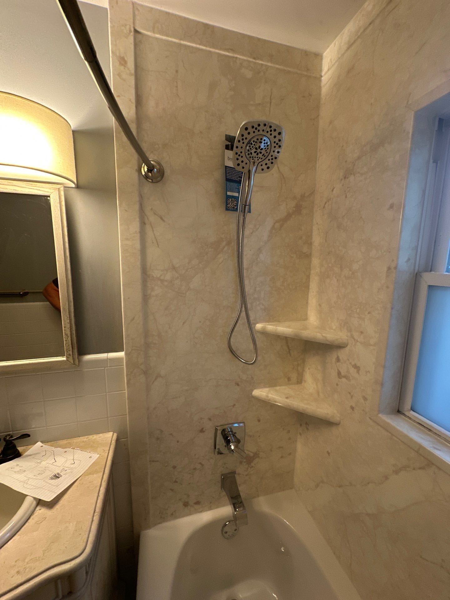The waterproof composite walls use a six-layer system resistant to mold, scratches, and bacteria buildup. Wall panels were trimmed and sealed cleanly around the window and fixtures. The new Delta handheld shower head provides temperature precision and increased reach. Safety features such as grab bars or seating were not visibly added in the final install.