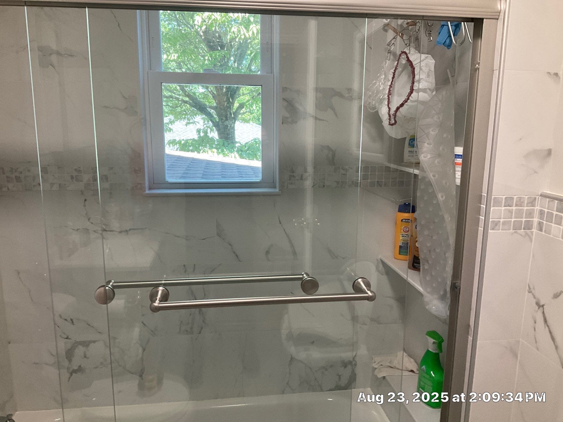 * Frameless brushed nickel sliding glass shower door