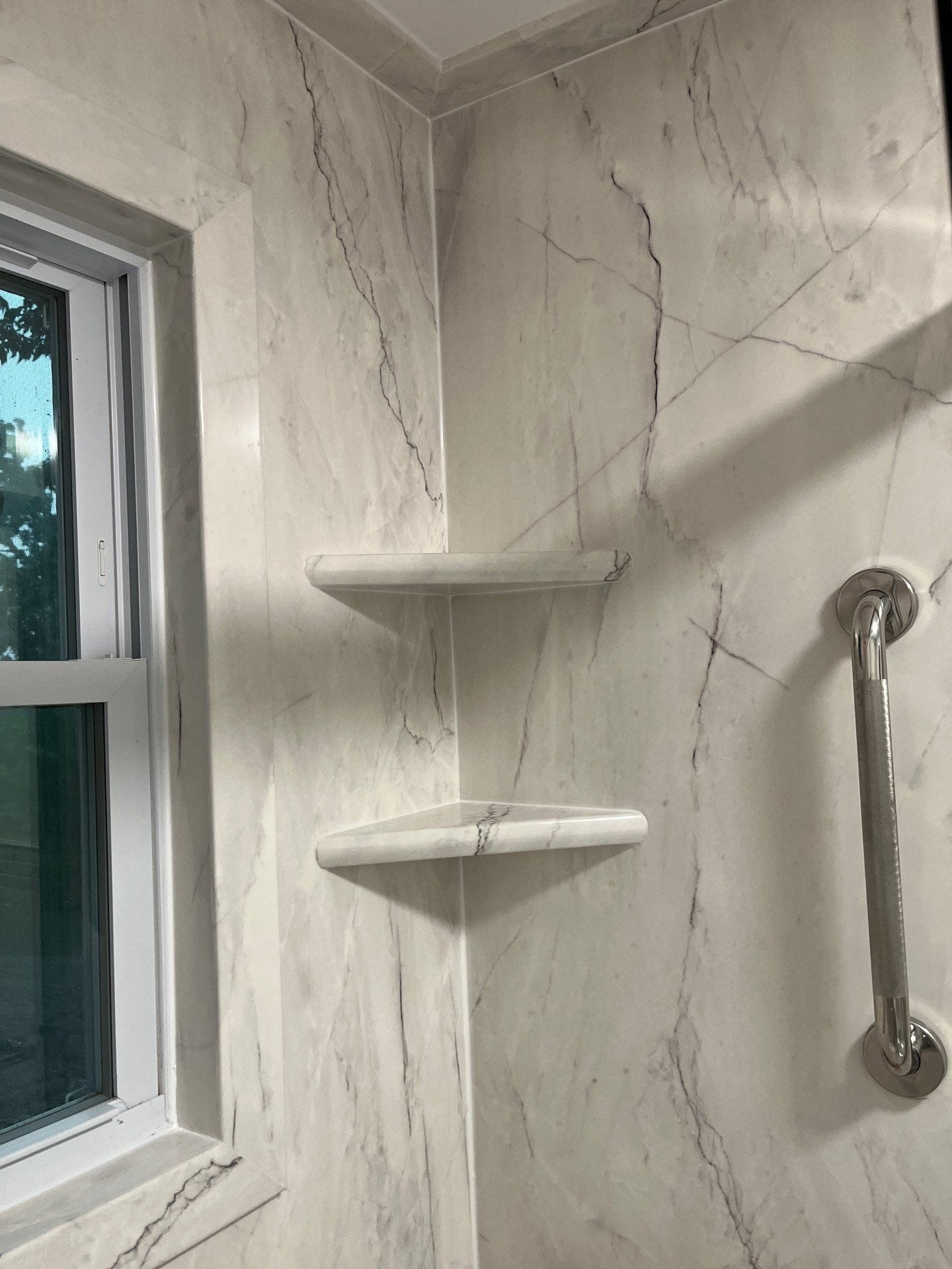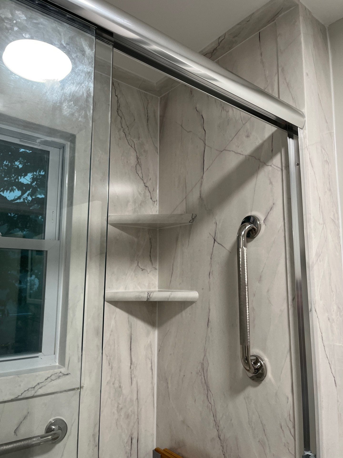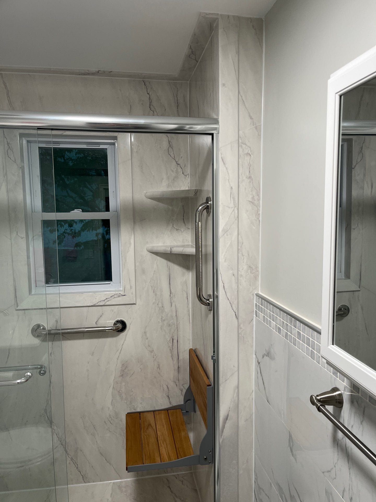 Installation was planned over a two-day timeline, allowing flexibility for unforeseen structural issues though none were detected during the moisture scan. The crew removed the existing jacuzzi, inspected framing, and installed a new low-threshold pan, composite wall system, and dual showerhead configuration. A handheld wand on a slide bar provided targeted water delivery, while an overhead rain-style fixture elevated the experience. Two corner shelves and a fold-down teak bench were included for convenience. All work was performed by fully vetted, professionally trained installers, and coordination with electricians or other trades was prepared in advance if needed.