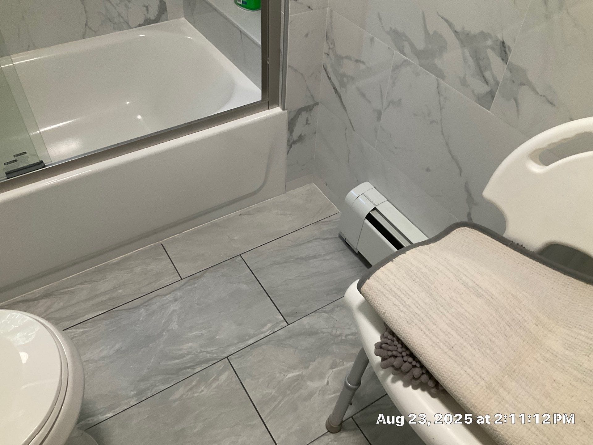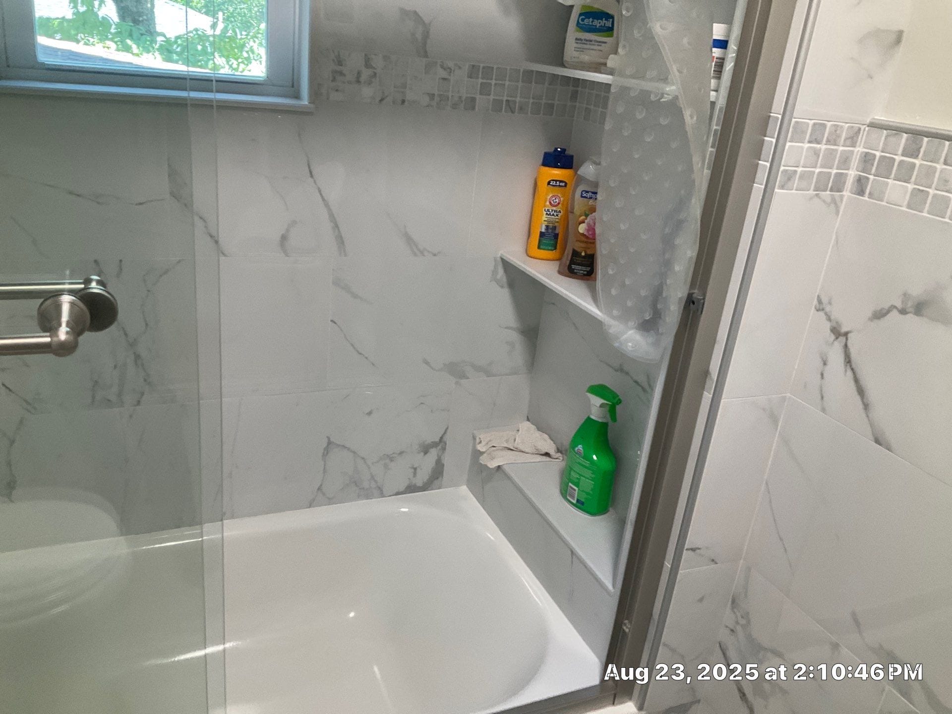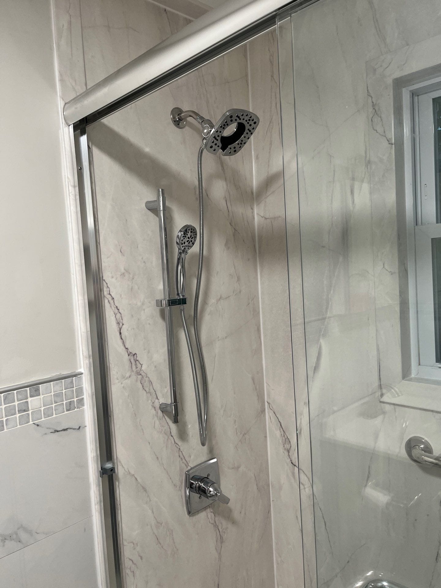 Installation was planned over a two-day timeline, allowing flexibility for unforeseen structural issues though none were detected during the moisture scan. The crew removed the existing jacuzzi, inspected framing, and installed a new low-threshold pan, composite wall system, and dual showerhead configuration. A handheld wand on a slide bar provided targeted water delivery, while an overhead rain-style fixture elevated the experience. Two corner shelves and a fold-down teak bench were included for convenience. All work was performed by fully vetted, professionally trained installers, and coordination with electricians or other trades was prepared in advance if needed.