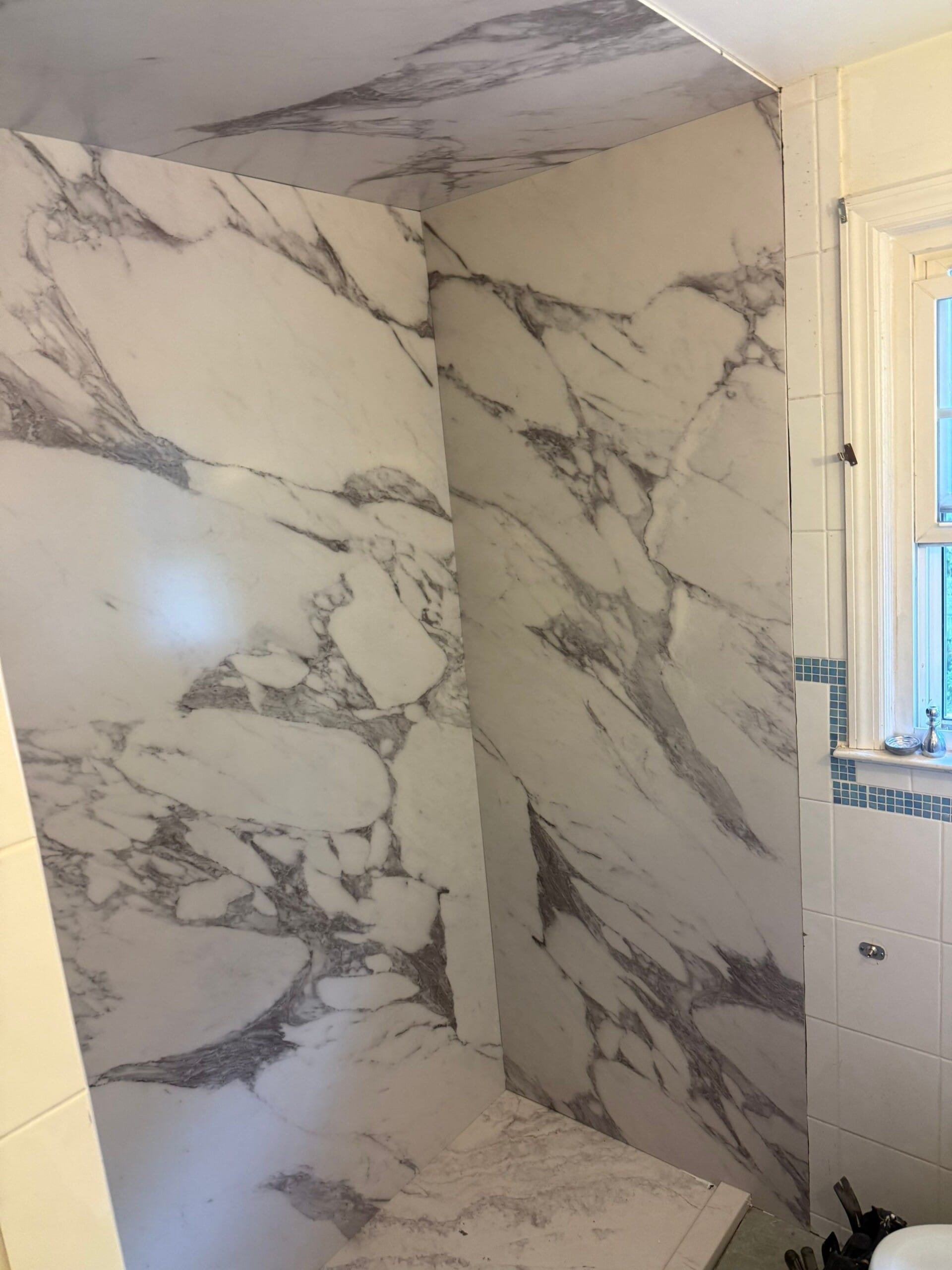 Selected finishes include a Smart Choice composite wall system with a high-contrast Calacatta-style marble appearance wrapping full height and ceiling, offering a luxurious and bright upgrade over the original white square tile and blue glass mosaic accent strip. The system was paired with matte black Delta Commercial fixtures, including a wall-mounted rain-style showerhead and a handheld wand. The final configuration also includes a floating corner bench and two integrated corner shelves in matching composite material, while all visual clutter was eliminated through the grout-free, seamless surface design.