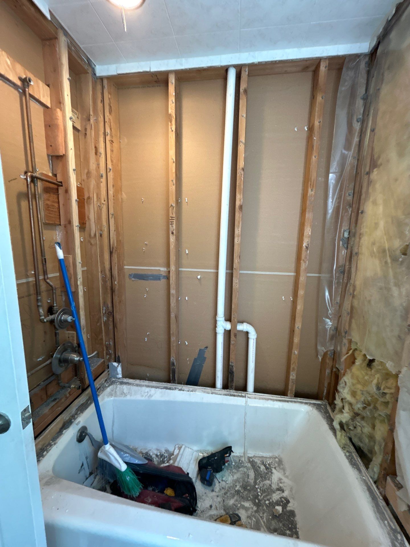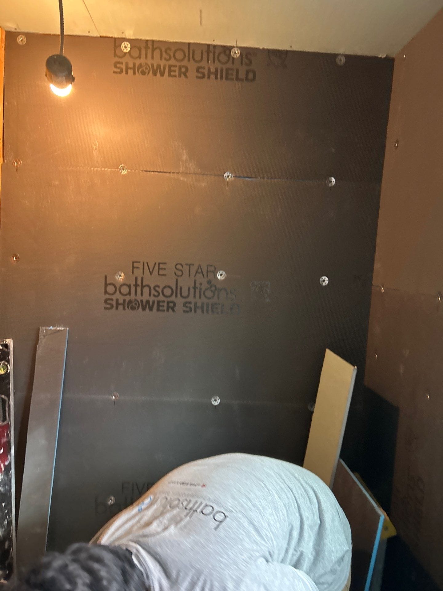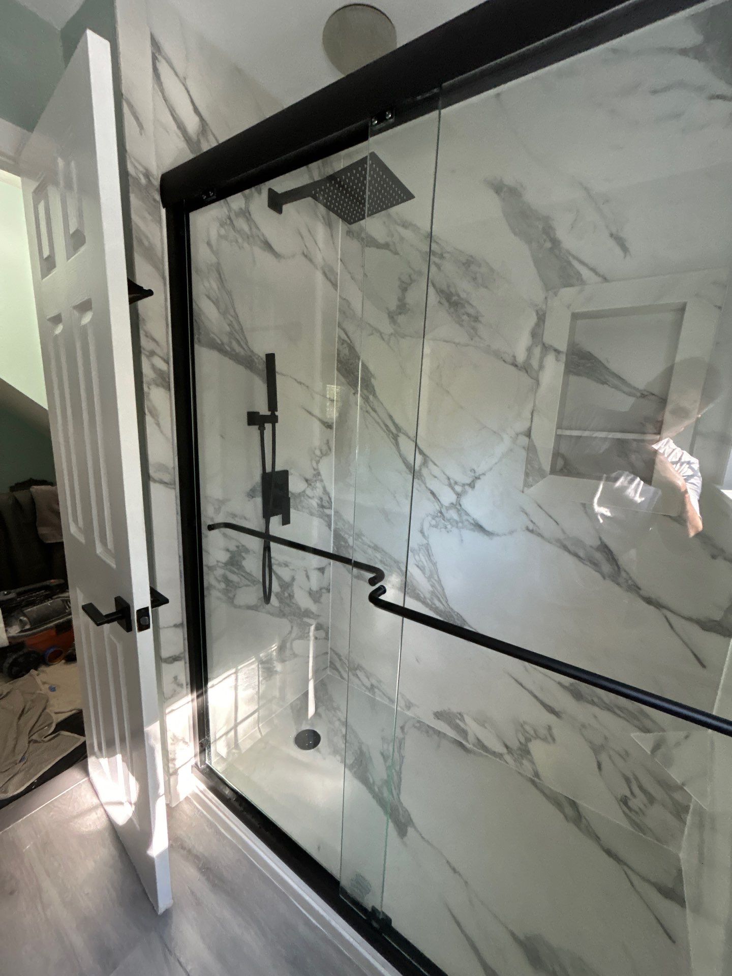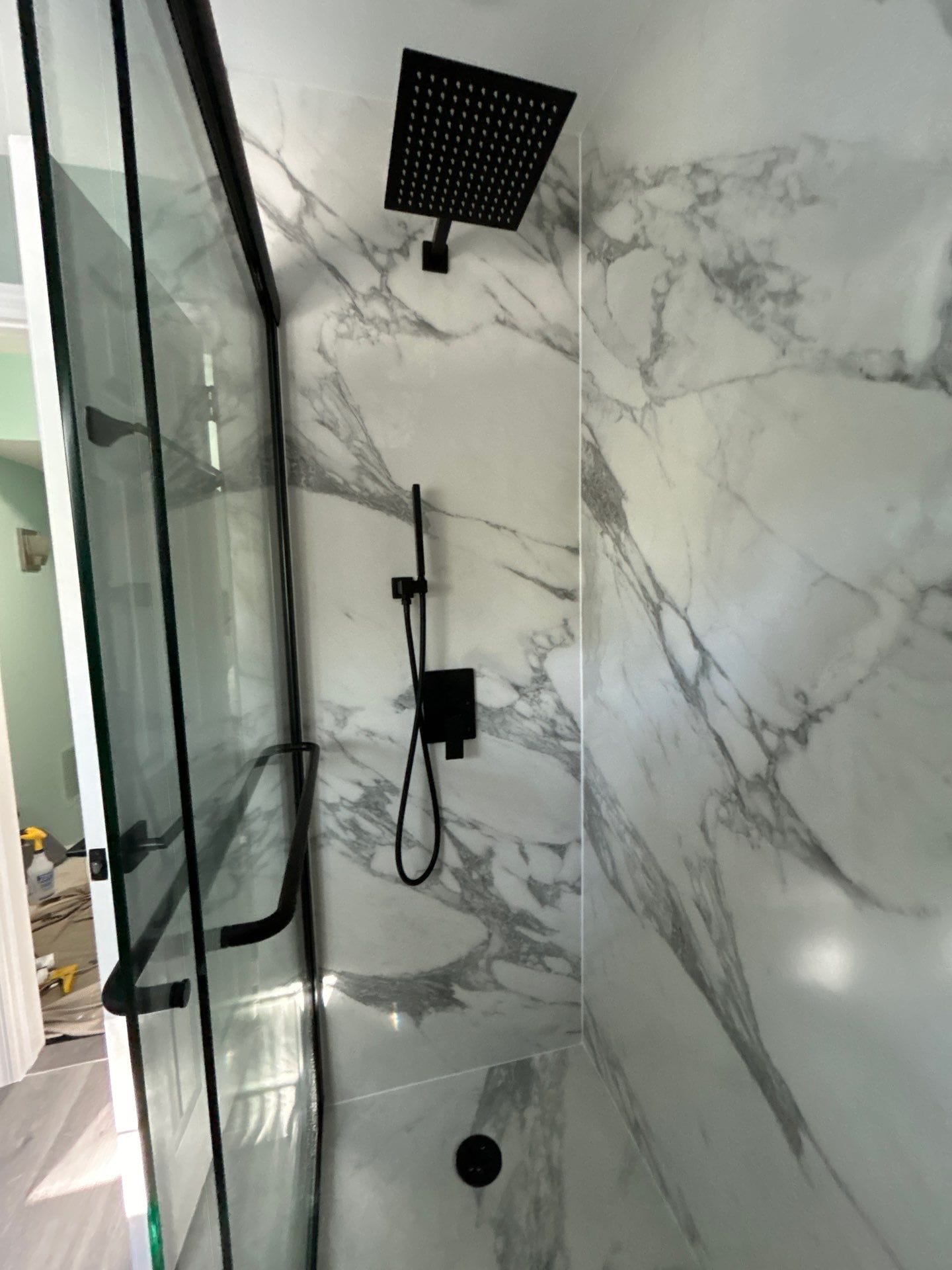 Installation was scheduled to be completed in two days, with the space usable by the following day. Crews removed the original tub and wall system, installed waterproof backer board, laid the low-threshold shower base, mounted a rain-style square showerhead and handheld sprayer in matte black, and secured a built-in wall niche for storage. The project included complete demolition to the studs and subfloor, backed grab bar supports, and area protection throughout. The smart choice package used “Shower Shield,” a non-organic, waterproof backer board designed to prevent mold and structural issues.