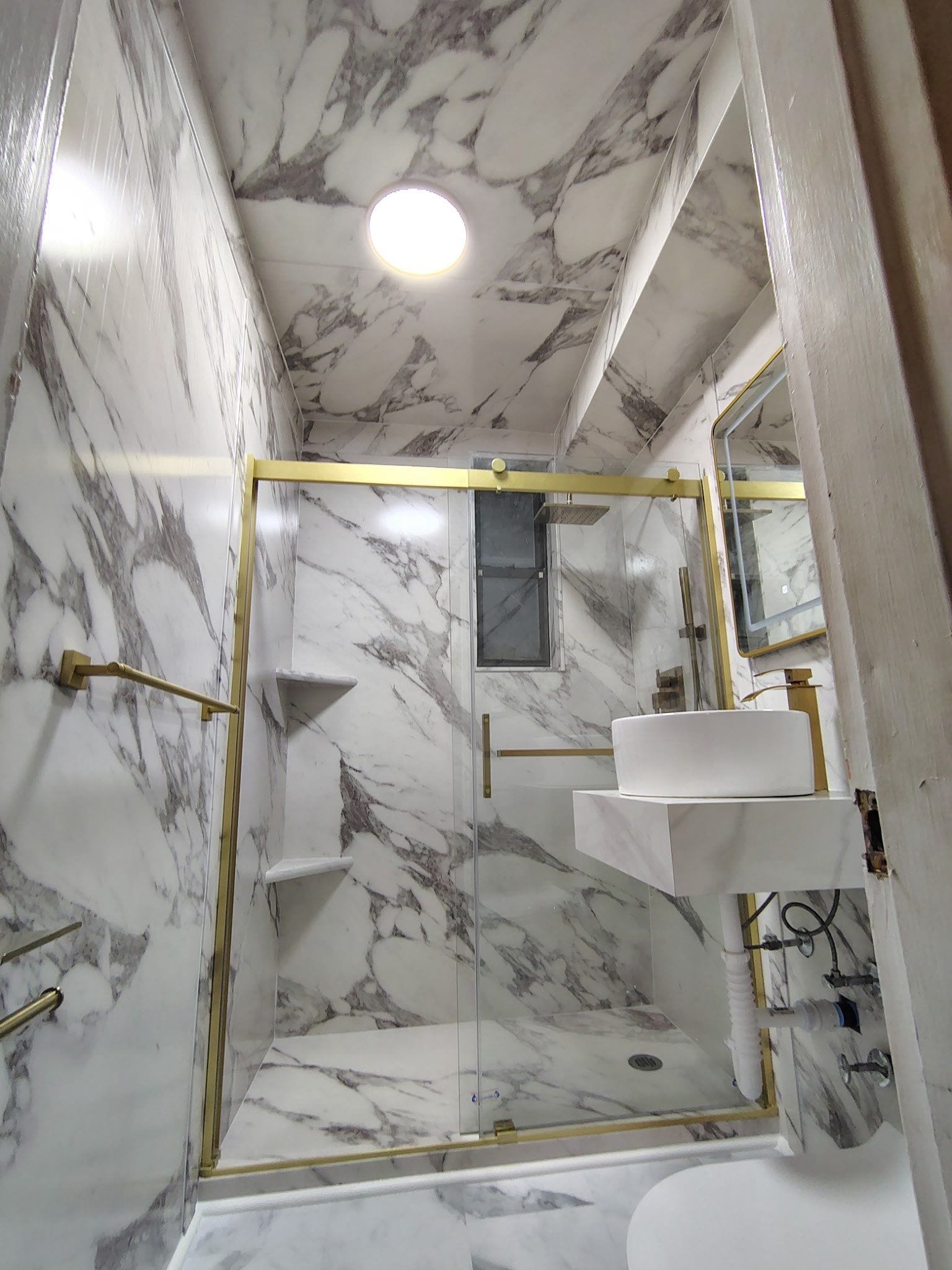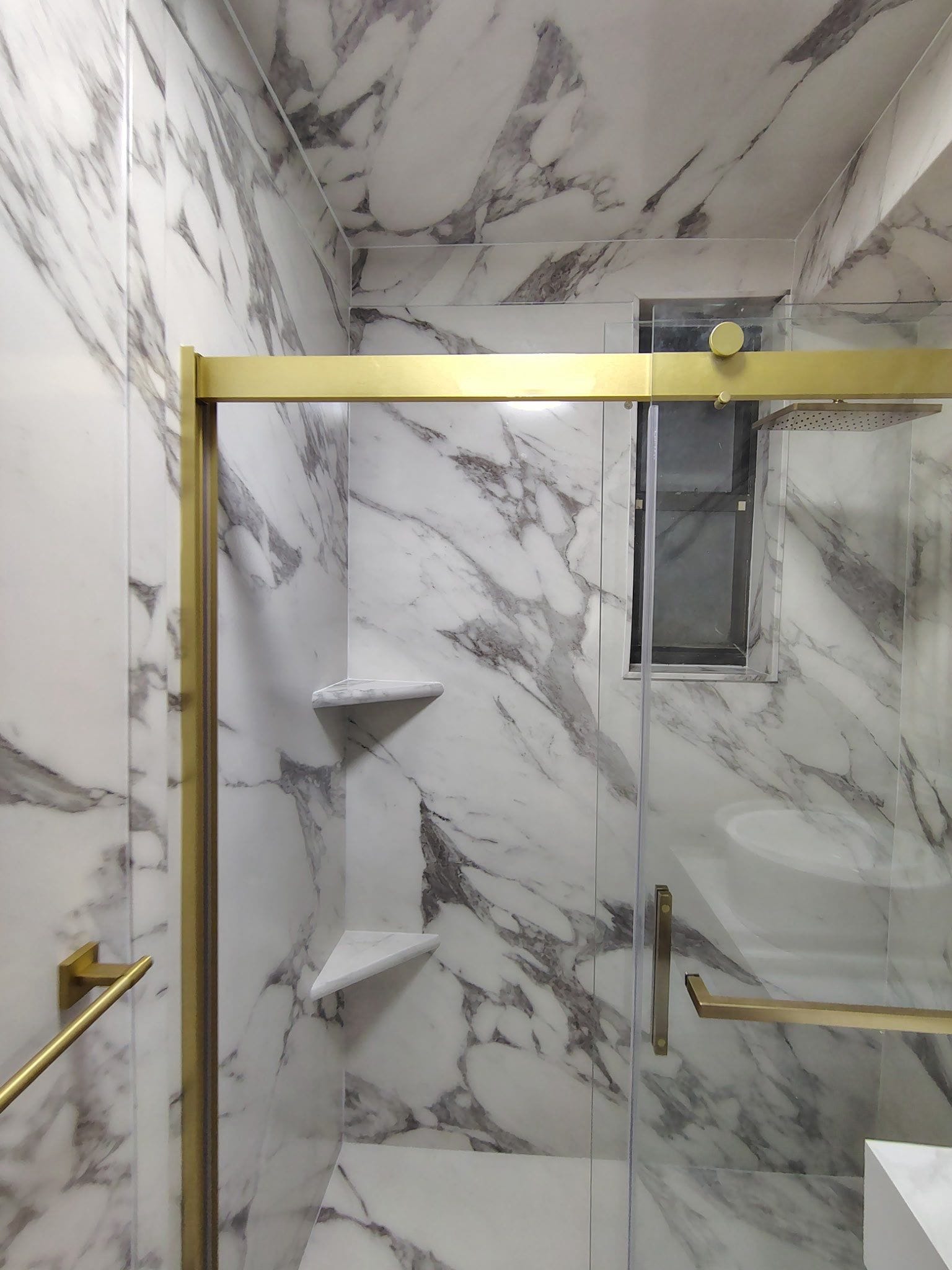 Installation began with full demolition to the studs, followed by assessment for mold or structural damage. Composite wall panels in a high-contrast white and gray marble finish were installed across all walls and ceiling, visually expanding the narrow space. A walk-in shower base with a low threshold was paired with a double-bypass glass sliding door framed in brushed gold. Brushed gold hardware and grab bars were installed consistently across fixtures, including the showerhead, faucet, towel bars, and mirror trim. The LVP flooring, also in a white marble pattern, created a cohesive, high-end visual throughout the room.