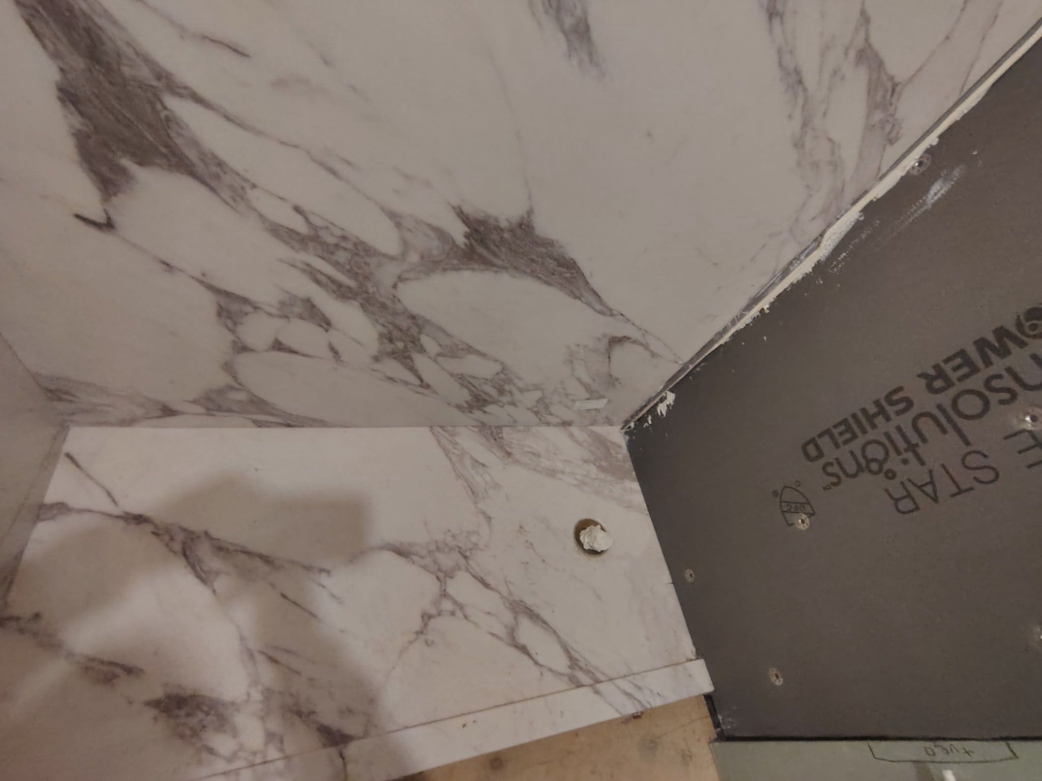 * Floor-to-ceiling marble-look panels with ceiling wrap